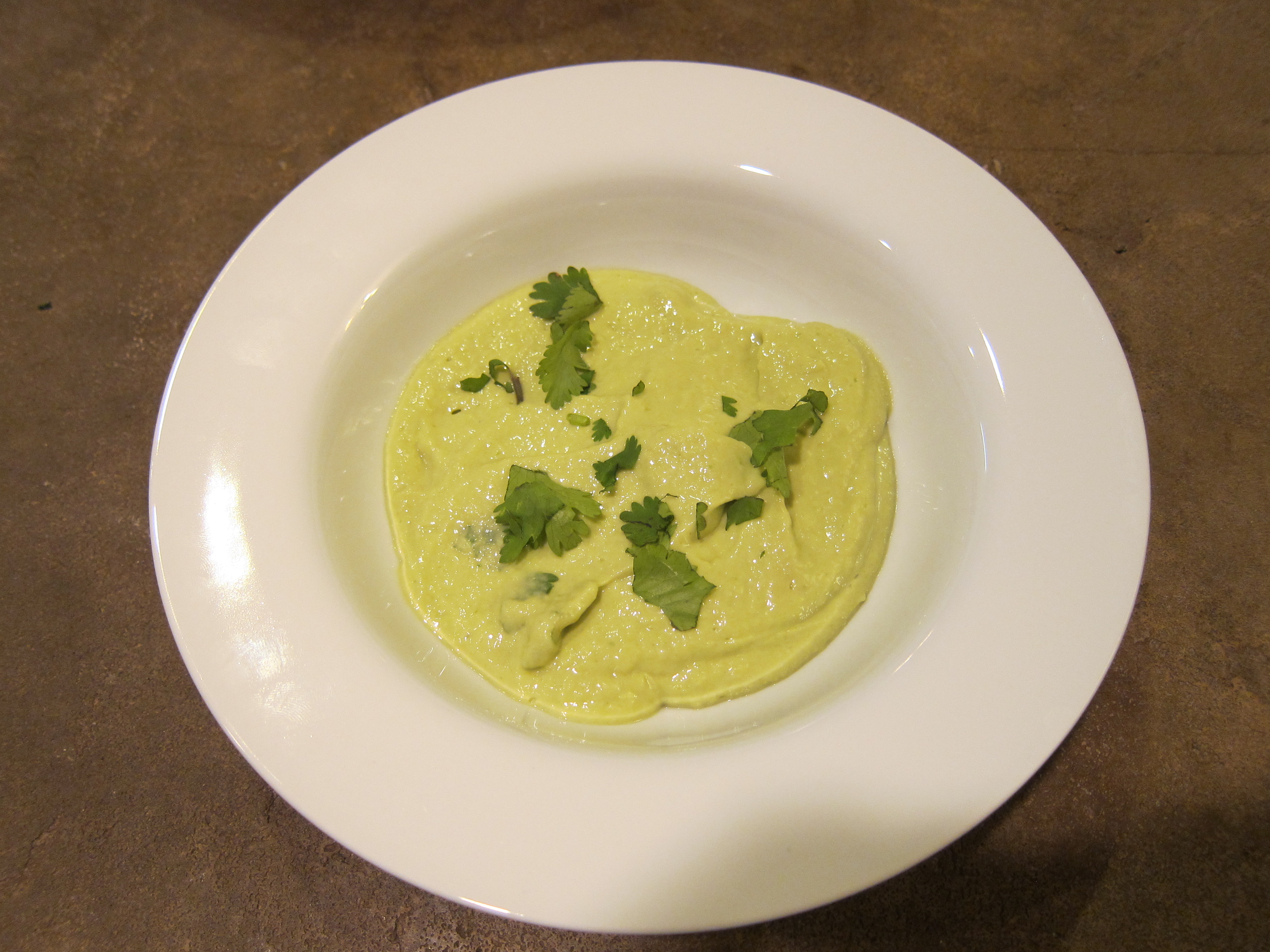 2. Add the avocado and add this to the blender, too, along with the rest of the ingredients. Puree until smooth. Taste and adjust ingredients. Refrigerate for 2-3 hours, at least, so the flavors can come together. Garnish with cilantro.