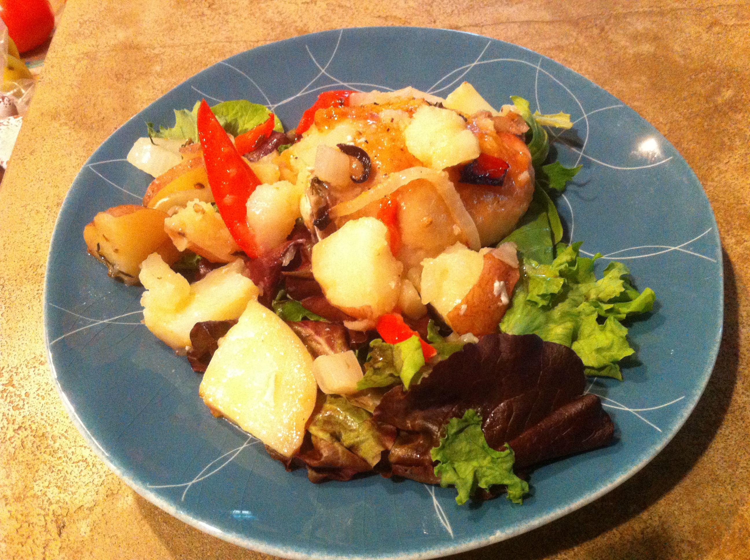 Tonight I made this tasty dinner in under an hour (from the time I dragged my happy ass into the kitchen until the time I scooped it onto my plate). This photo definitely doesn’t do it justice- I need to work on my food photography skills. Take my word for it- it was pretty and pretty darn tasty.