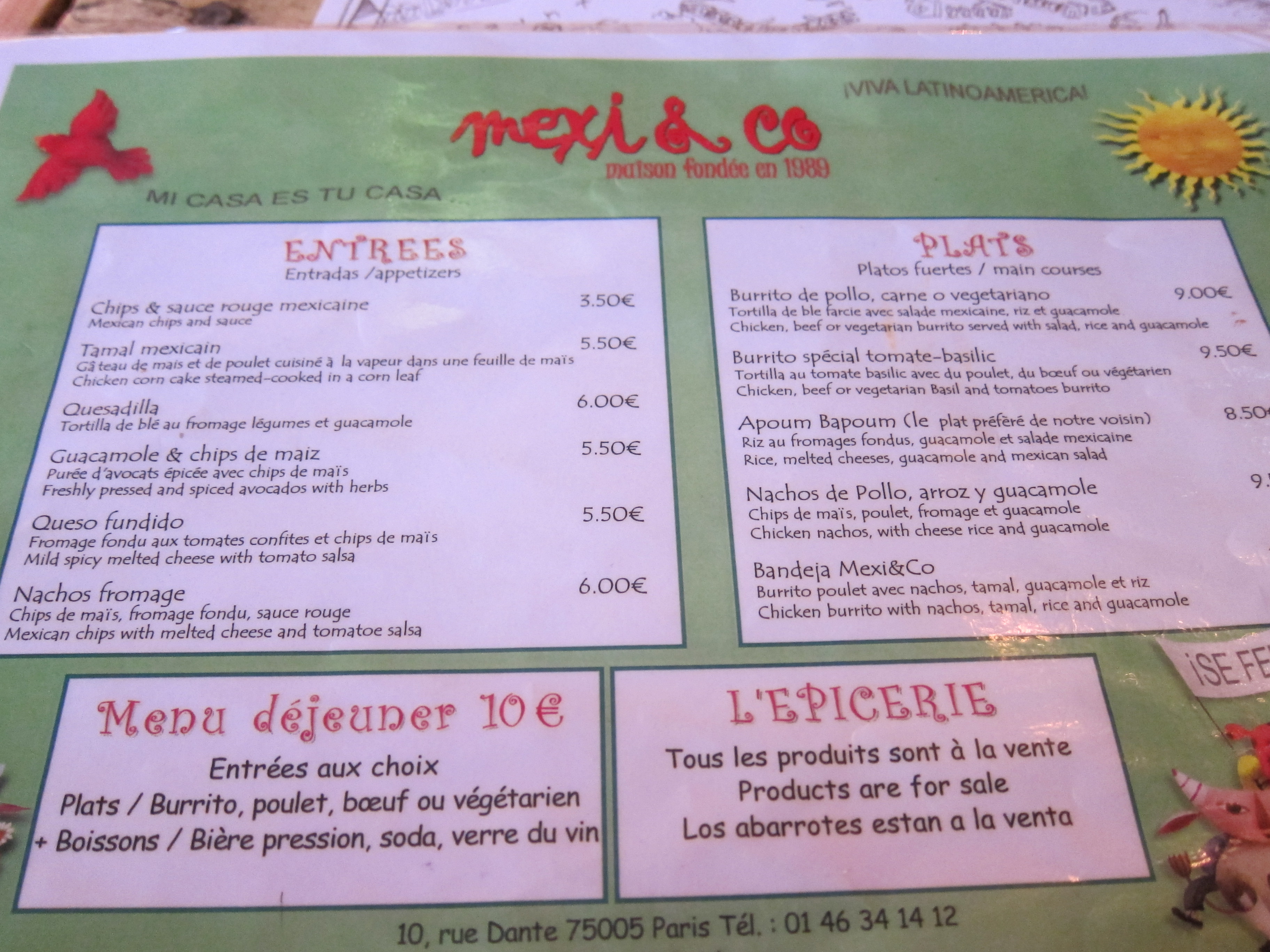 These two dishes and  a beer comprised the lunch special, which was a bargain at 10 euros.  The food was not as spicy as I would have liked (the French wouldn’t eat it if it had any kick to it at all), but was good and was a nice change from the usual restaurant offerings.  There was a margarita on the menu (6 euros) but I saved it for next time.  Here is the food side of the menu.
