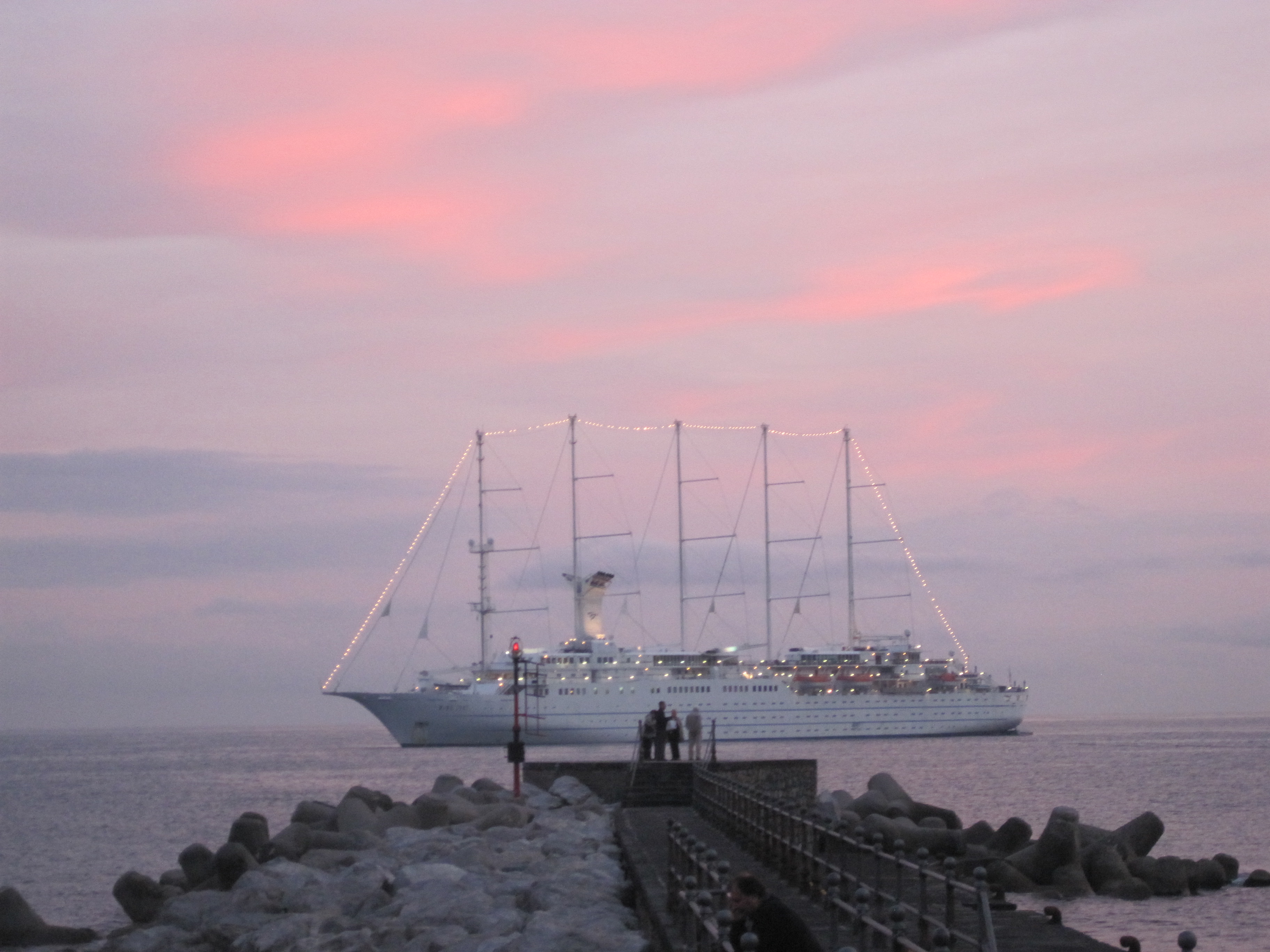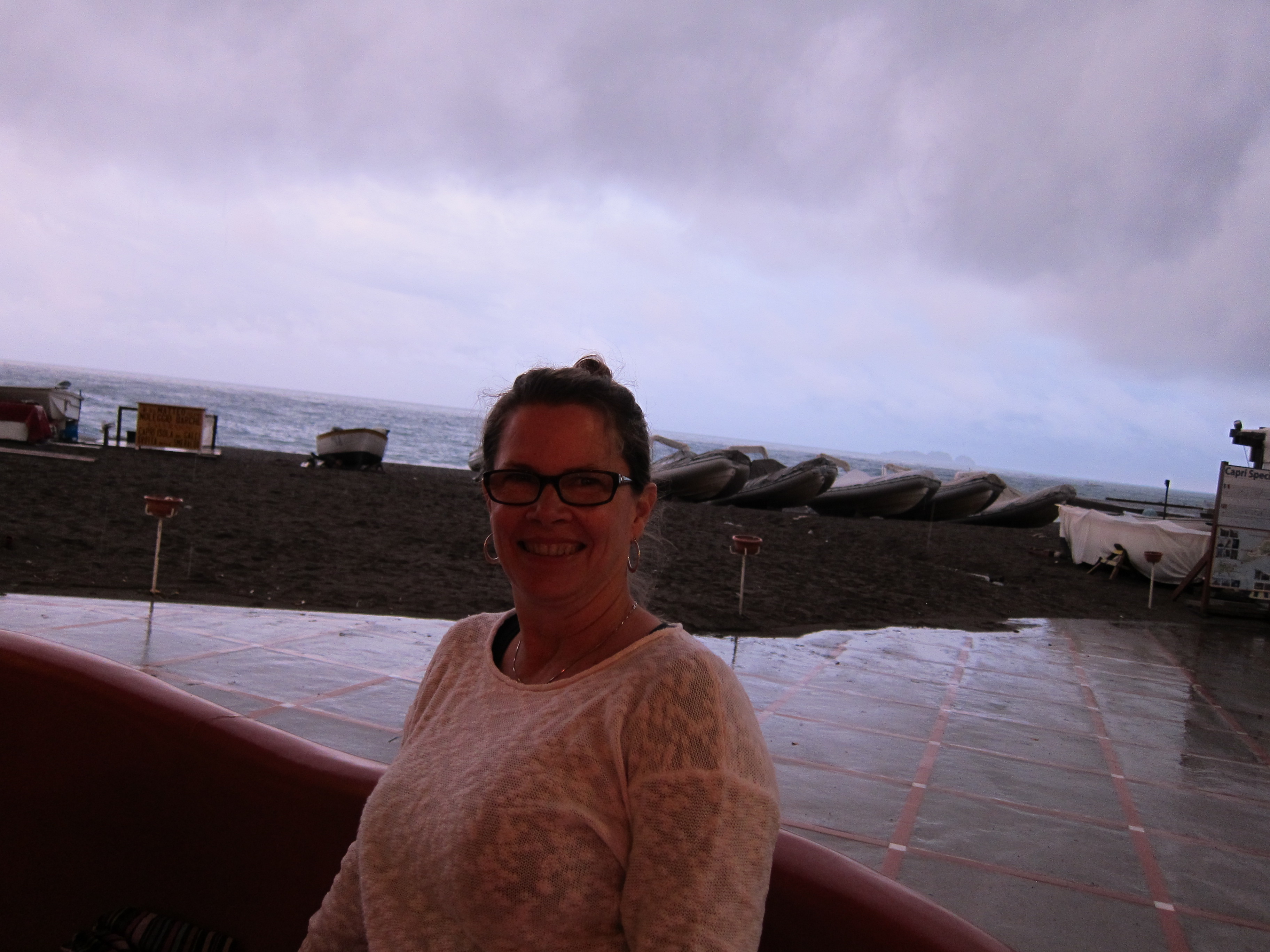 Once again we found ourselves headed away from our jammies and our beds and our bottle of local wine , and wondering where we would end up. Eventually we were told that we would go all the way back to the other side of Positano on the coastal road, and then take a longer way back to Sorrento. So for several more hours we sat in our wet clothes and shoes and clung to each other, staring out the windshield at the rain, the abyss, the water pouring off the mountain and down the road, and the stuff that had already fallen off the mountain onto the road. At one point we saw a boulder in the road that I swear looked exactly like the ones that Wile E. Coyote and Roadrunner used to push off cliffs onto each other. It was enormous. If it had picked up any forward momentum it would have taken out several houses, I’m sure. A few times it sounded like we were hydroplaning, and there was definitely enough water on the road to float that bus. Are you getting the picture of how terrifying this was? Mark said it reminded him of a ride at Disneyworld, only this ride didn’t end for four miserable hours!