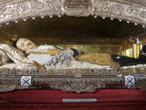 We learned about St. Vincent de Paul, who had quite a life. Apparently he was captured by Tunesian pirates when he was a young man, and was enslaved by them for three years until his escape. After that experience, he dedicated his life to helping people in need. He started the Sisters of Charity, became the private confessor of Louis XIII, and did much to minister to the poor and the needy. His remains are on display in a gorgeous church called La Chapelle des Lazaristes. We climbed a narrow, winding stone staircase in order to walk by the glass case in which he lies peacefully. Wax molds have been placed over his face and his hands. It was really interesting to see his remains so up close and personal.