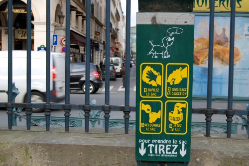 I saw this poop sack dispenser, complete with step by step instructions, at the Tuileries today and it made me smile. Apparently that is why Parisians are notoriously bad about not picking up after their dogs- they just didn’t know how! There was an additional notice on the sign saying that this new dispenser was there on a trial basis and would be evaluated after six months. I wonder if it will catch on?