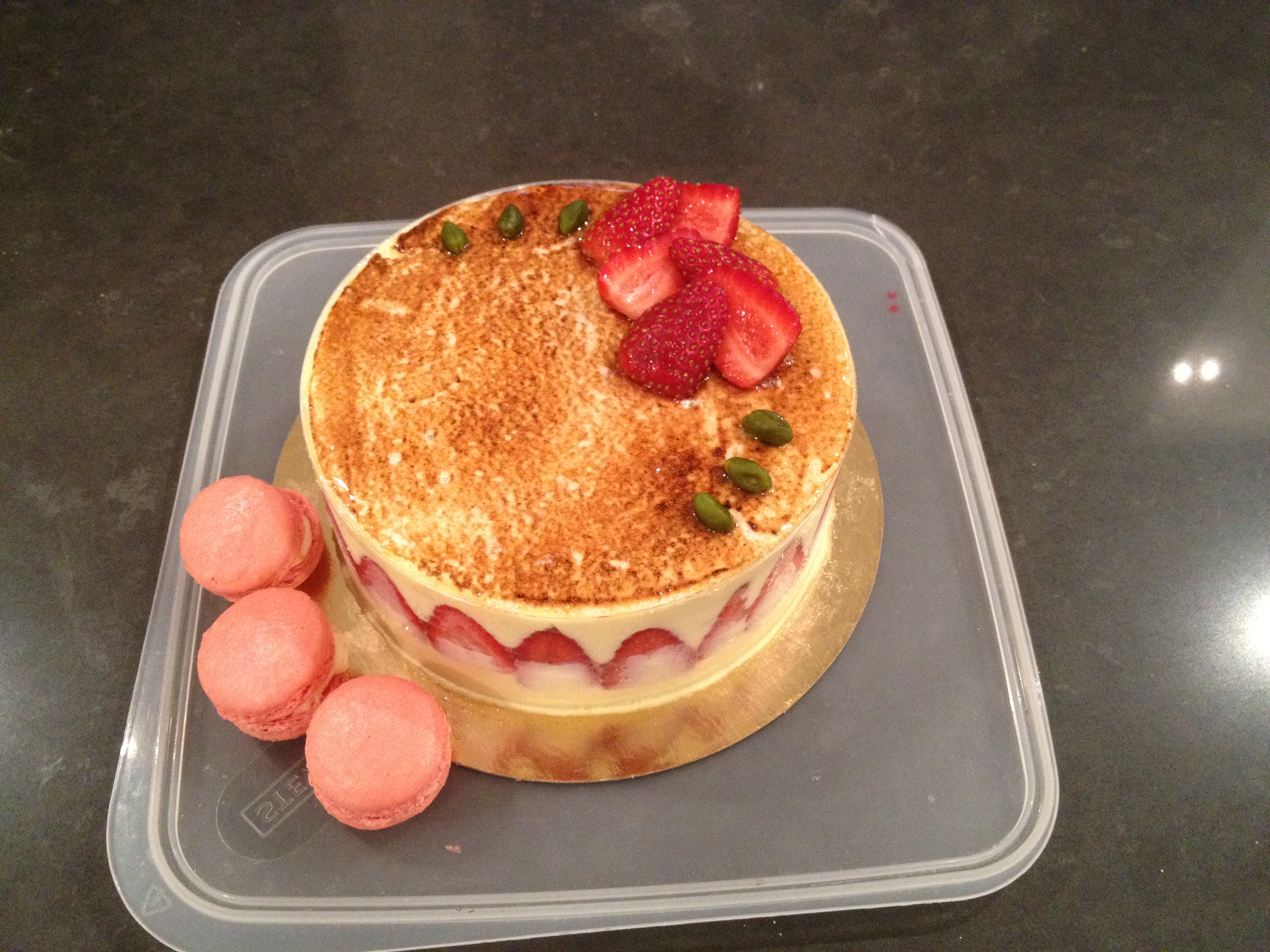 Lets see, what was next?  Oh yes, dinner.  Or for our purposes, dessert.  Mlle Cordon-Bleu brought home one of her absolute best desserts evah.  Chock full of strawberries and butter pastry cream and moist cake and even a few of my favorite pistachio nuts- I seriously could have eaten the whole thing.  But I knew they would judge me for it, so I exercised restraint.  The night is still young, however, and it’s just a few steps away, in the fridge, in an unlocked Tupperware container.