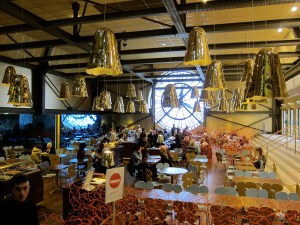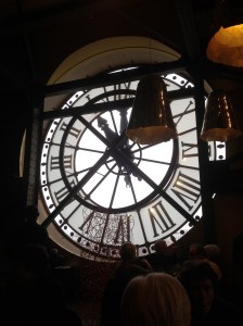 Last week I amused some Facebook friends with my note that I had gotten lost on my way to Versailles, but ended up at the Musee D’Orsay, so all had not been lost after all.  The RER train system truly can be confusing, even for two relatively high-functioning women, one of whom has lived here for over a year.  We had gone quite out of our way before realizing that the famous chateau we sought was NOT at the end of our route.  We jumped off and changed platforms and back-tracked as far as the museum, at which point we realized we were going to be so late to Versailles that we would have missed half of our tour.  So we aborted and opted for the Musee D’Orsay, which I had planned to visit soon anyway.  I love the story of this museum, which occupies a former train station that was slated to be torn down before someone came to his senses and turned it into a lovely museum.  Unfortunately, they don’t want you to take photos at the Musee D’Orsay, (which is strange because the Louvre doesn’t have the same prohibition) but I did take a few of the newly renovated cafe and of the incredibly gorgeous clock there.