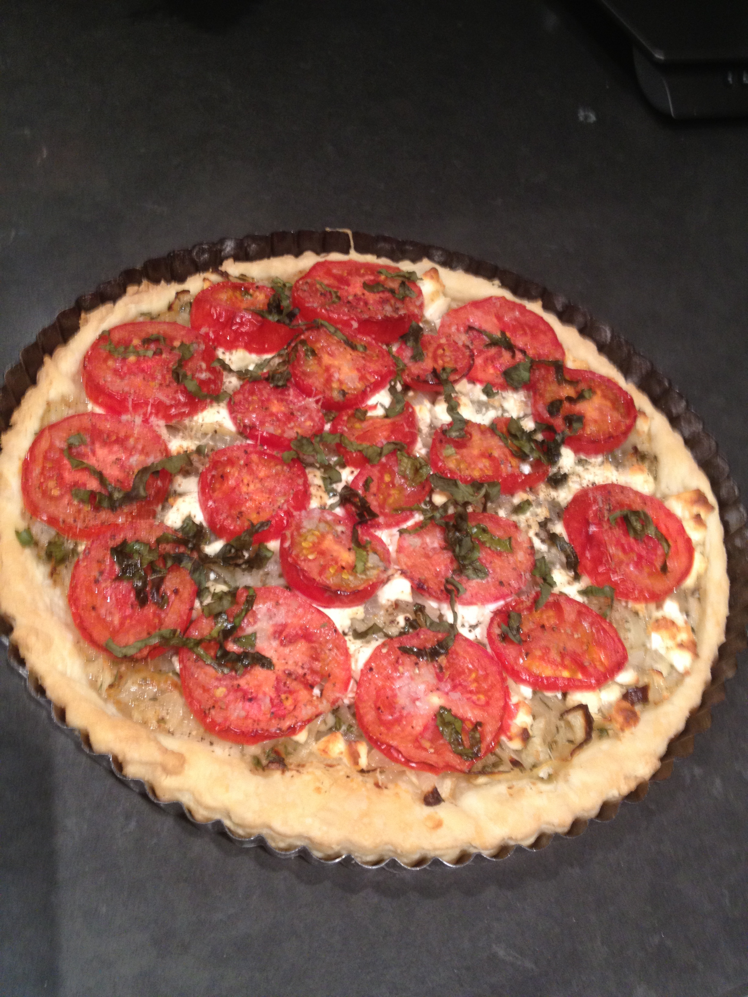 We fully intended for that three-hour lunch to be the final meal of our feeding frenzy. However, as we walked around that afternoon, trying desperately to recover feeling in our hands and feet, I got a text from Mlle. Cordon-Bleu that there was left-over puff pastry dough in our fridge. As in “made that day at the Cordon-Bleu” puff pastry dough. We immediately began plotting what evil we could do with that dough, and decided on Barefoot Contessa’s goat cheese and tomato tart. Two quick stops at the cheese shop and the produce store, and we were ready to make this little baby!