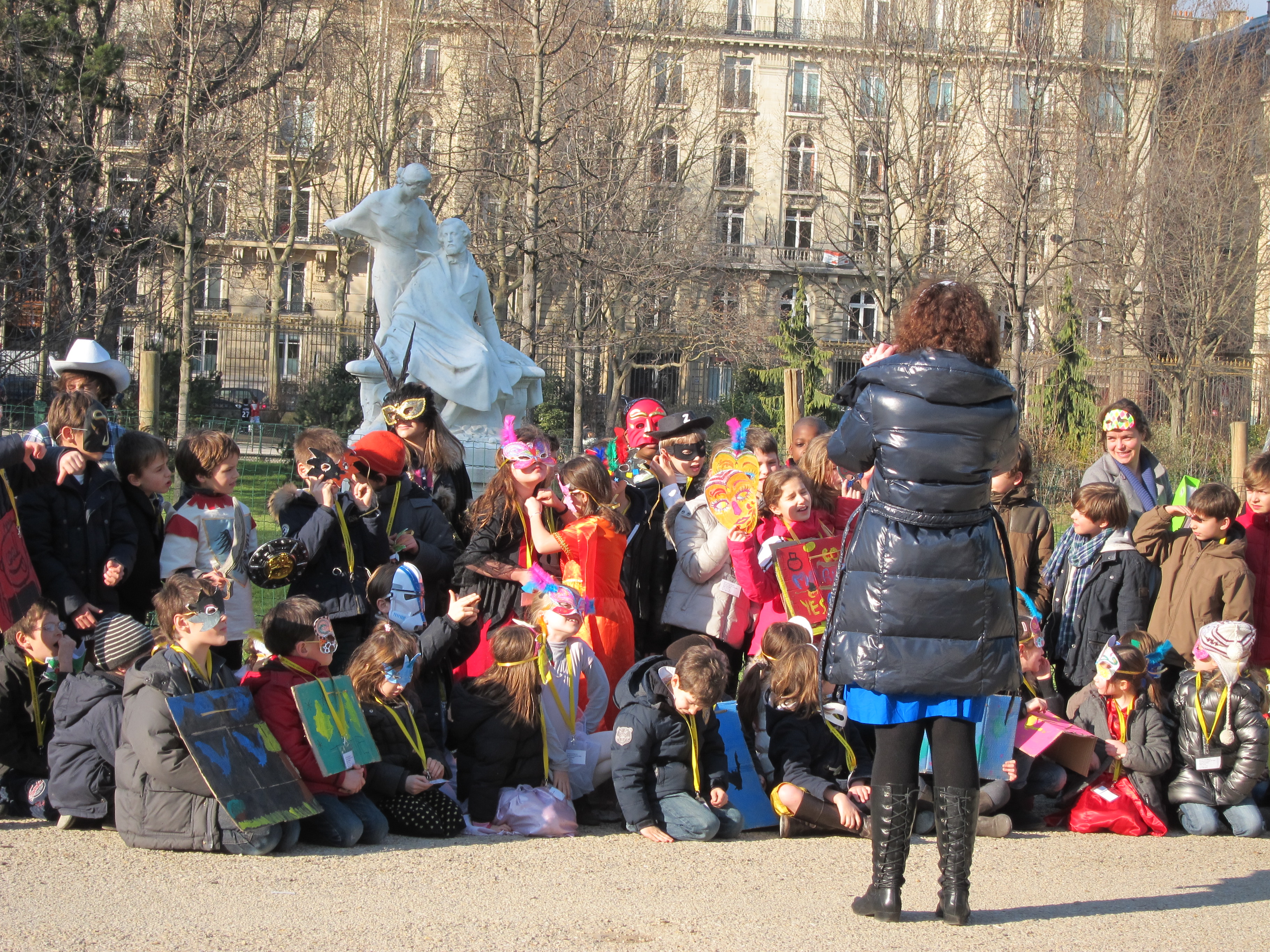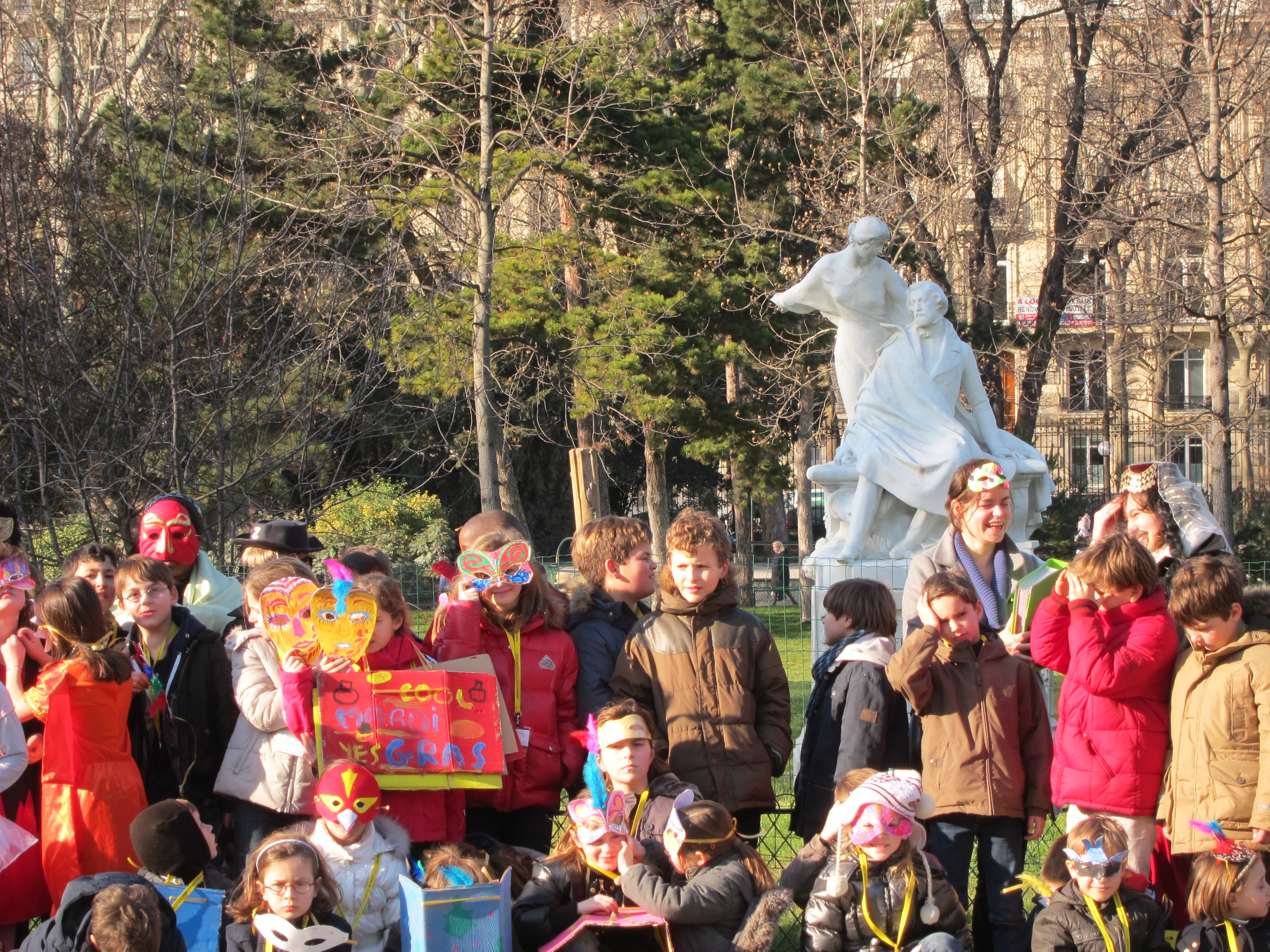 When I got home Wonderchien gave me the long face, as if he knew I had been to a park without him.  Nothing to do but put my coat back on and take him to Parc Monceau.  While there we saw a group of school children dressed up for Mardi Gras, all lined up for photos.  I hurried over and took a few.