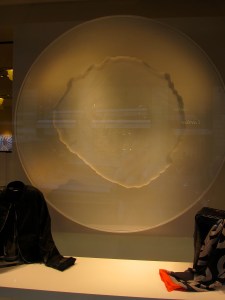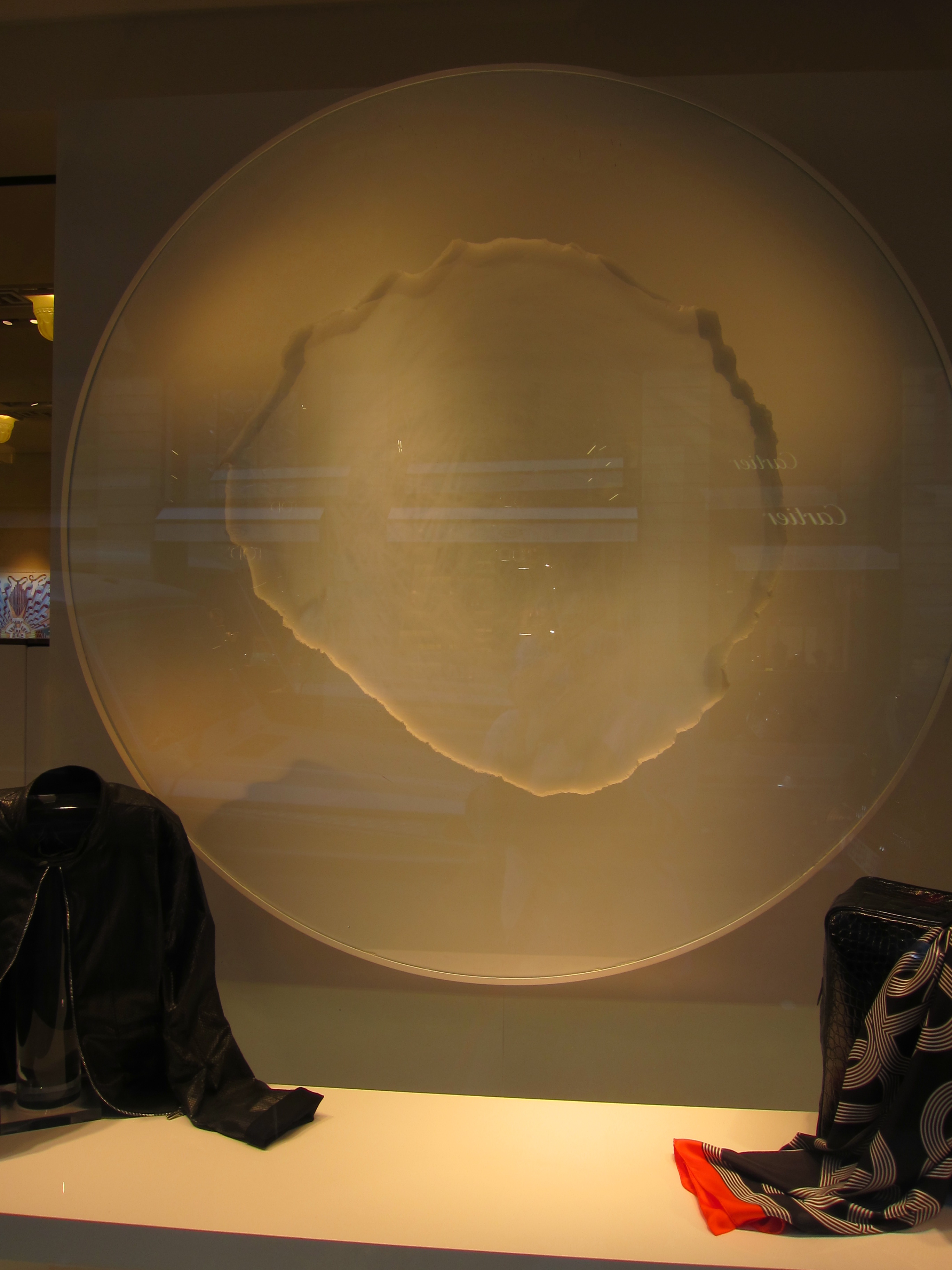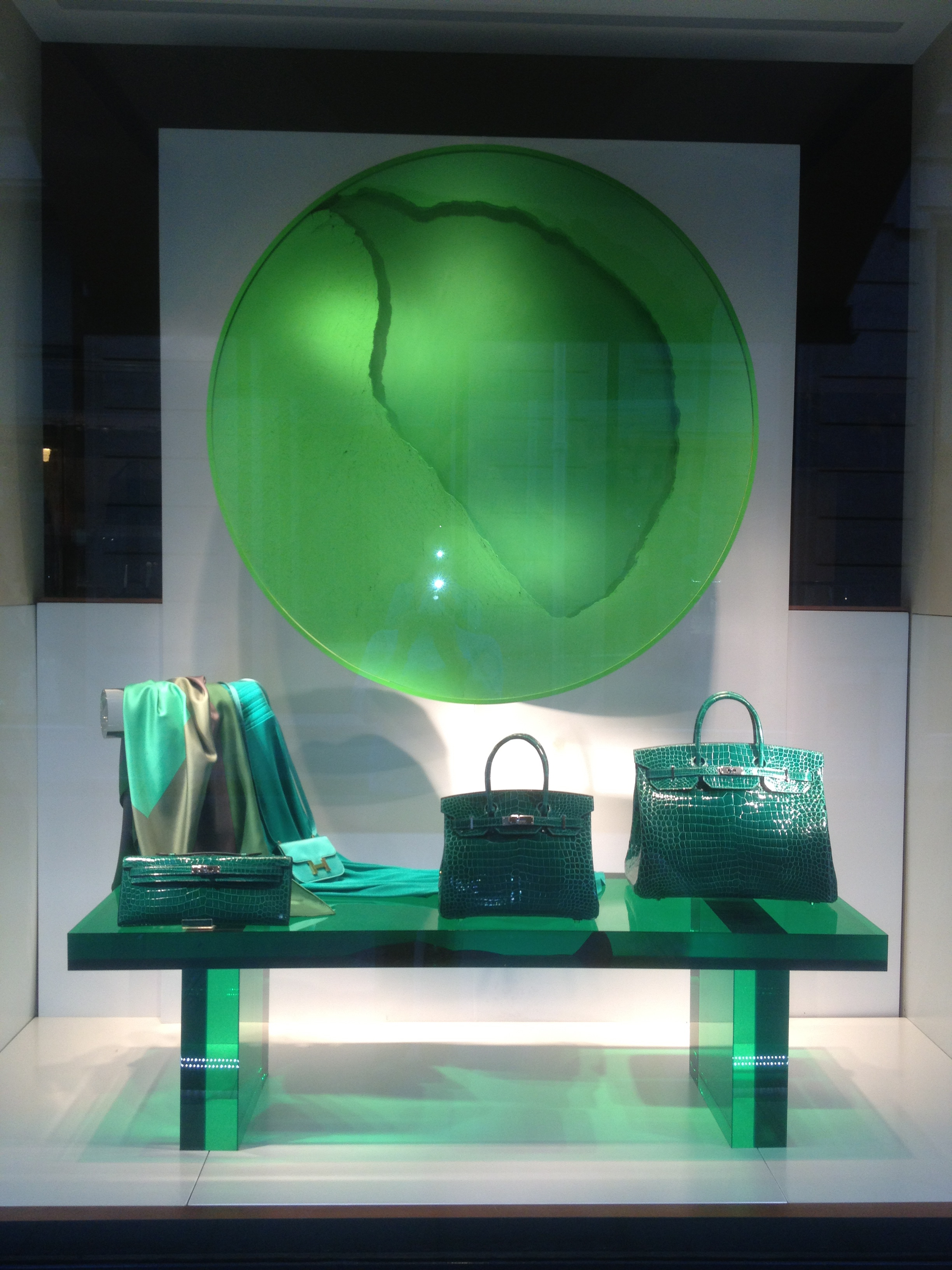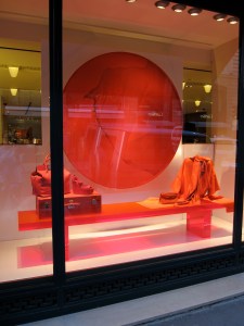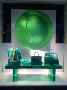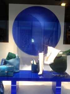 Ever since then I haven’t been able to get those windows out of my mind. They were amazing- even for Hermes. Each window has a giant mesh wheel holding a chalk-like substance. The wheel turns, ever so slowly, causing the colored powder to cling to the top of the wheel or fall down, creating mesmerizing designs. Oh yeah- they also have Hermes products of the same color scattered around the wheel, but those almost seem like afterthoughts. The wheels are the main attractions. My pictures aren’t great- I still struggle with reflection when I take photos of windows- but I hope you can get the idea.
