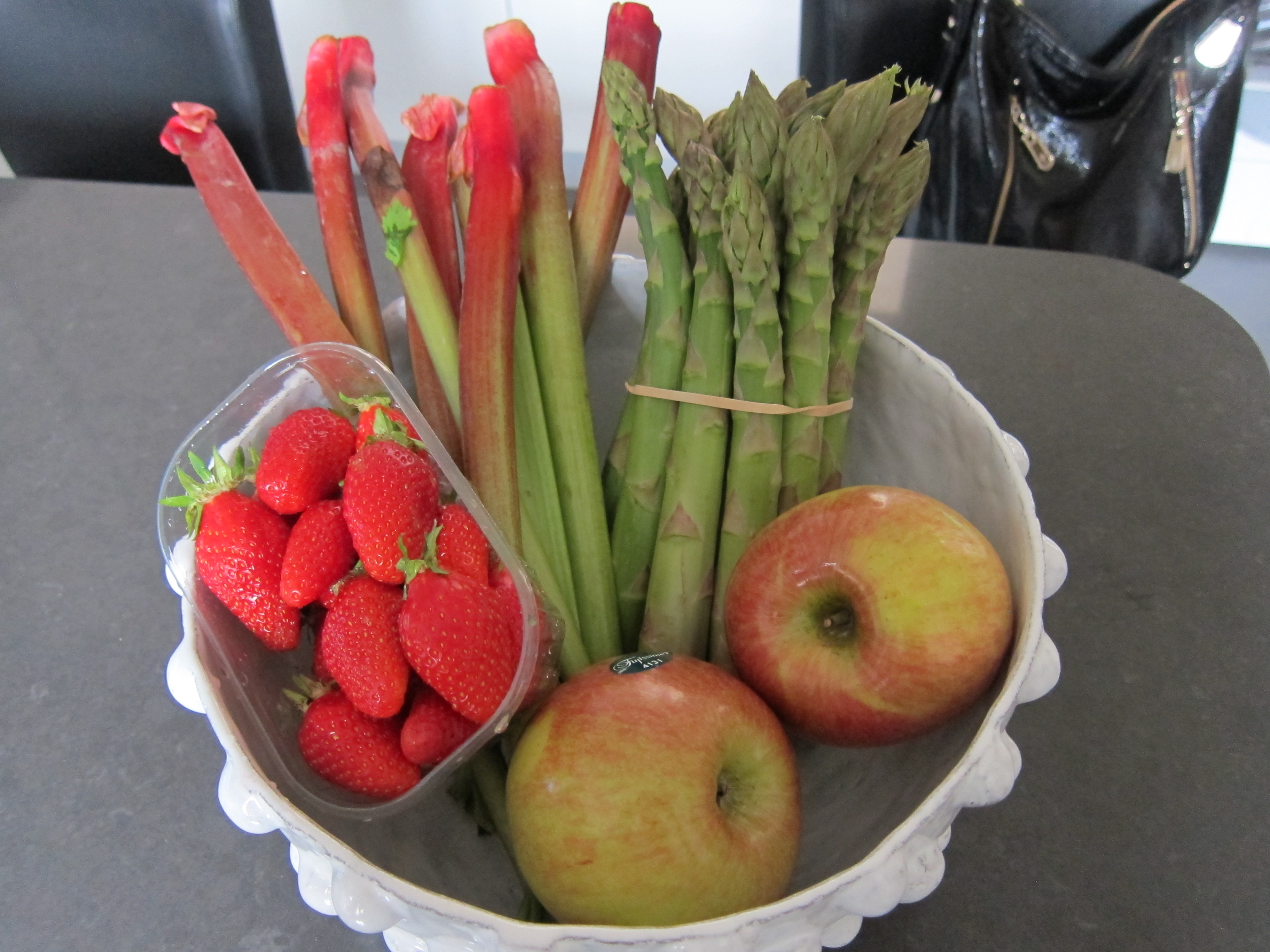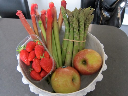 Today I went to the outdoor market with the specific goal of finding my first French asparagus and strawberries of the season. I scored, and also found some rhubarb and a few lovely apples. Voila-