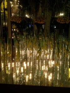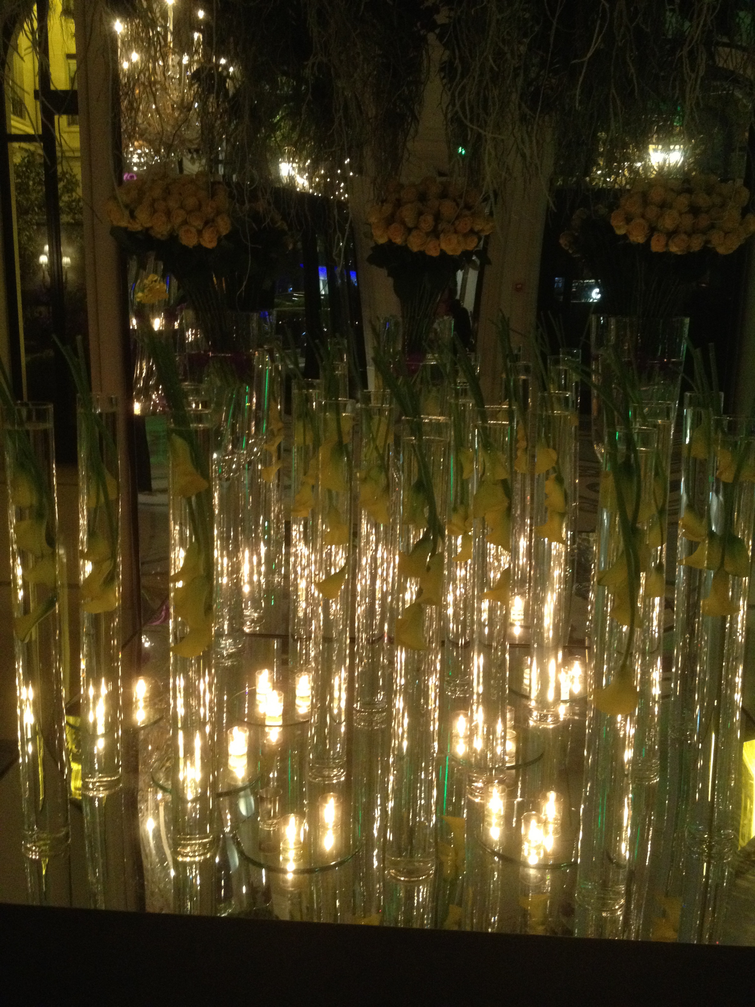 It’s really hard to see, but the flowers in the lower area are actually in the vases upside down, with the flower part in the water.