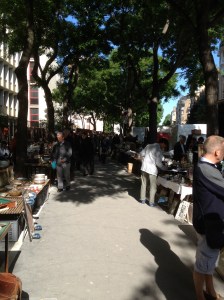 I love this market, which is called Porte de Vanves, because it is an easy metro ride from my apartment, and is not so large that it can’t be done in an hour. There is a little of everything here. Dishes, glasses, silver, crystal, paintings, jewelry, clothes, magazines, linens….you get the idea. I love poking through it all at a leisurely pace. Mark would rather drink battery acid.