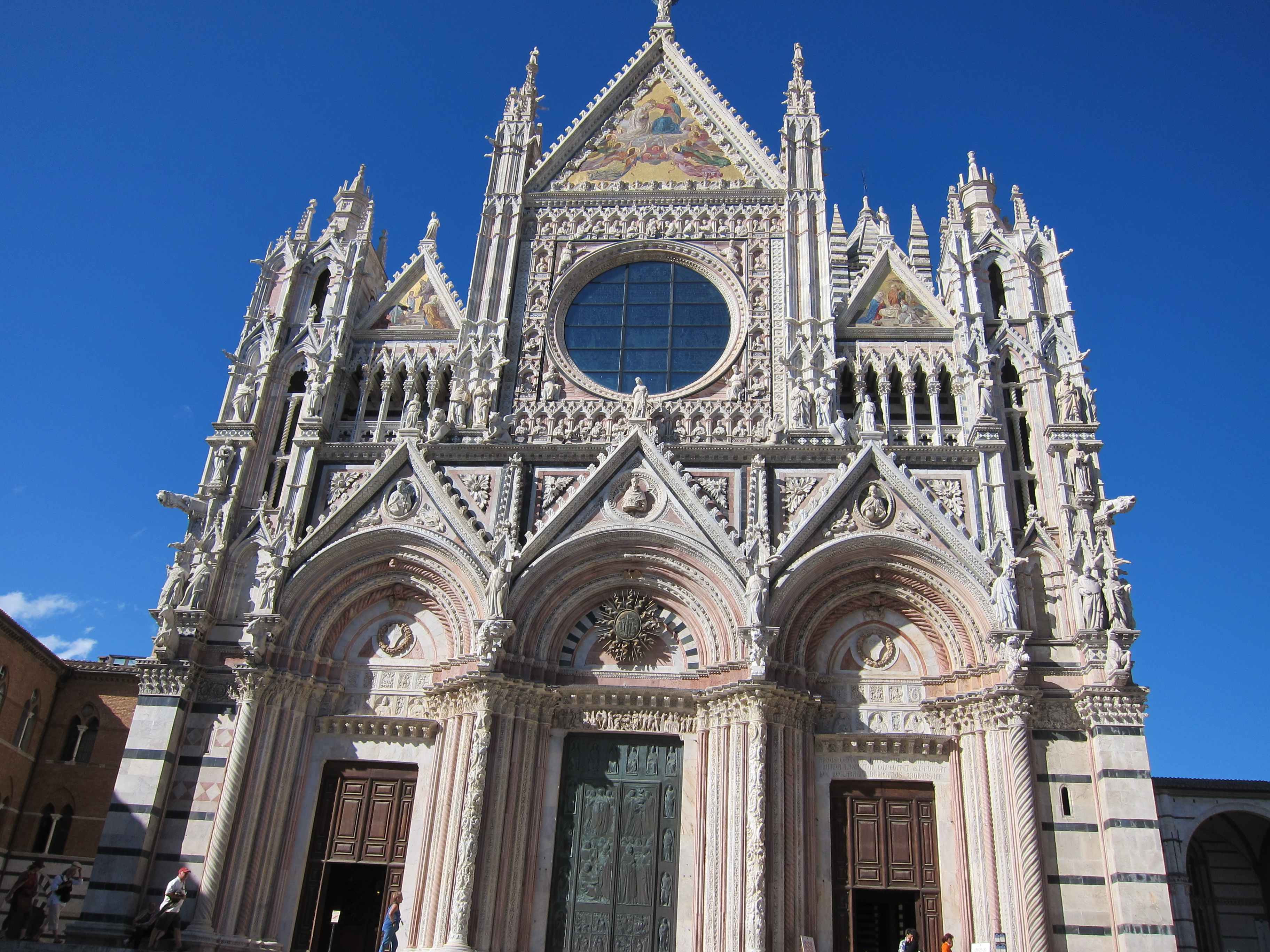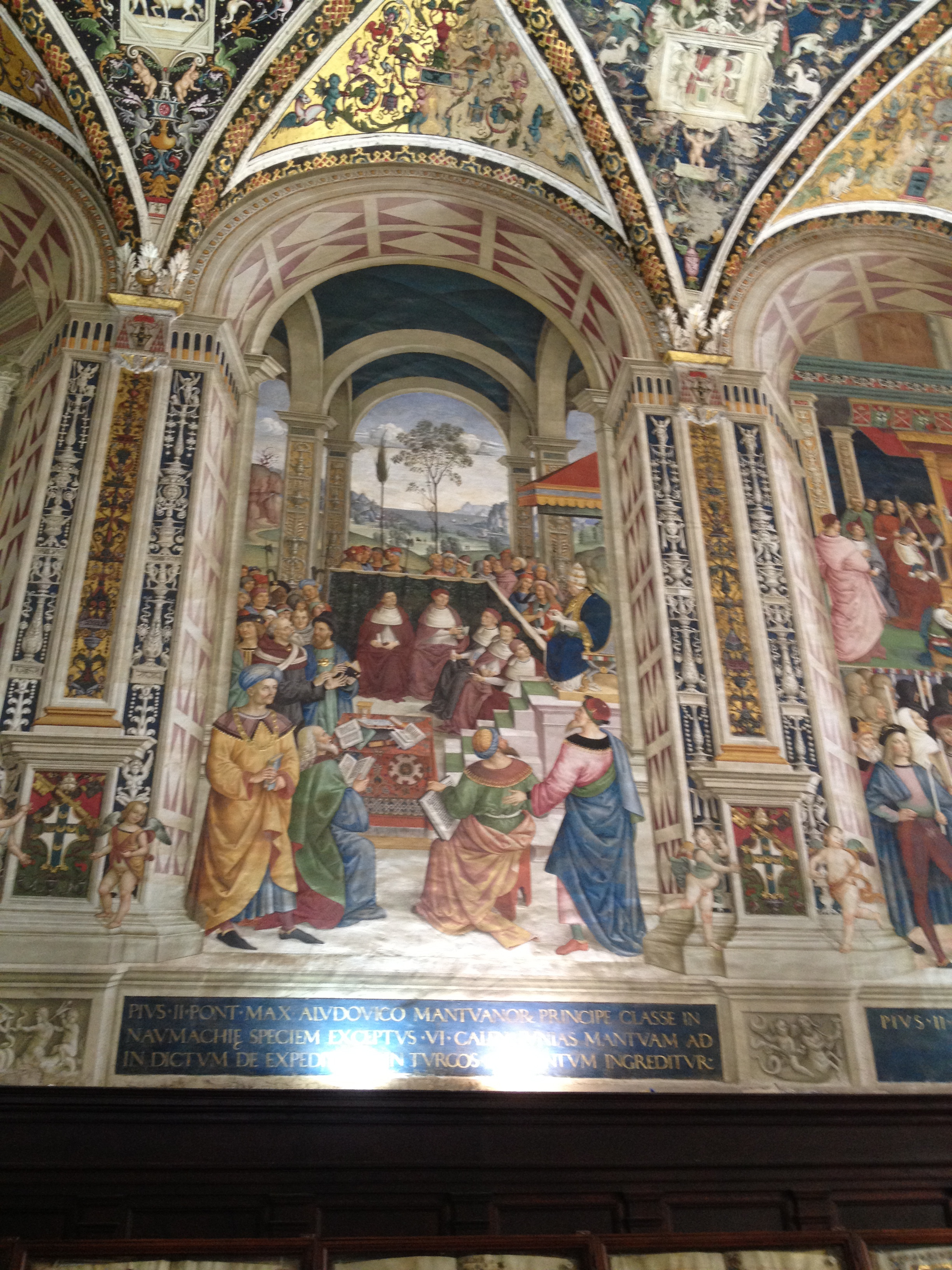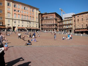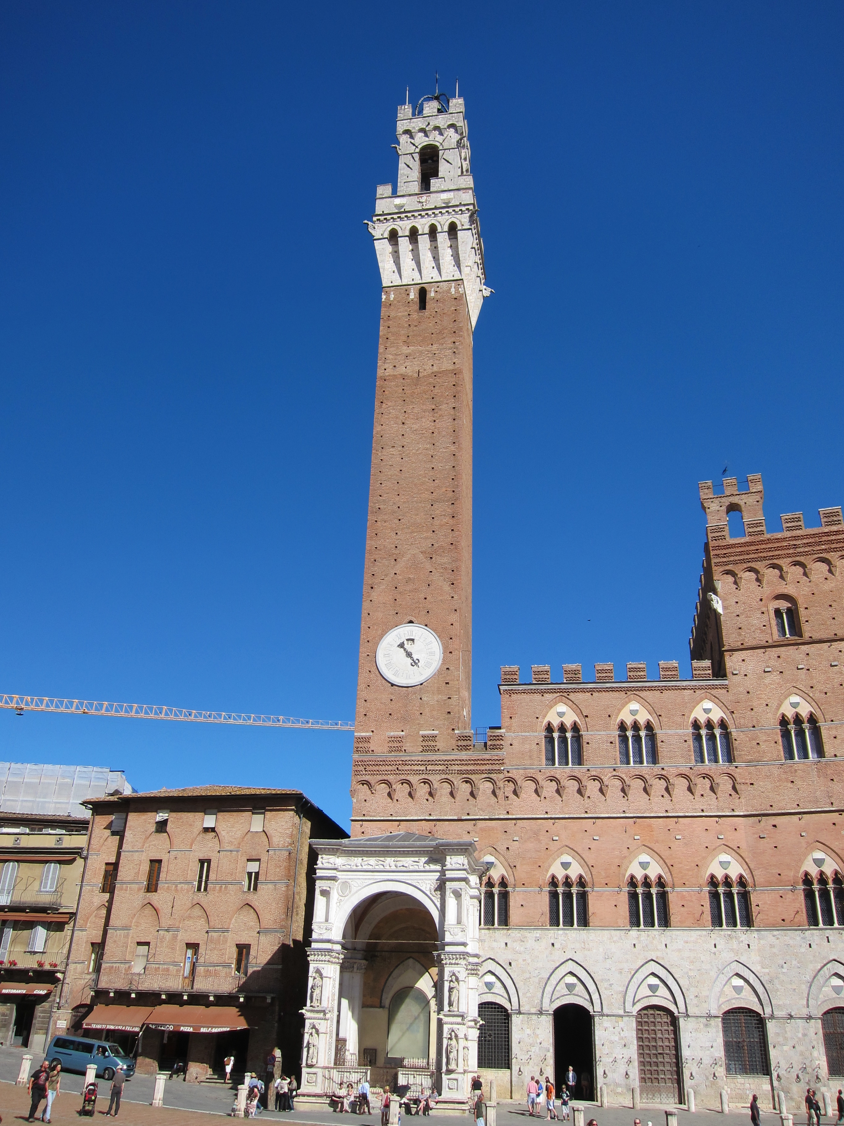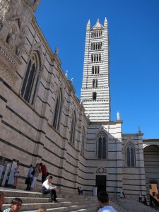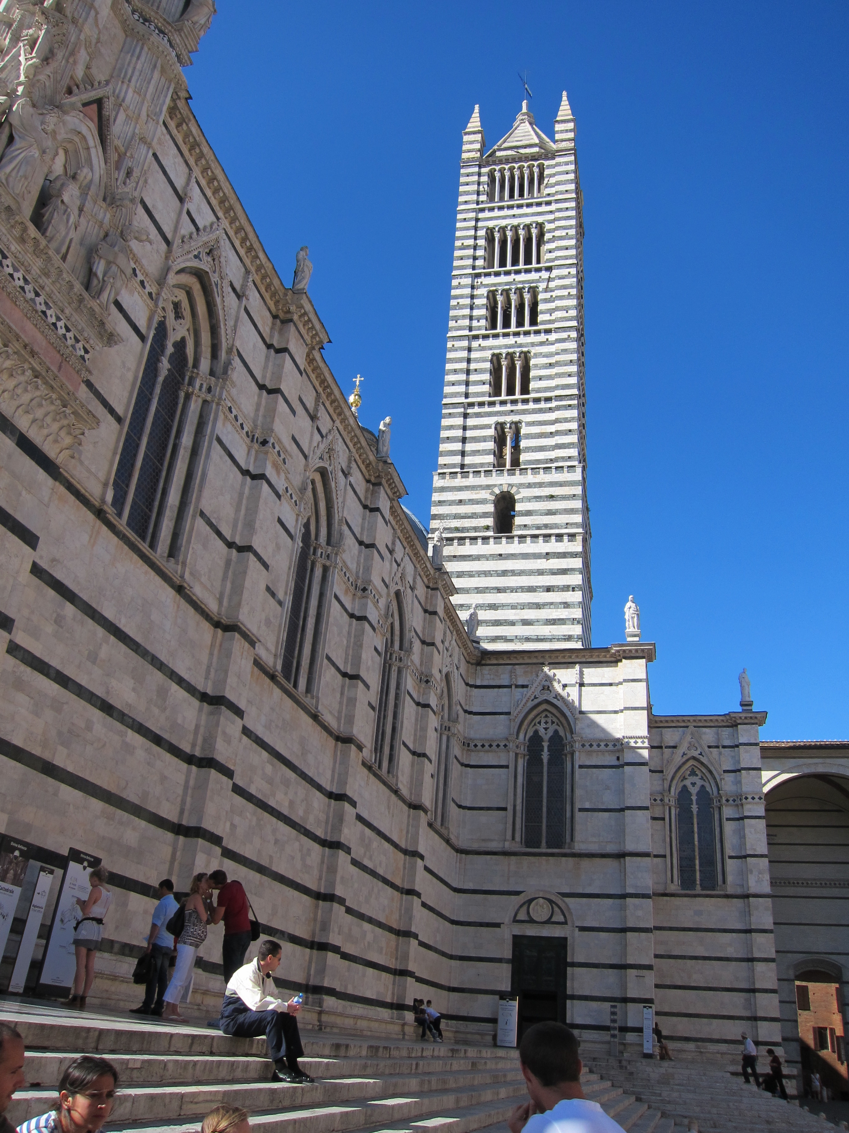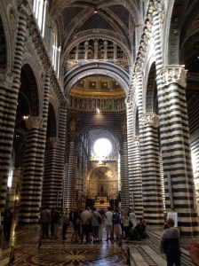 Siena was the first town we toured. It was lovely. There is a famous horserace here called the “Palio de Siena” that is run twice a year around the central plaza. The ten riders, each from a different “contrade” or “district” of Siena, ride bareback three laps of the plaza. Each horse wears the colors of its district, and is not required to still have its rider at the finish line in order to win. This race dates back to 1656. Isn’t that crazy?