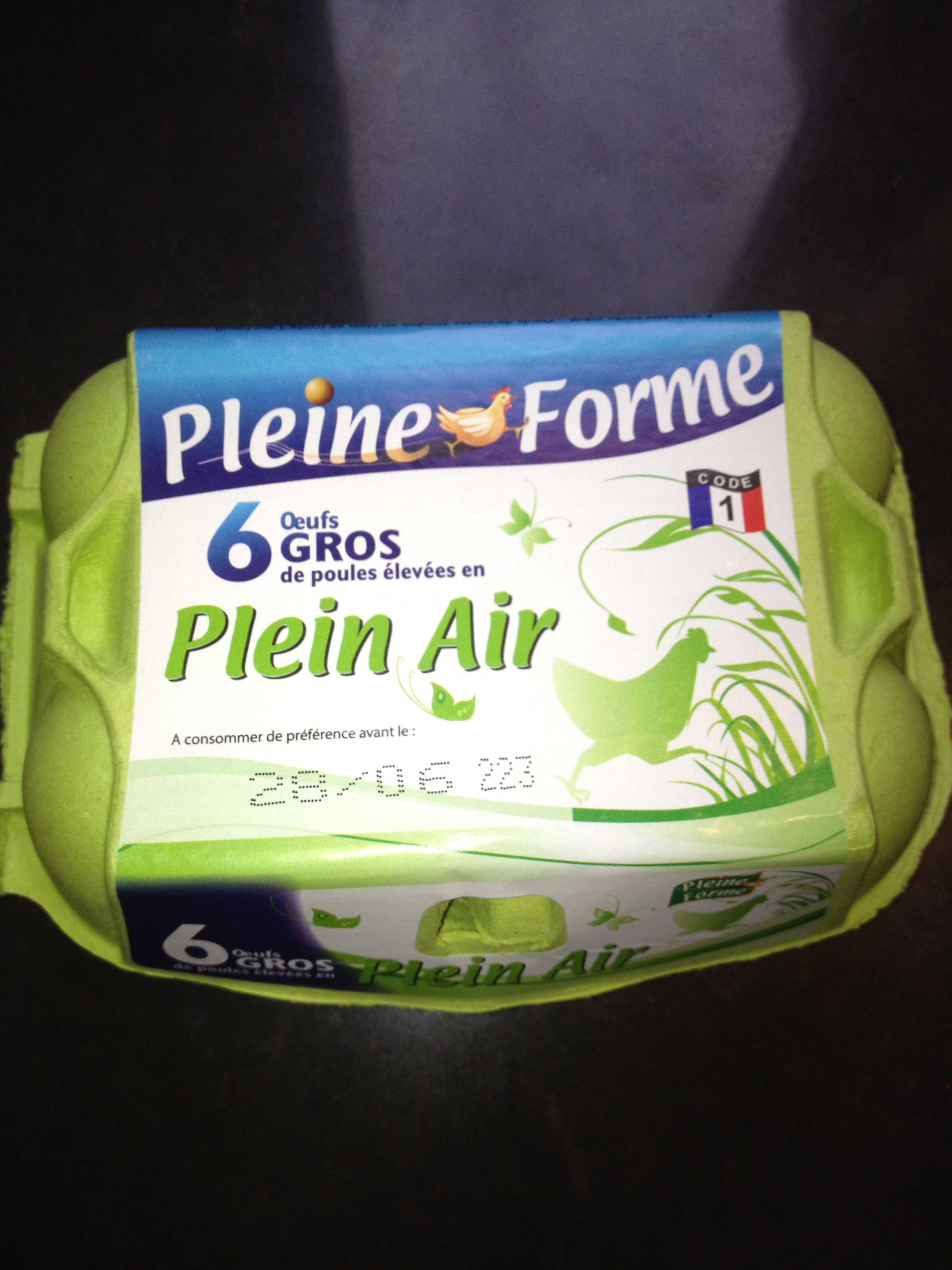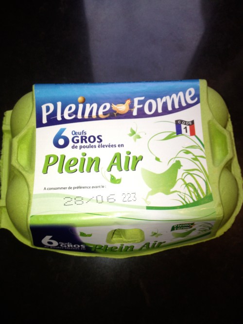 This is the type of eggs I buy in Paris.  “Plein Air” means they were from free-range chickens.  The “Code 1” also identifies the eggs as being free range (four square meters of grass-covered land per chicken).  “Code 0” would indicate organic, “Code 2” would mean the chickens were free to roam in a barn, but there might have been as many as 12-15 chickens per square meter.  “Code 3” would indicate caged chickens raised indoors.  Poor, sad, “Code 3” chickens. The expiration date (“28/06”) will always be a maximum of thirty days.