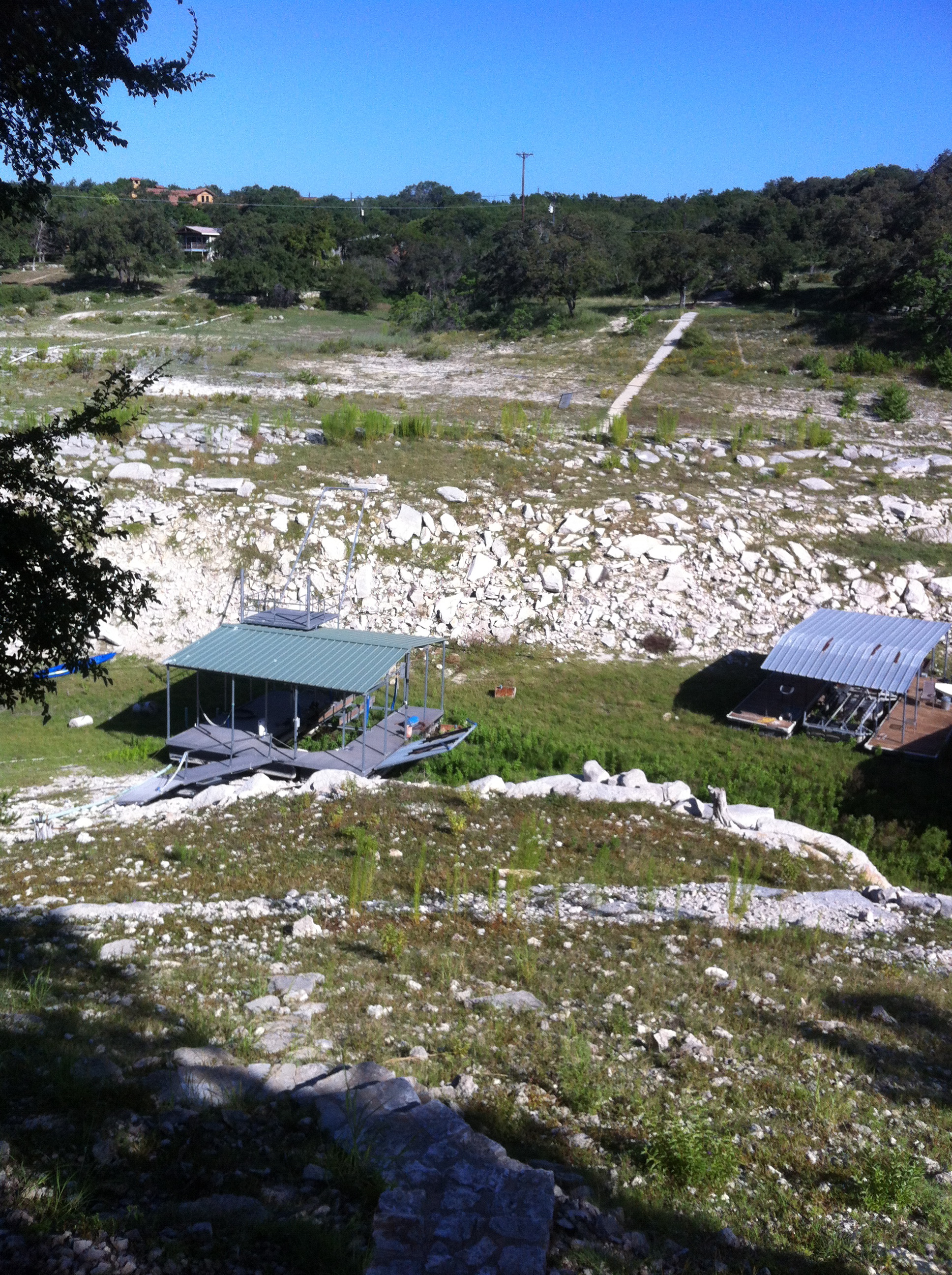Our house used to be on Lake Travis, a limestone- bottomed lake with lovely clear water. We are on a cove, which allowed us a quiet and safe place to swim off of the main body of water, and also protected our dock from the pounding wake created by passing boats. It was a good thing, before the drought drained the lake of water, that is. Now, not so good. Our cove is empty , and our dock is perched precariously on the rocks, safely out of reach of any water at all. Our jet skis have not left our garage this summer. Our floats have remained flat and limp. So sad.