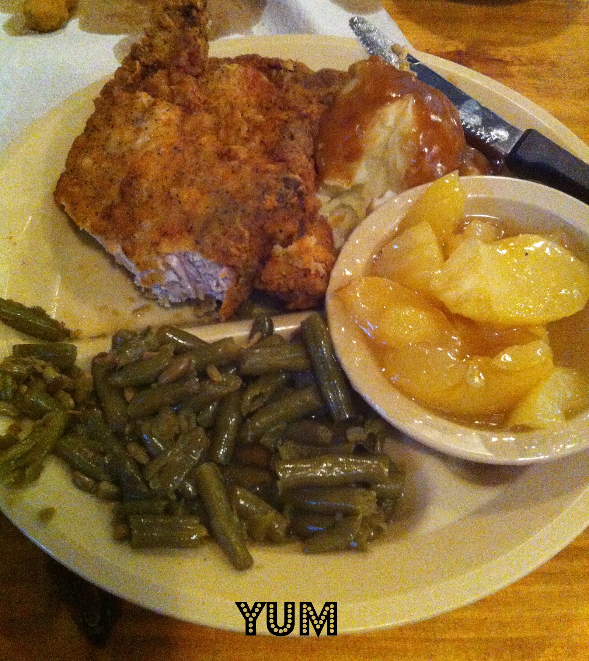 Sikeston, Mo.is the home of Lambert’s Throwed Rolls– a restaurant of epic proportions (and portions) where hot, buttery yeast rolls are thrown (or “throwed”) with impressive accuracy to customers who raise their hands in the air for them. The rolls were delicious, as were the pork chops, mashed potatoes, green beans, and stewed apples. I definitely will not be served any plates like this in Paris. Nor will I be thrown any rolls.
