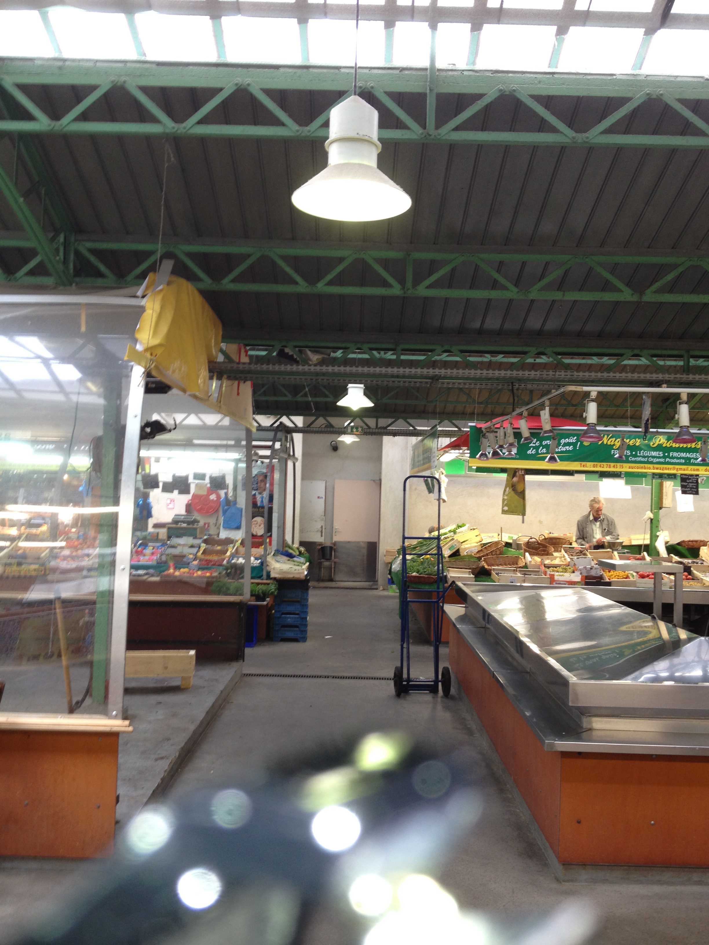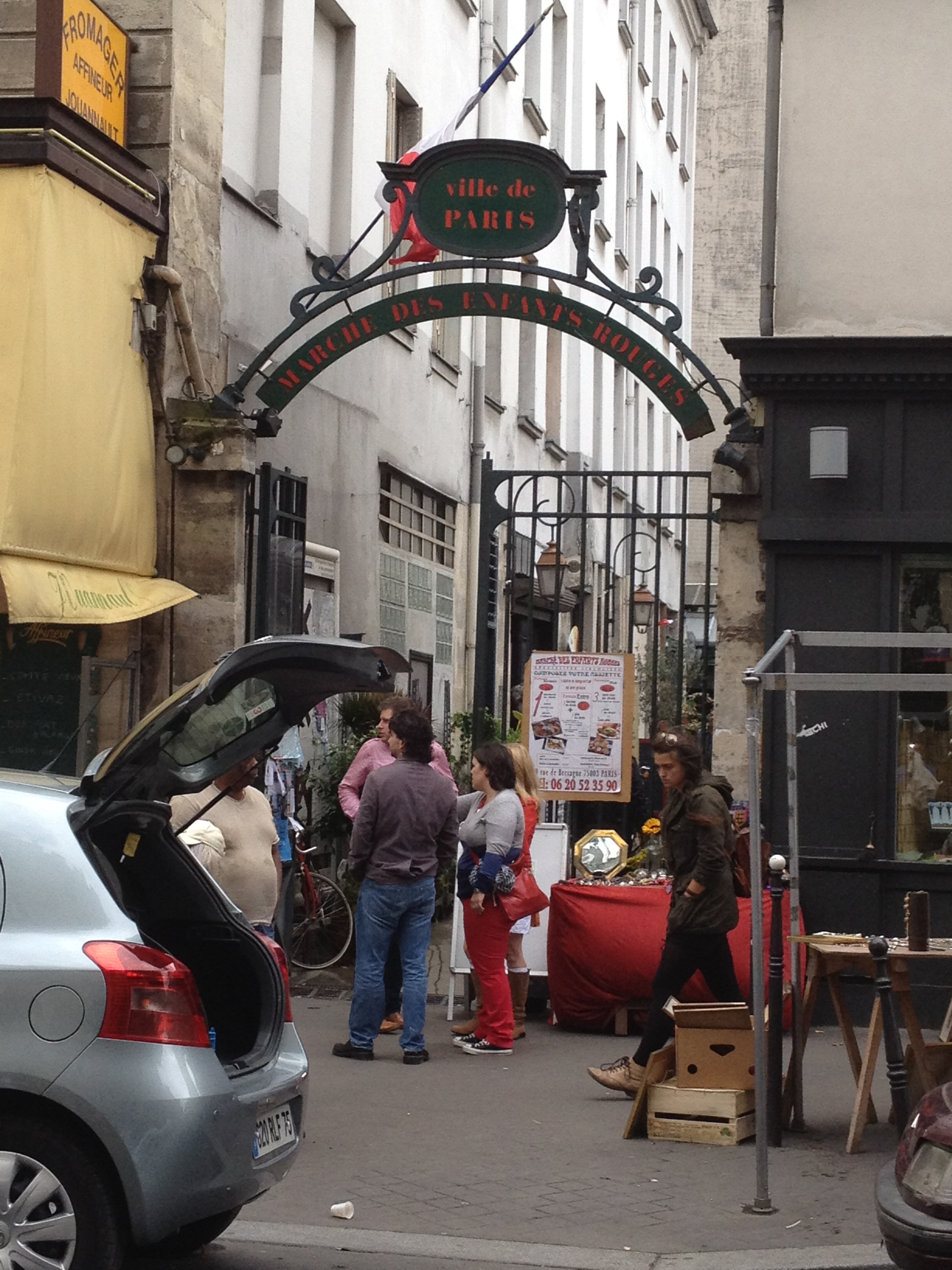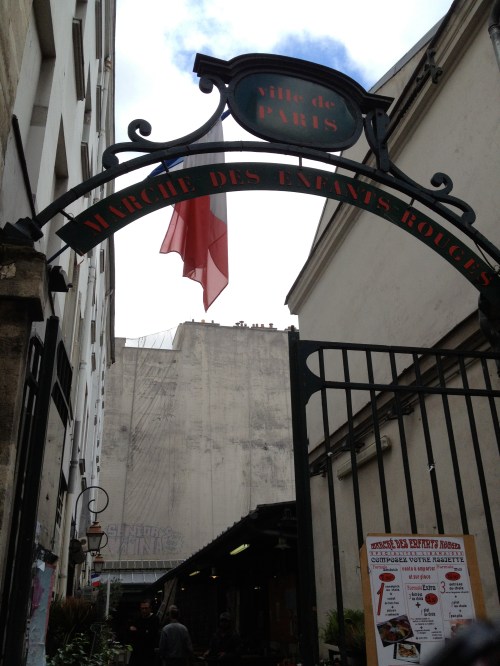 I had heard about an interesting market in the Marais called Le Marche Des Enfants Rouges, which translates as the Market of the Red Children.  And why that name, pray tell?  Well, this  covered market was built in 1615, on the site of a former orphanage whose children wore red uniforms.  Kind of sweet, right?  The market is the oldest covered market in Paris, and was really fun to explore.  I was regretting that I had lunch plans, because the air was redolent with the aromas of foods being prepared by vendors in the market.  There was a colorful Moroccan stand, an African stand, an Italian counter, crepes and sandwiches that smelled amazing, and at least one Asian vendor.  They even had colorful tables where one could sit and enjoy the delicacies being offered.  Next time I’ll know to go for a meal.  I felt a bit awkward about taking photos, as it all felt very confined, as if I were in an enclosed store, and I wasn’t sure I should snap away.  Here are a few shots.