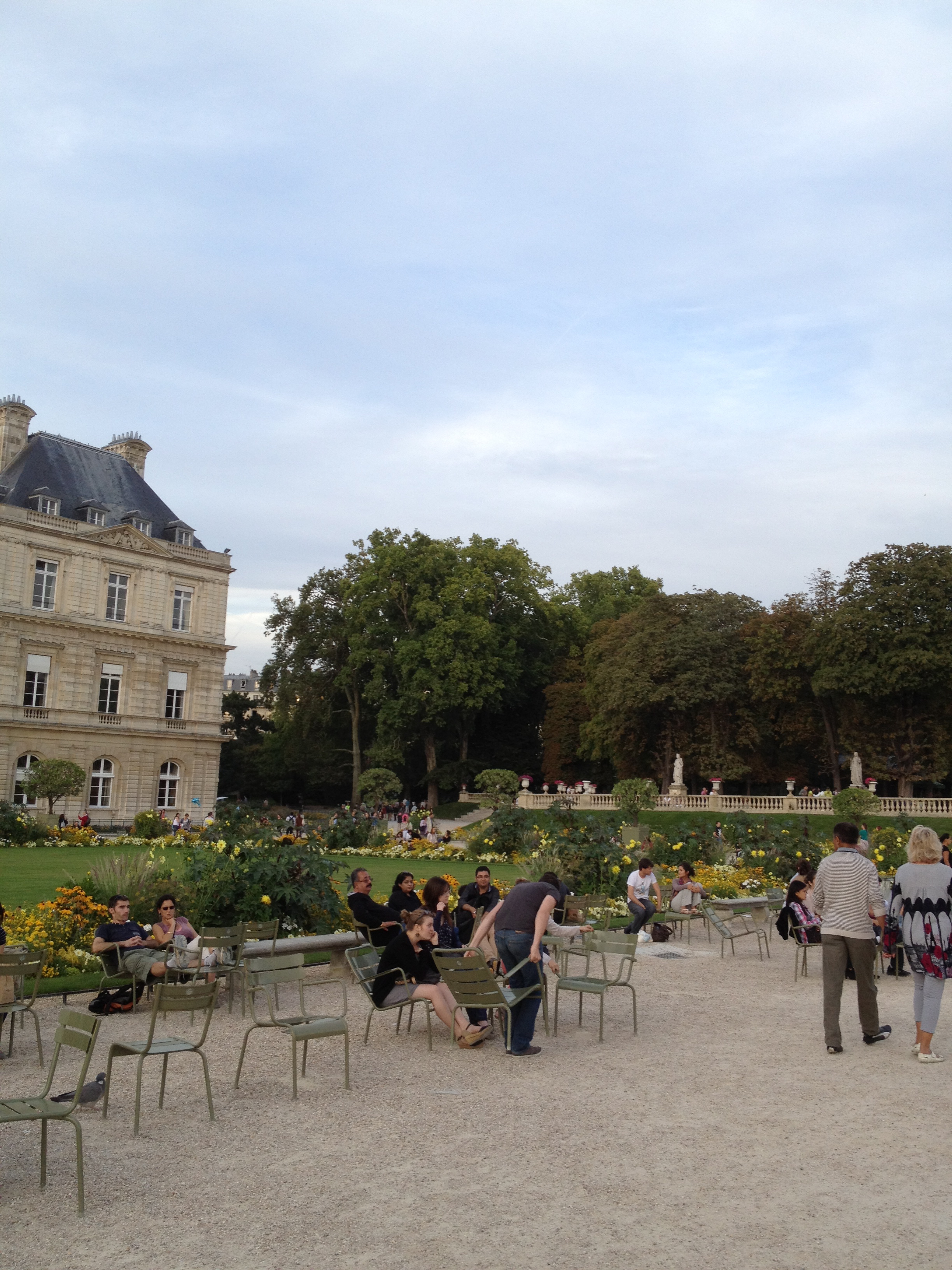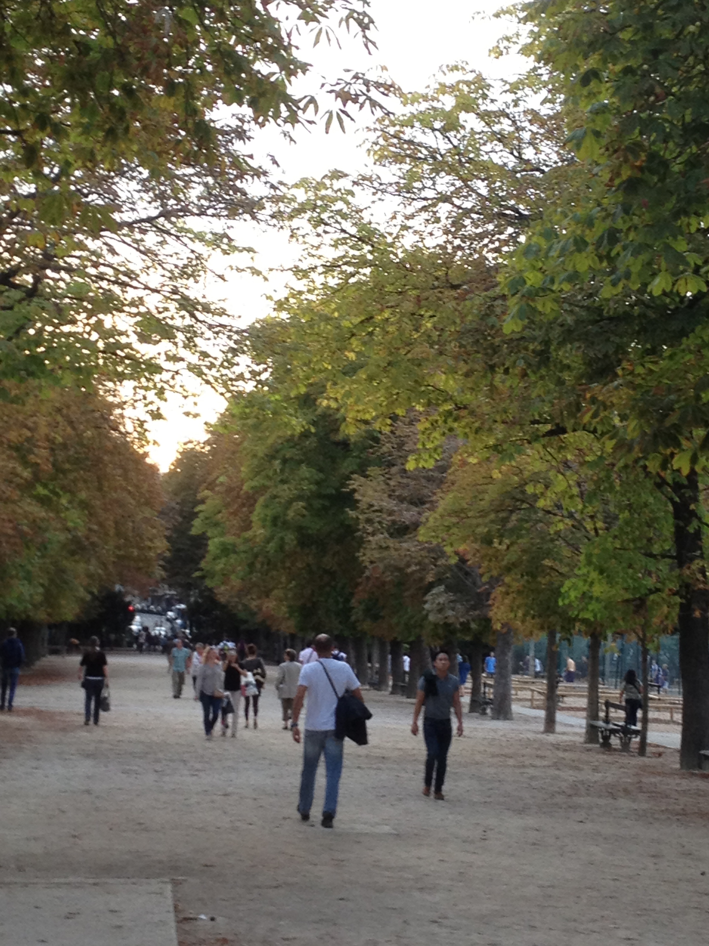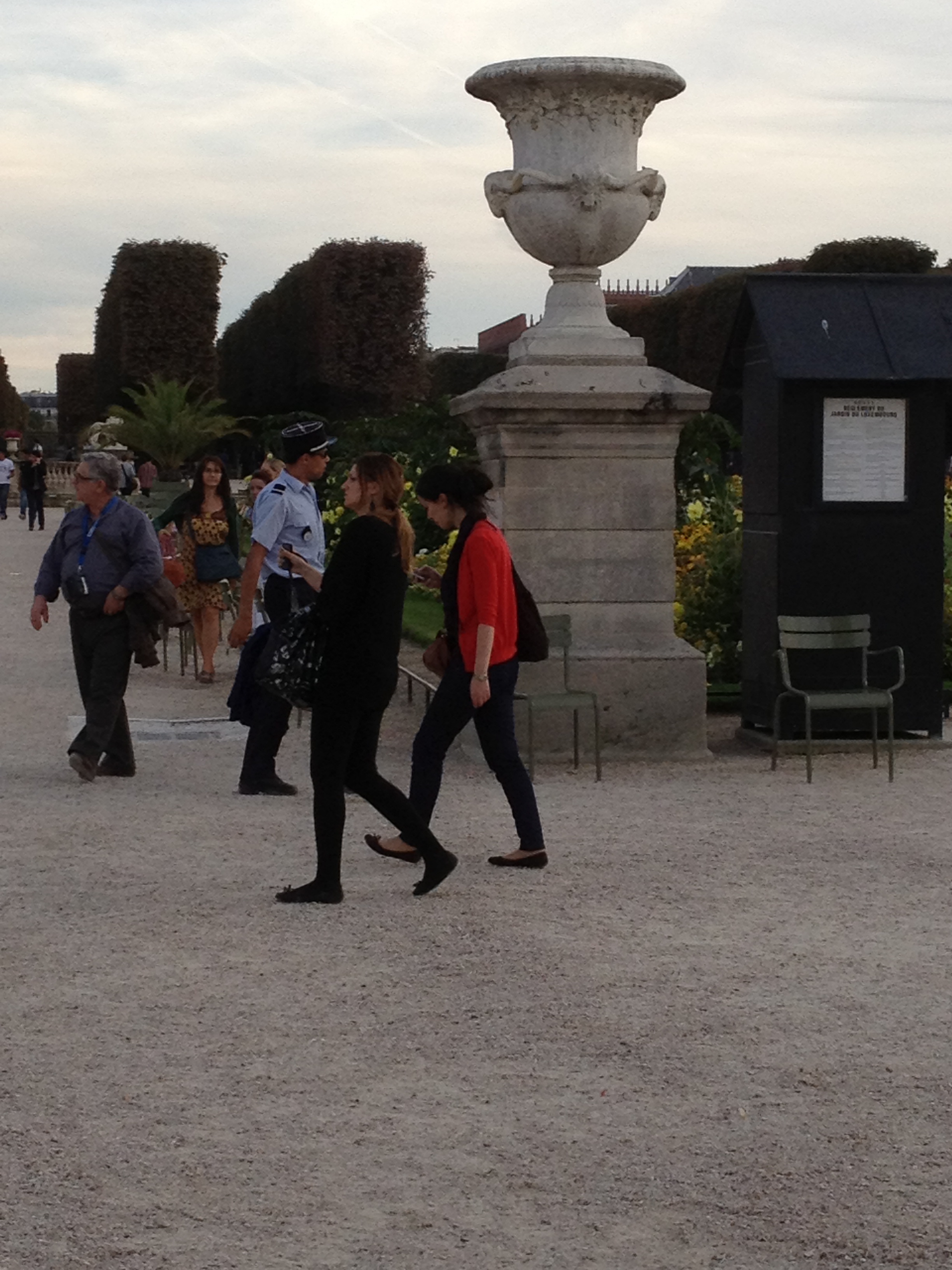 The park was buzzing with people, as it typically is on a warm, fall afternoon. Mark and I strolled in, walked around for a bit, and then grabbed a couple of the green chairs and relaxed into them. We hadn’t been seated more than a few minutes when an animated police whistle began chirping in the background. We commented that someone had clearly committed an egregious violation of park rules, such as sitting on the grass or kicking a soccer ball. But the whistle didn’t stop, and soon it was joined by what sounded like an entire chorus of whistles, in all different sound patterns. Then we began to see them- throngs of park police spreading out over the park, all blowing their whistles and yelling, “FERMETURE!”. People gradually began moving around us, dispersing toward the many different park exits, but at a leisurely pace. No one seemed concerned about the noisy whistles or commanding voices announcing the closure of the park. I guess they were used to it. After a few minutes the police began addressing people individually if the poor folks were not moving quickly enough to suit them. It was quite a sight- all those lounging, strolling people standing up and moving towards exits at once. The sudden activity kind of reminded me of an ant hill that got kicked over.