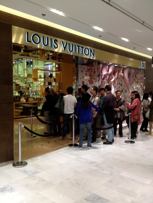 Here is something I don’t understand. Within the fancy department stores, there are small designer boutiques, which frequently are cordoned off like this one. A “guard” lets people in a few at a time, and the rest patiently stand there and gaze longingly at the wares within. At Christmas it’s really crazy- the lines to get in these “stores in a store” are long, the lines to pay in these small spaces are long, and it’s invariably hot and stuffy. No wonder people get cranky during the holidays. Geesh.