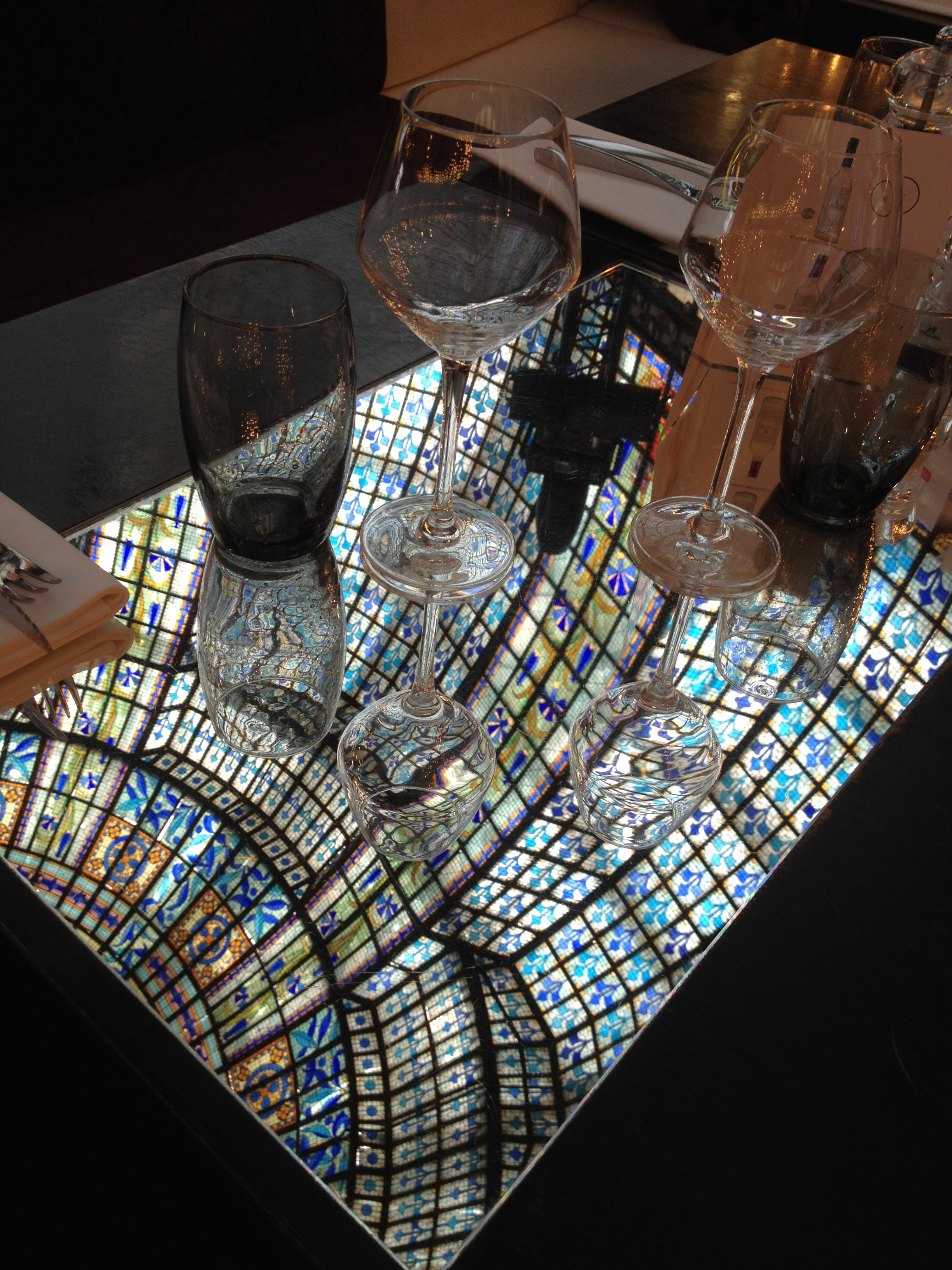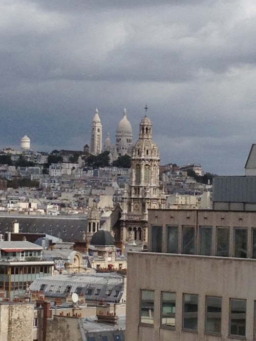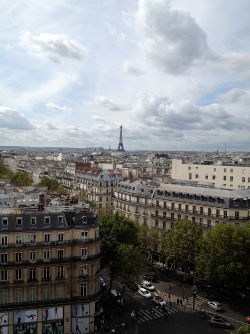 After lunch we went up one more floor, which is the roof-top bar and self-serve cafe. Not nearly as elegant, but with its own beautiful ceiling- the skyline of Paris.