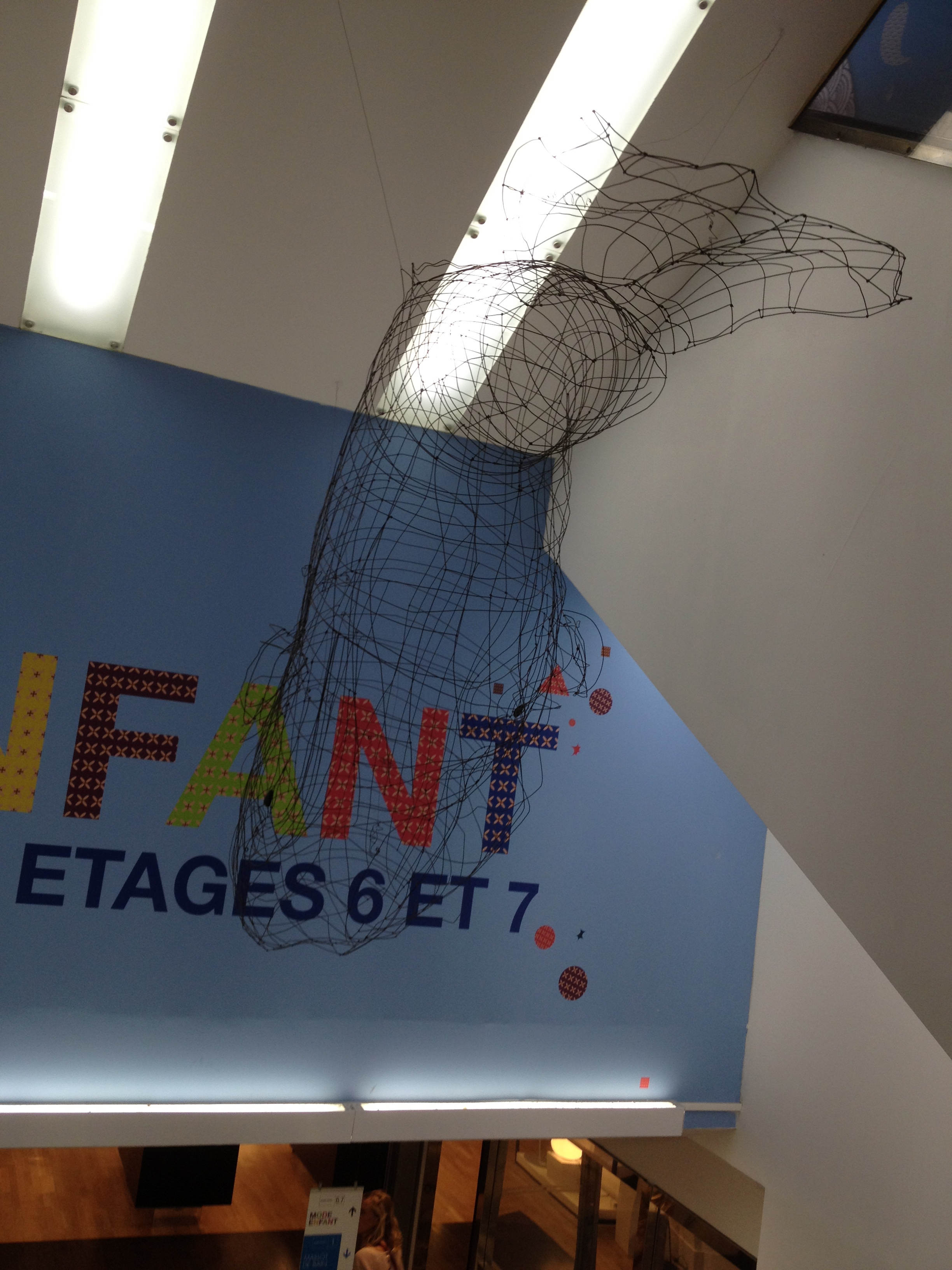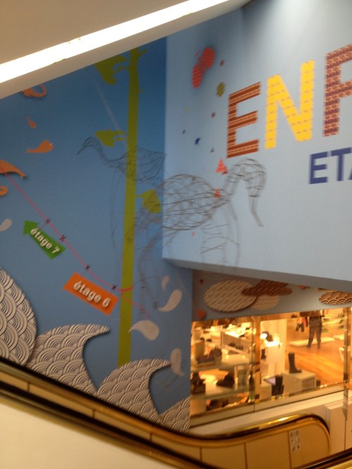 The route to the store restaurant was a long and windy one. I assume they are trying to whet one’s appetite for more than lunch. I loved the big wire sculptures of marine animals and birds suspended in the children’s departments.