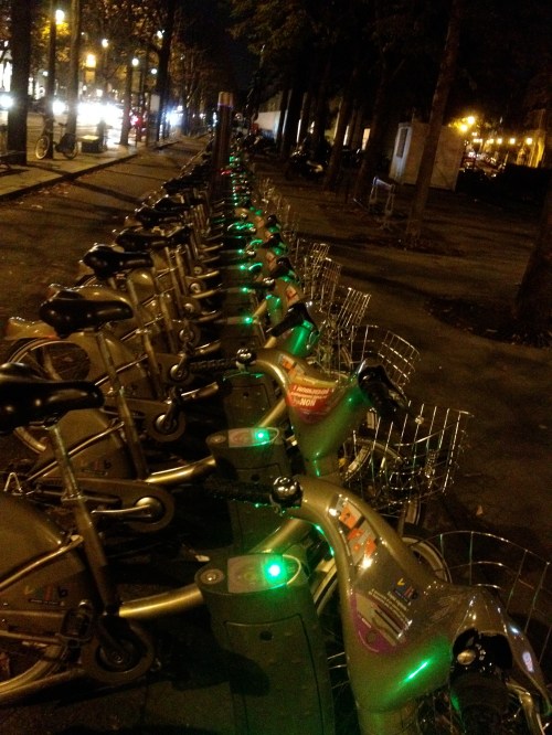 Heading back up the other side of Montaigne, I loved these Velibs (rental bikes) all lined up and glowing green.