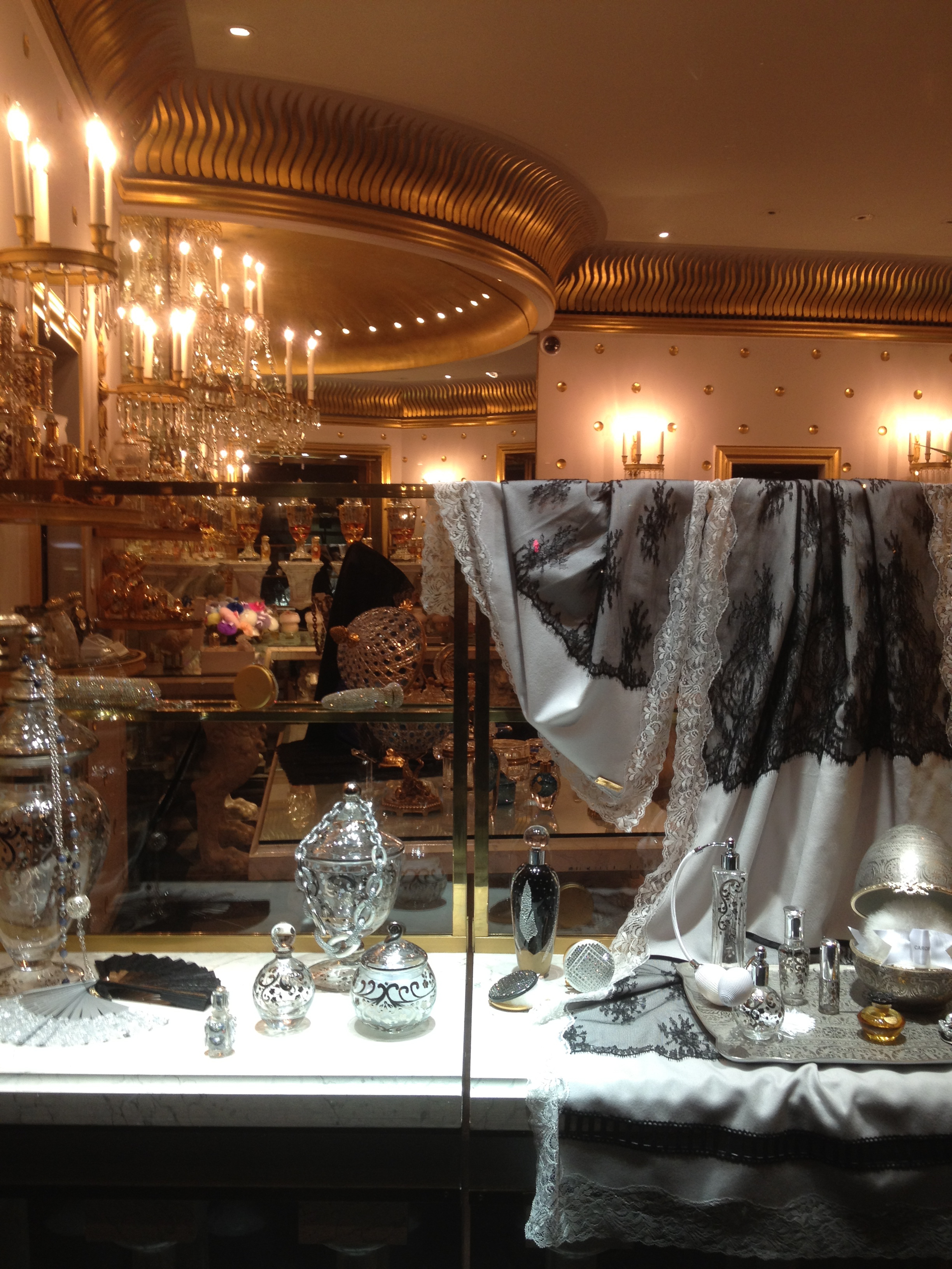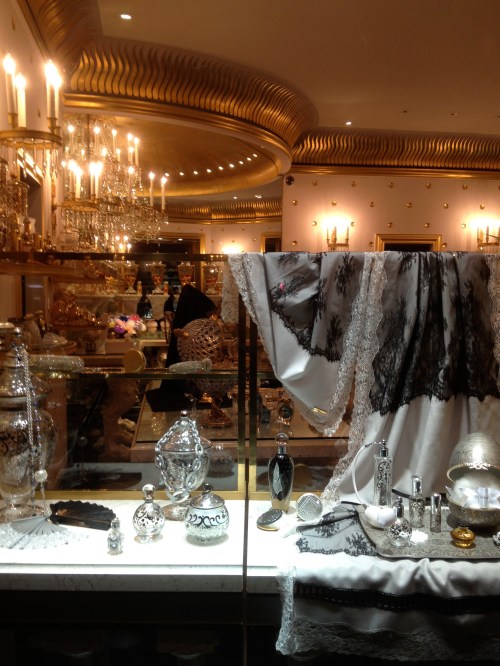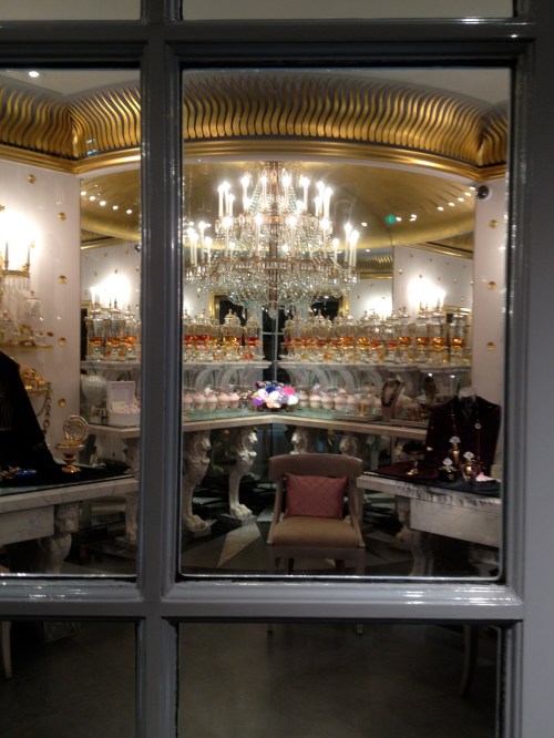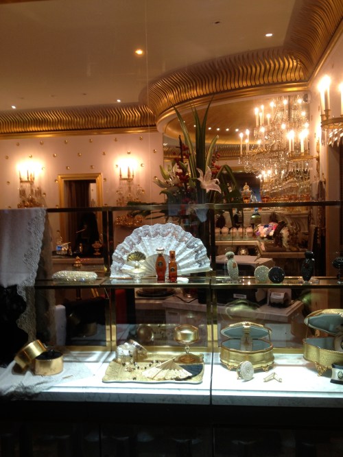 This store, Caron, is brimming with girly things like perfume and powder puffs and lots of gold stuff. I am sure some people look forward to visiting this store each time they are in Paris, but just looking in the windows makes me feel like I am getting a rash.