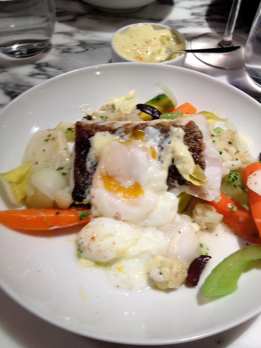 Delicious fish fillet on crispy vegetables with the glorious egg on top!