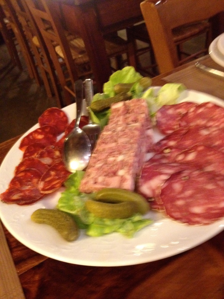 sausage, unidentified meat spread, and pickles also on the table for appetizers.