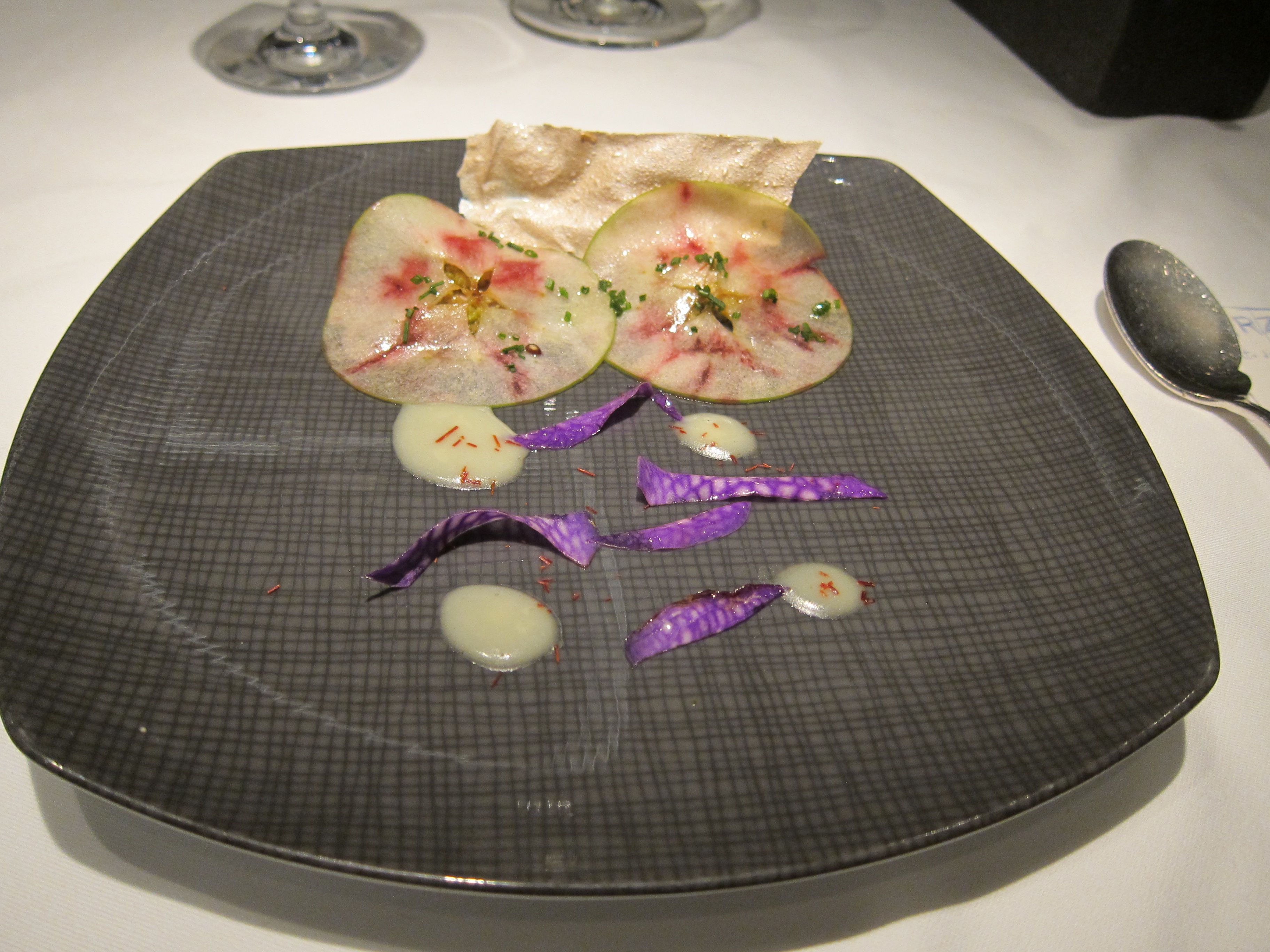 apple injected w beet root, accompanied by creamy foie gras and potato