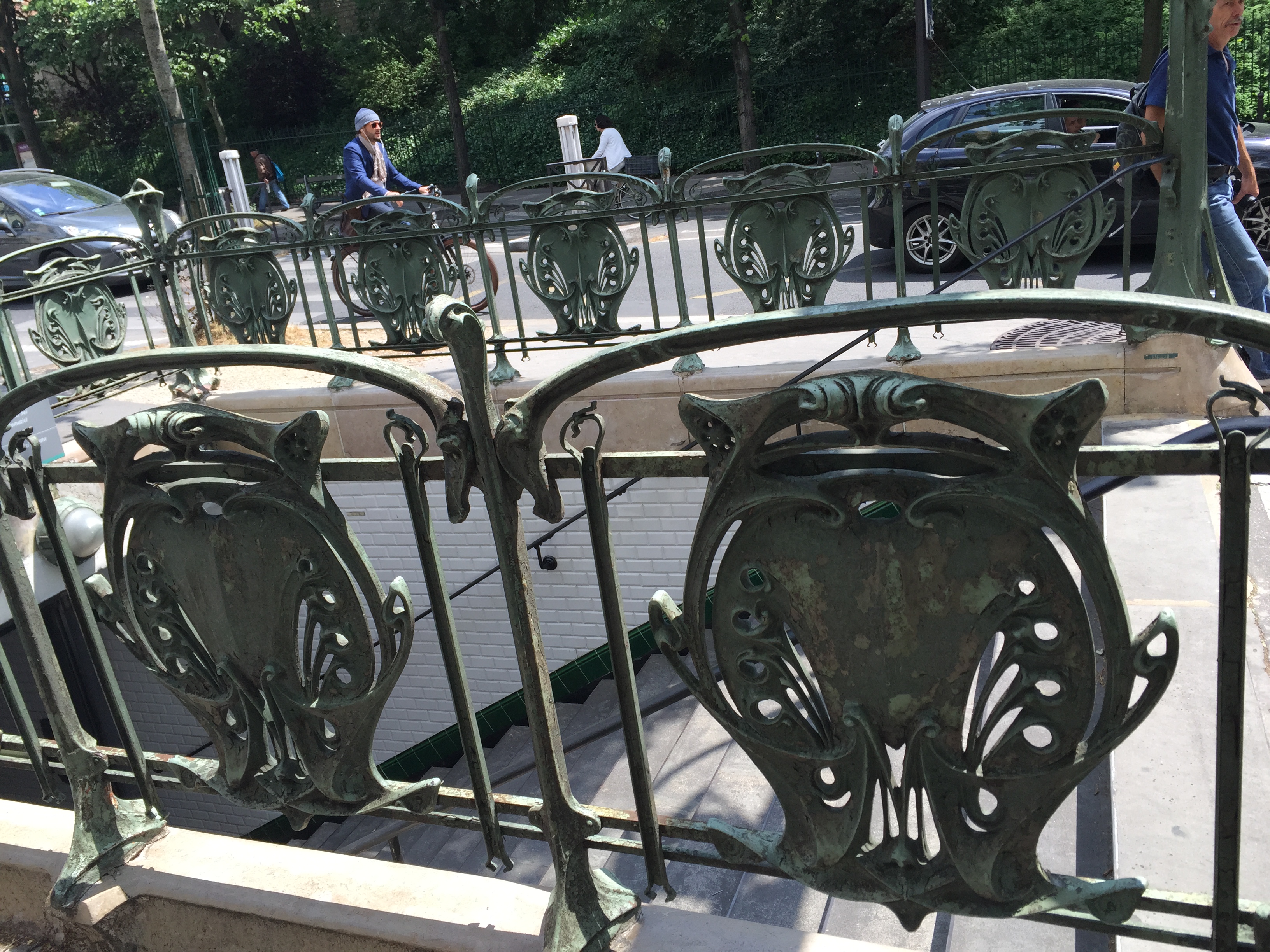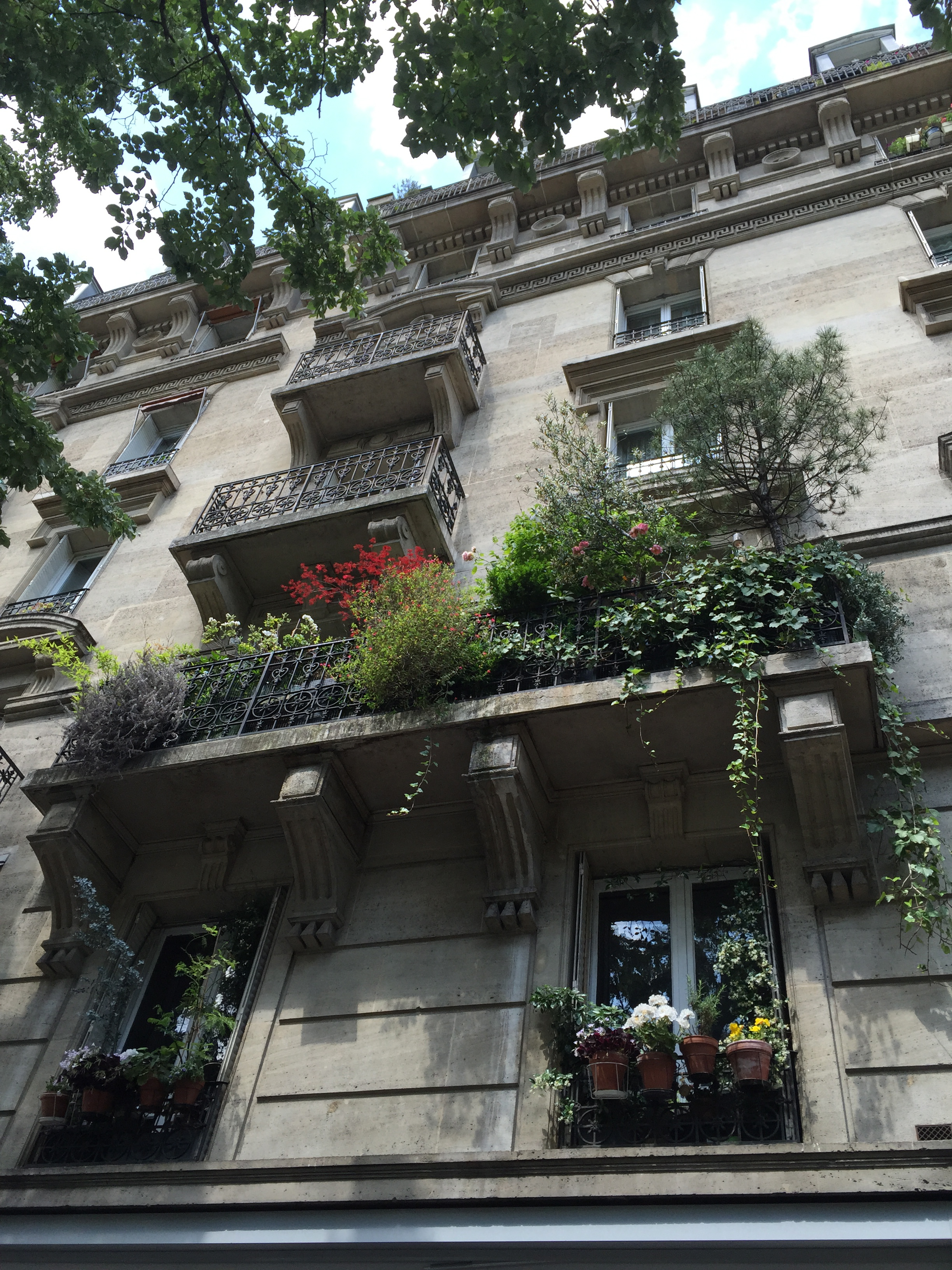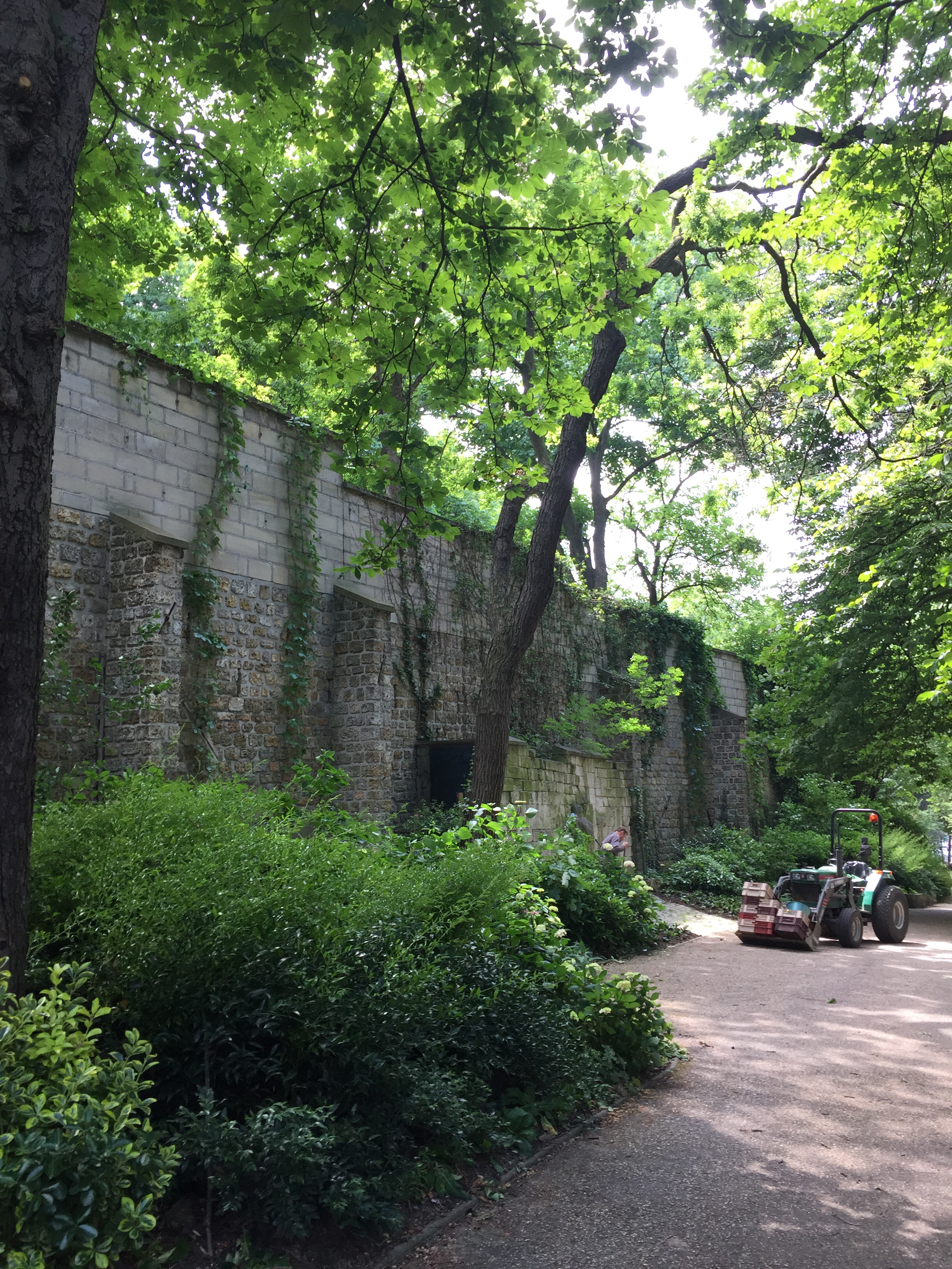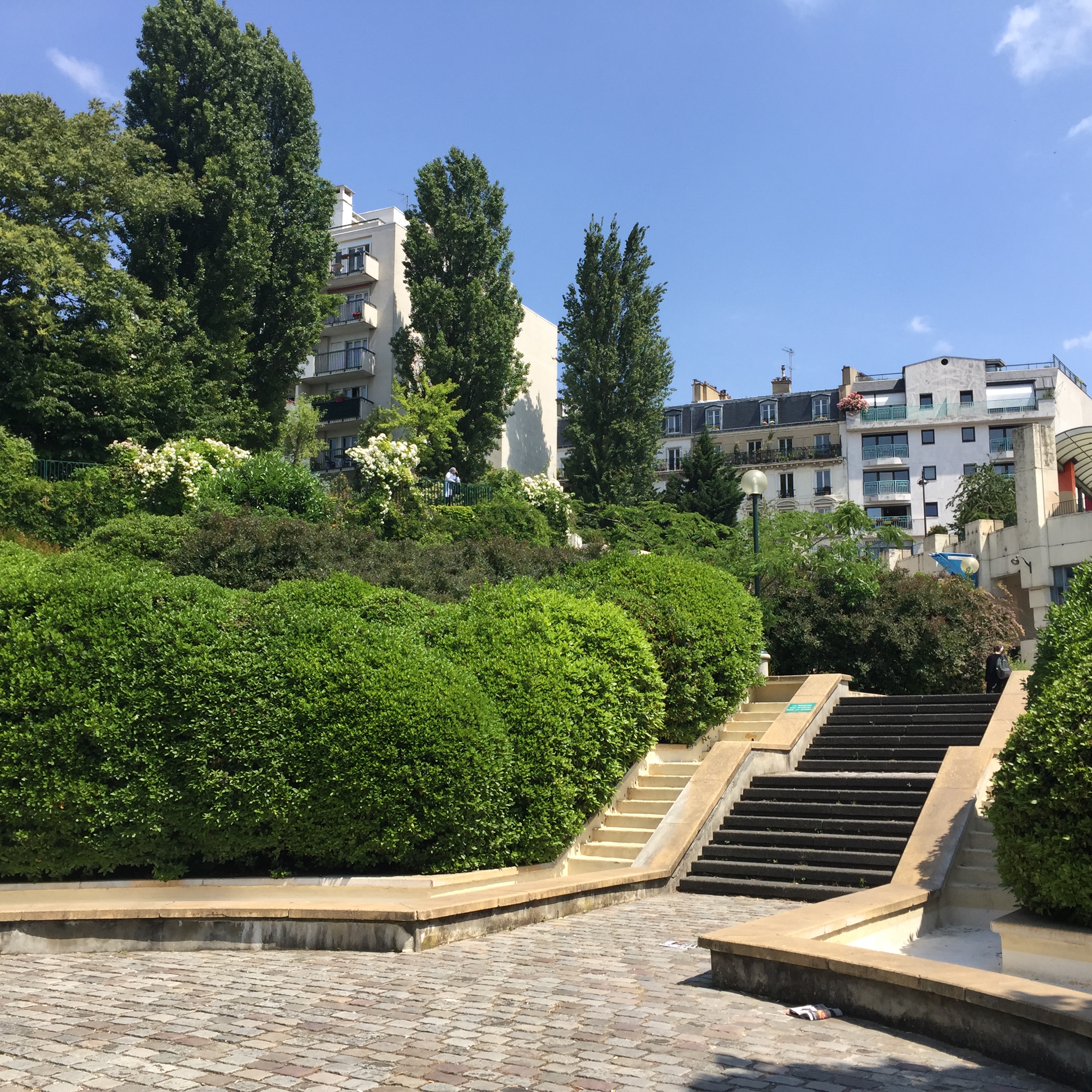 My first stop was Parc de Belleville. This relatively new park (I think it was opened in 1988) is built into a hillside and is a series of shady paths traversing the hill and stairs going up and down. It was serene on that late morning, with only a few people occupying shady benches and a small group of sun-worshippers having lunch in an open yard. IMG_2397 IMG_2395 IMG_2399 The park was nestled right up against apartment buildings, whose residents no doubt enjoy the view as well as the prime picnic opportunities. IMG_2398 IMG_2400 IMG_2401 And the view!! IMG_2402 Just outside a park exit was this inviting little cafe with a shady terrace. IMG_2407 I took a seat at one of the colorful tables and ordered the cheese and tomato tart. IMG_2403 IMG_2404 And then this happened. Don’t judge. I was climbing hills. I needed my strength. IMG_2405 Just across the street was this adorable building anchored by a boulangerie. I fantasized about living on the top floor. Yes, I would have been able to touch both sides of the apartment at the same time, and my bed would have to be placed diagonally. But I could rig a basket onto a rope pulley and send my money down and then pull a warm baguette or croissant back up through my window! And then I could eat them while admiring my view of the Eiffel Tower. How sweet would that be? IMG_2406 After that lunch, I had some walking to do. IMG_2409 IMG_2410 IMG_2413 I walked a long way up Rue Gambetta, which begins with this gorgeous Art Deco metro station. IMG_2414 IMG_2415 This street borders one side of the Pere Lachaise cemetery and offers a beautiful shady walk. IMG_2416 IMG_2396 IMG_2417 IMG_2419 IMG_2420 The street is also home to many elementary schools like this one. Each has a marble plaque commemorating the Jewish children who were removed from the schools and taken to camps with the cooperation of the Vichy government. It is difficult to visualize those scenes, how terrified and confused those poor children had to have been. IMG_2418 IMG_2424 IMG_2425 IMG_2427 I did not go to Place Sainte-Marthe on this trip to Belleville, but one of our very favorite restaurants is found there, Le Galopin. It’s well worth a trip off the beaten path the next time you are in Paris.