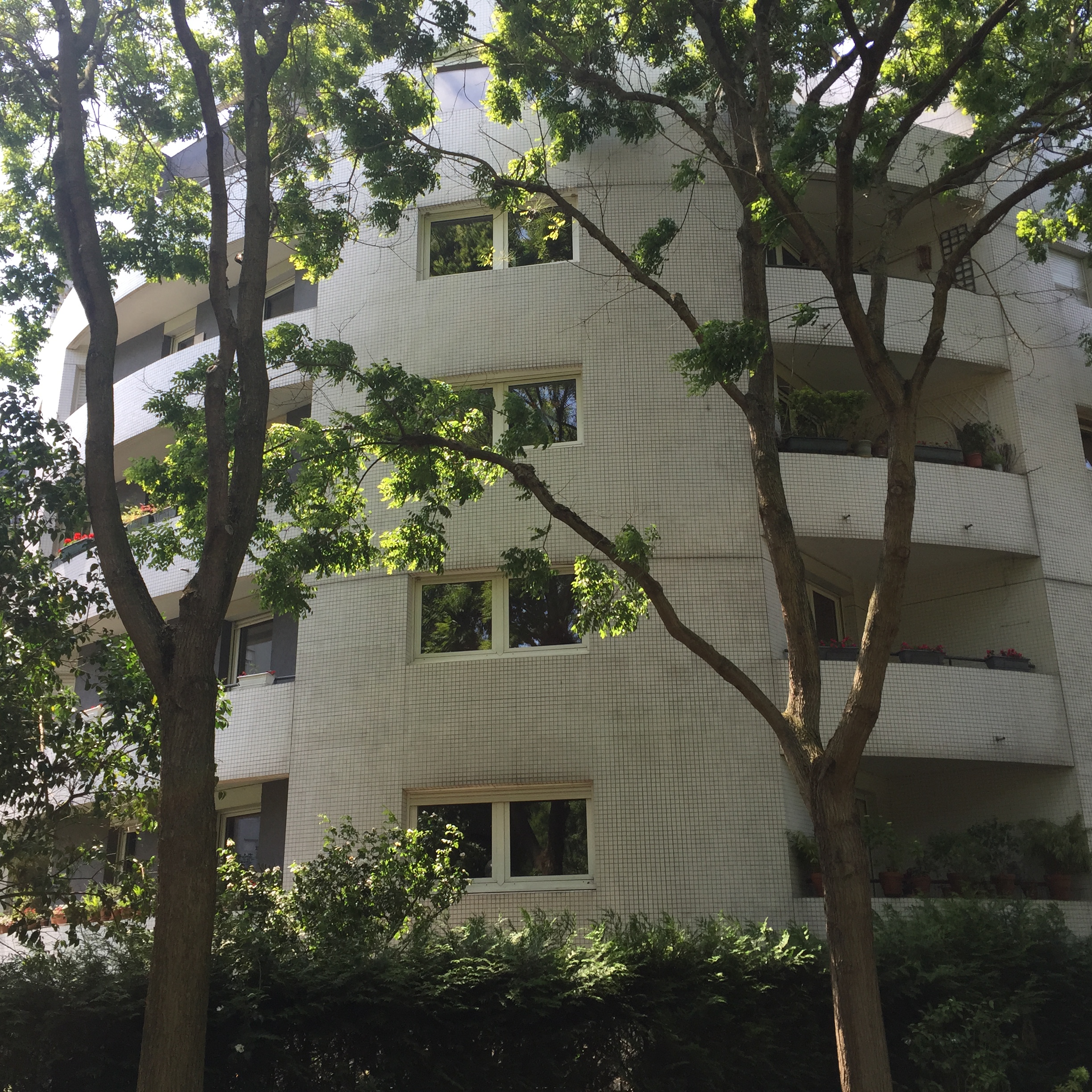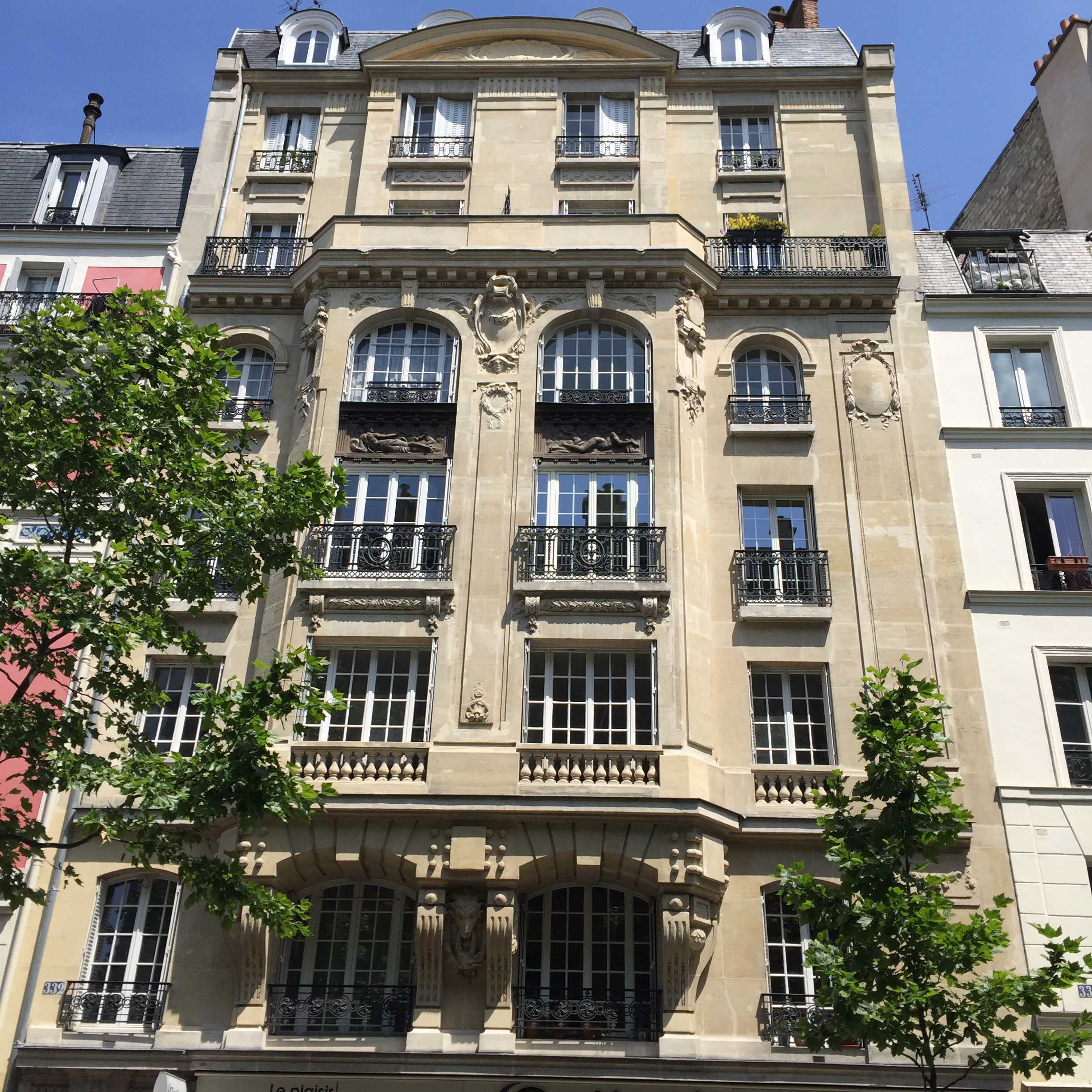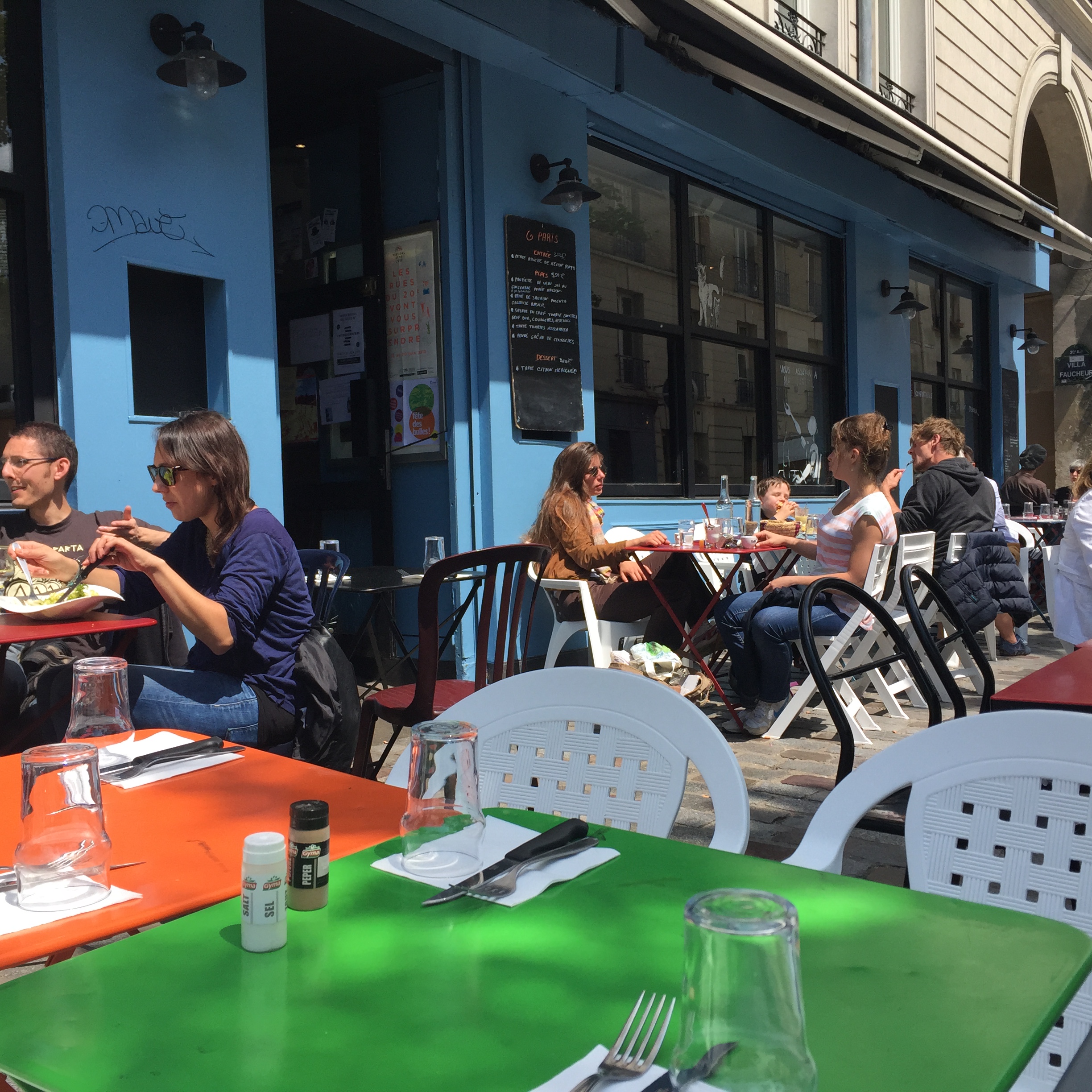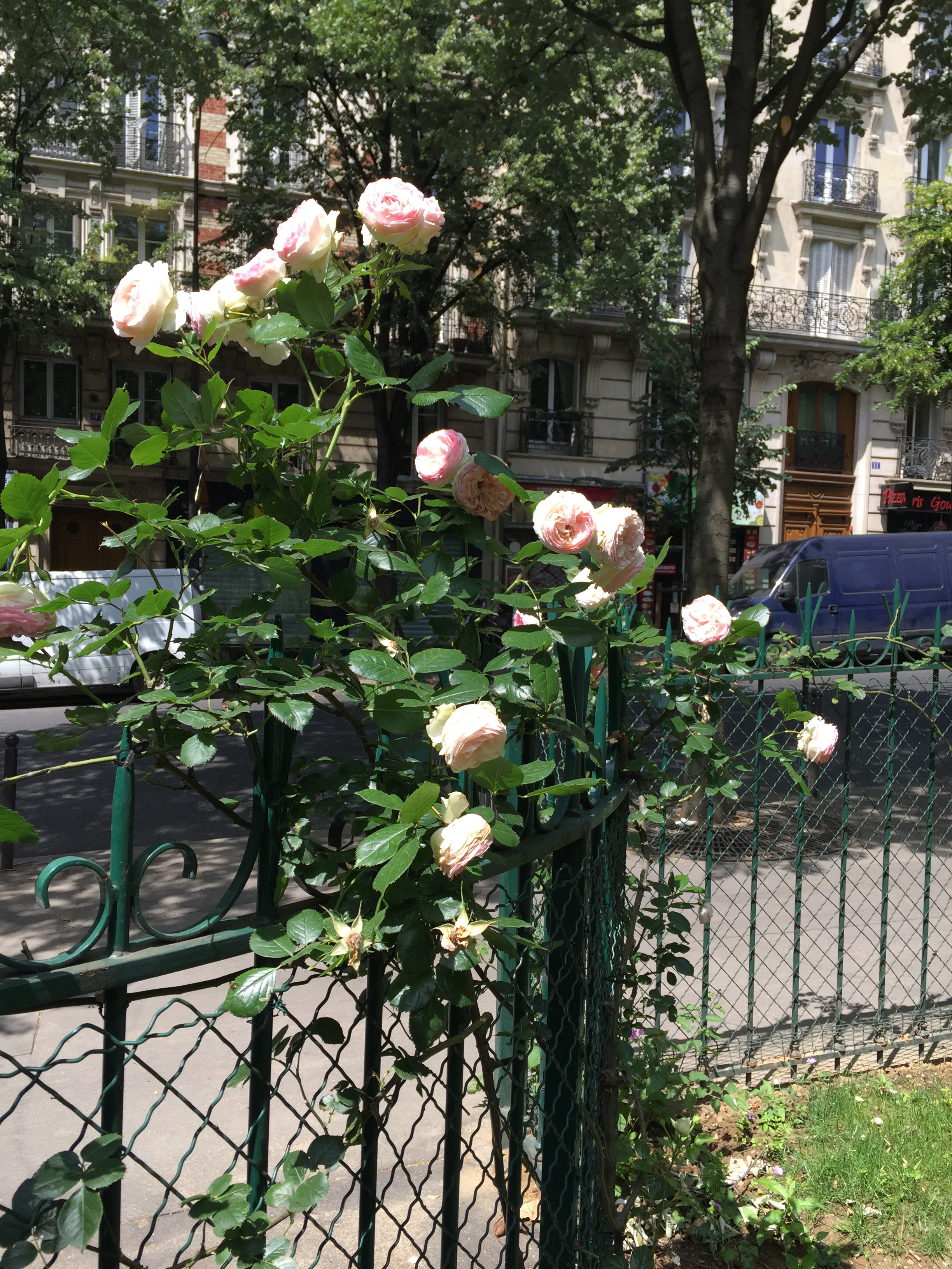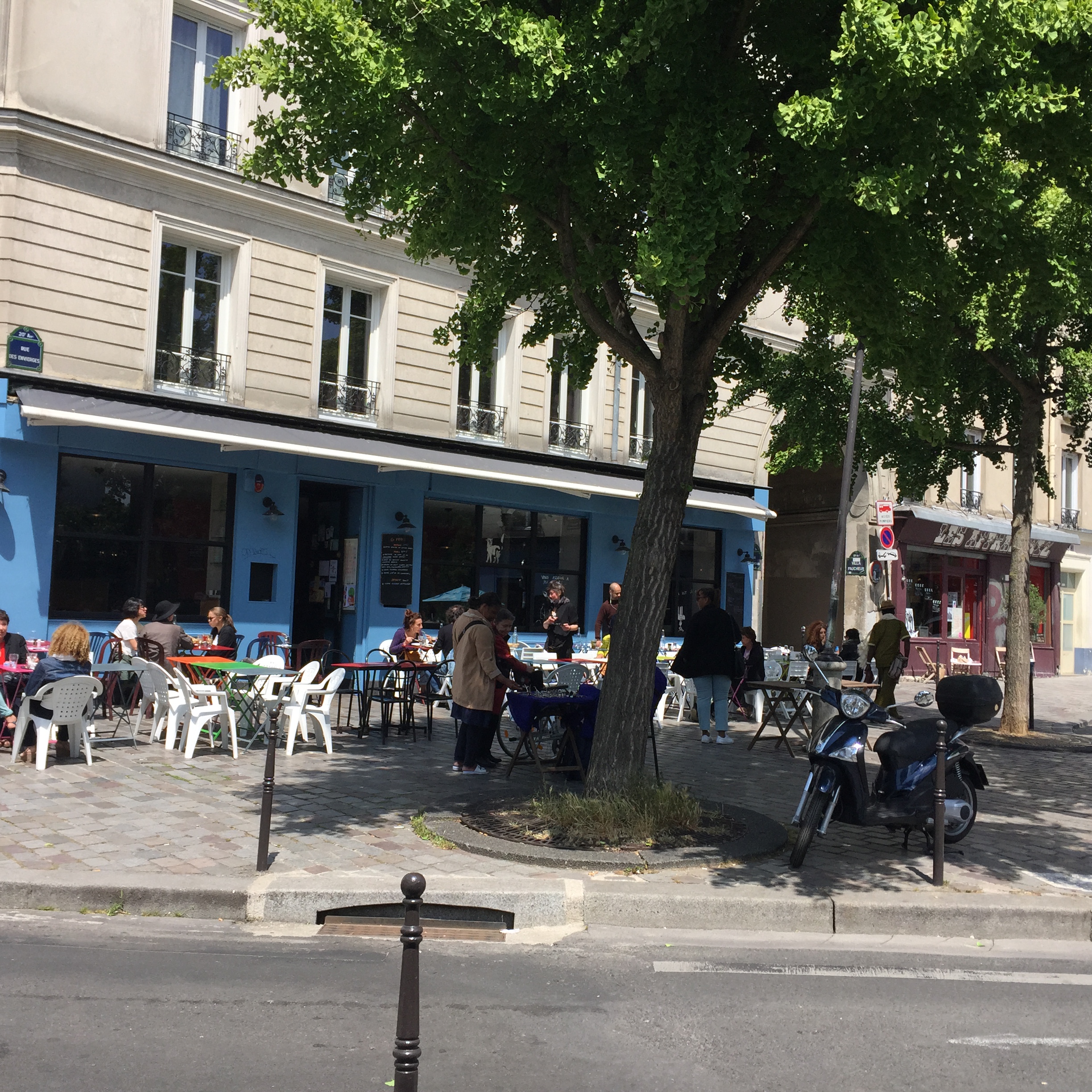 My first stop was Parc de Belleville. This relatively new park (I think it was opened in 1988) is built into a hillside and is a series of shady paths traversing the hill and stairs going up and down. It was serene on that late morning, with only a few people occupying shady benches and a small group of sun-worshippers having lunch in an open yard. IMG_2397 IMG_2395 IMG_2399 The park was nestled right up against apartment buildings, whose residents no doubt enjoy the view as well as the prime picnic opportunities. IMG_2398 IMG_2400 IMG_2401 And the view!! IMG_2402 Just outside a park exit was this inviting little cafe with a shady terrace. IMG_2407 I took a seat at one of the colorful tables and ordered the cheese and tomato tart. IMG_2403 IMG_2404 And then this happened. Don’t judge. I was climbing hills. I needed my strength. IMG_2405 Just across the street was this adorable building anchored by a boulangerie. I fantasized about living on the top floor. Yes, I would have been able to touch both sides of the apartment at the same time, and my bed would have to be placed diagonally. But I could rig a basket onto a rope pulley and send my money down and then pull a warm baguette or croissant back up through my window! And then I could eat them while admiring my view of the Eiffel Tower. How sweet would that be? IMG_2406 After that lunch, I had some walking to do. IMG_2409 IMG_2410 IMG_2413 I walked a long way up Rue Gambetta, which begins with this gorgeous Art Deco metro station. IMG_2414 IMG_2415 This street borders one side of the Pere Lachaise cemetery and offers a beautiful shady walk. IMG_2416 IMG_2396 IMG_2417 IMG_2419 IMG_2420 The street is also home to many elementary schools like this one. Each has a marble plaque commemorating the Jewish children who were removed from the schools and taken to camps with the cooperation of the Vichy government. It is difficult to visualize those scenes, how terrified and confused those poor children had to have been. IMG_2418 IMG_2424 IMG_2425 IMG_2427 I did not go to Place Sainte-Marthe on this trip to Belleville, but one of our very favorite restaurants is found there, Le Galopin. It’s well worth a trip off the beaten path the next time you are in Paris.