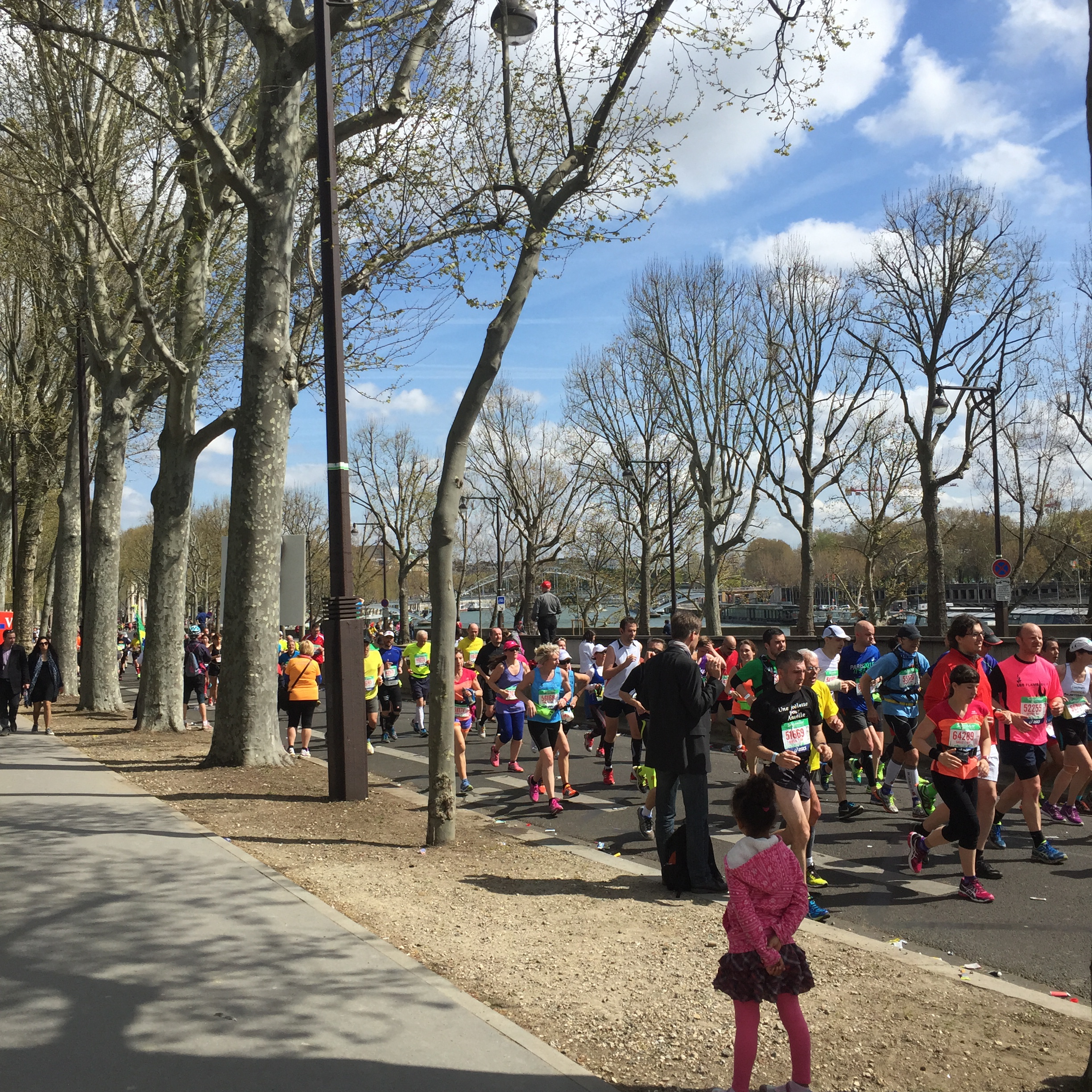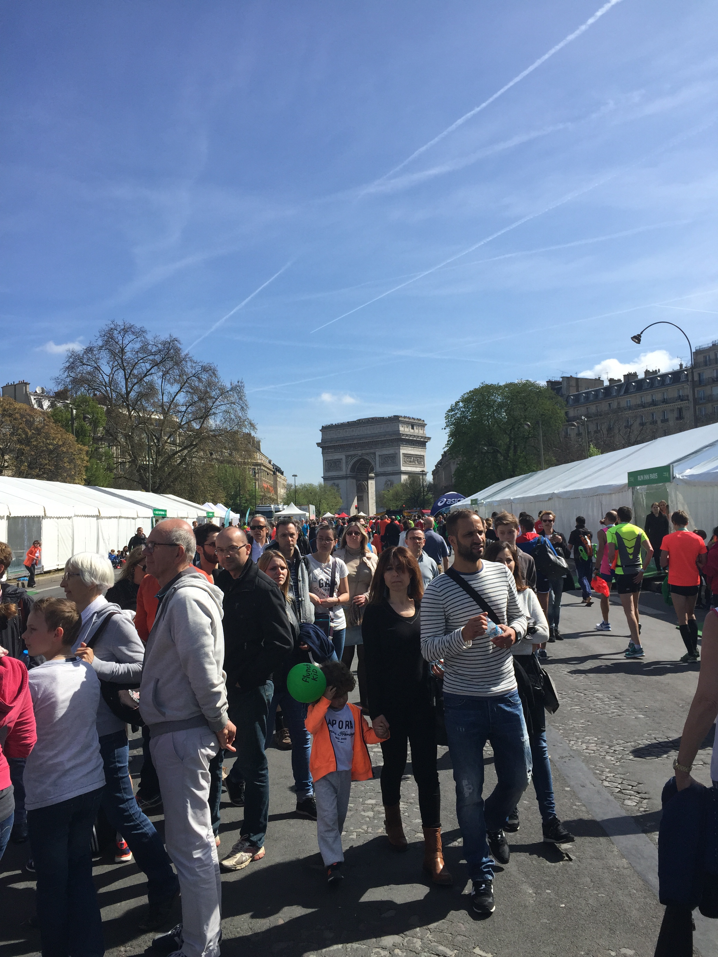 Yesterday seemed like it was the perfect day for the Paris marathon, though it might have been a tad warm for the runners by mile twenty or so. Several hours after the race began we walked to the start line at the Champs-Elysées. Some super-fast people were already hobbling around with their medals and their “Finisher” t-shirts. Any time we get a chance to walk on the Champs-Elysées when it is closed to traffic, we do it. Because it feels really cool, that’s why.