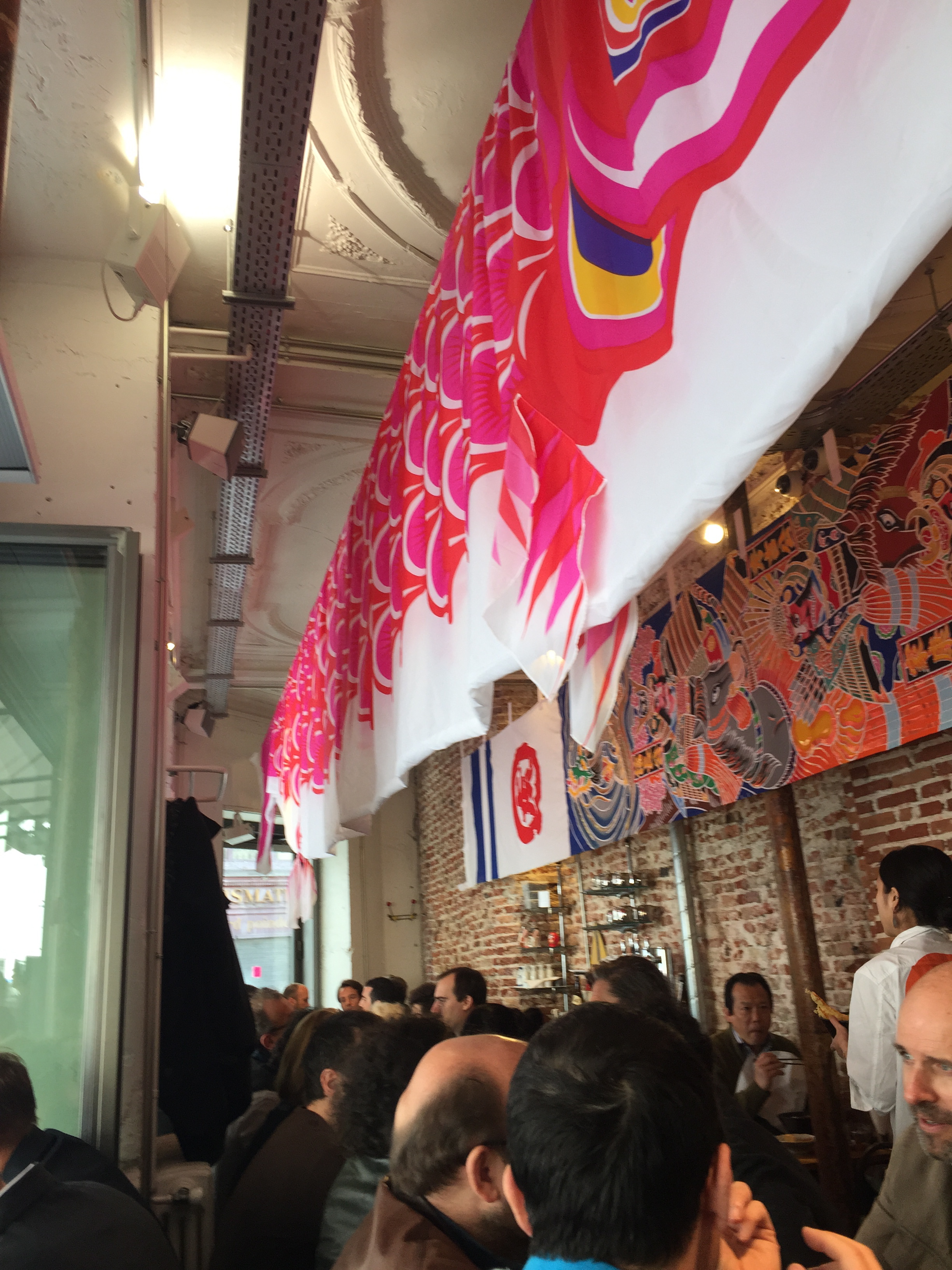 I took a walk that landed me at this tiny udon restaurant right at lunch time. Mark and I had noticed it several times and intended to try it out, and today seemed like as good a time as any. It was narrow, with an eating bar along the open windows, overlooking the sidewalk, and long tables about six inches behind those seats.