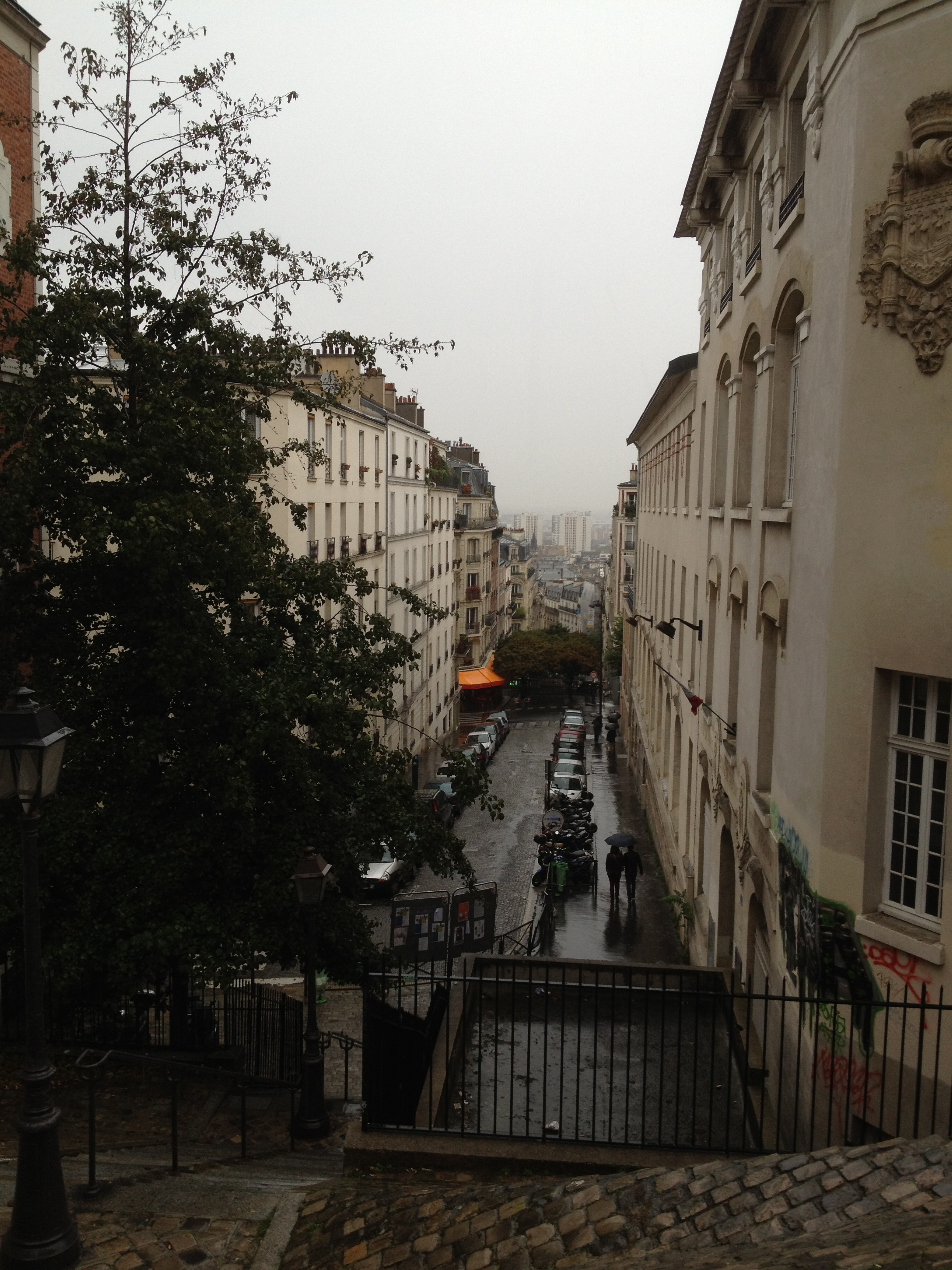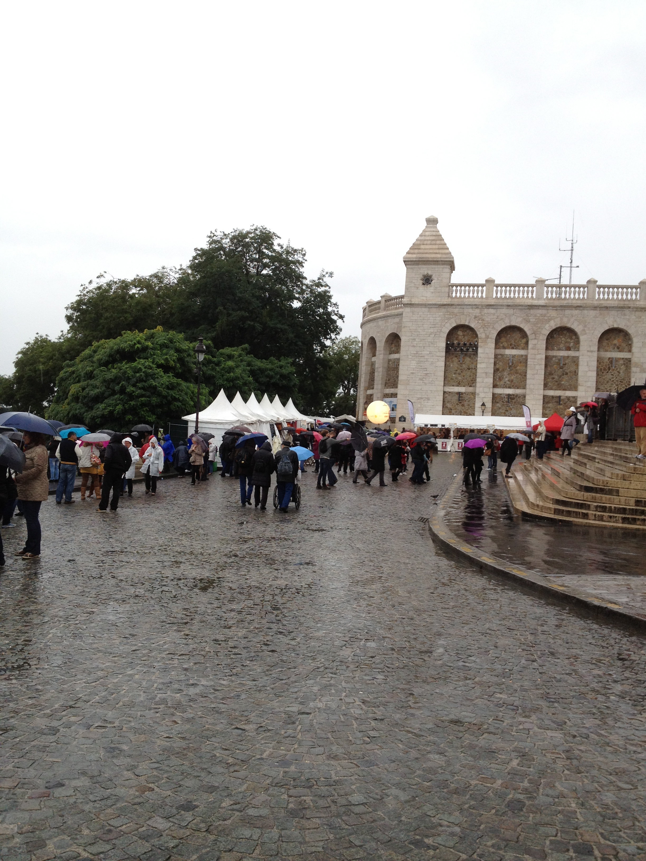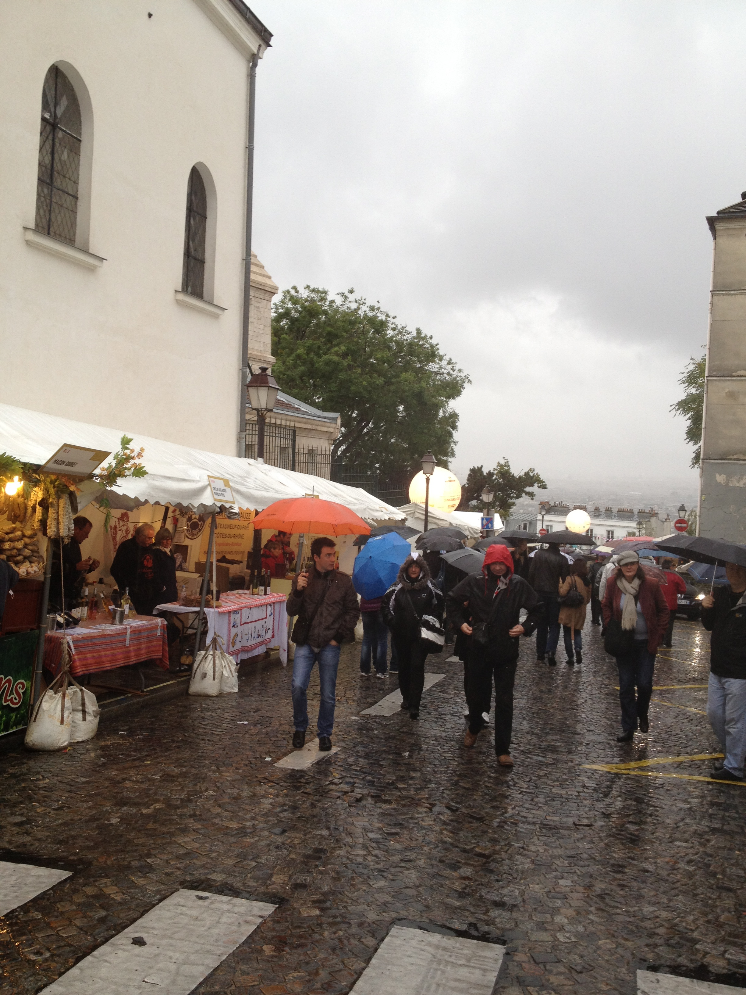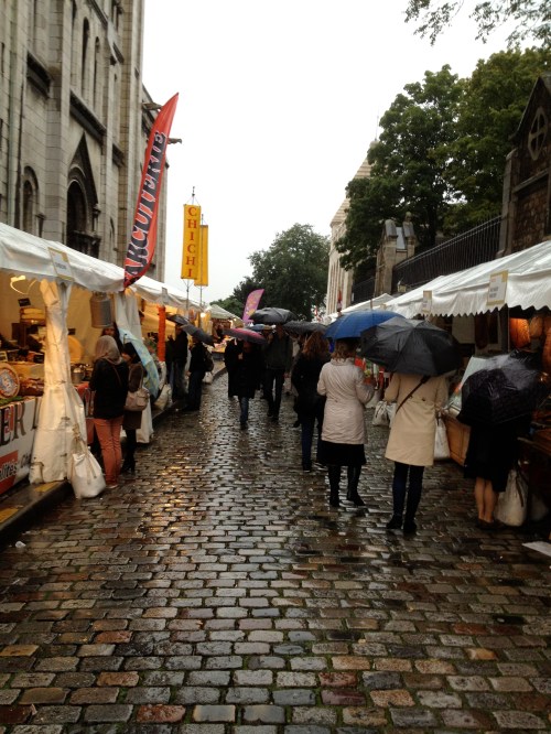 Saturday was not so bright. In fact, the whole weekend has been wet and grey. This was particularly unfortunate for the Fete de Vendange (“festival of the grape harvest”) going on in Montmartre. Mark and I braved the rain and checked it out for you. Booths wrapped around Sacre Coeur, offering tastes of wine, champagne, sausages, sandwiches, pastries, foie gras, and every other French delicacy you can think of. It was really fun, and would have been much more so if one hand had not been occupied with an umbrella. Also, let me just say that a rainy day in Montmartre is NOT the time you want to find out that your new boots are dangerously slippery on wet surfaces.