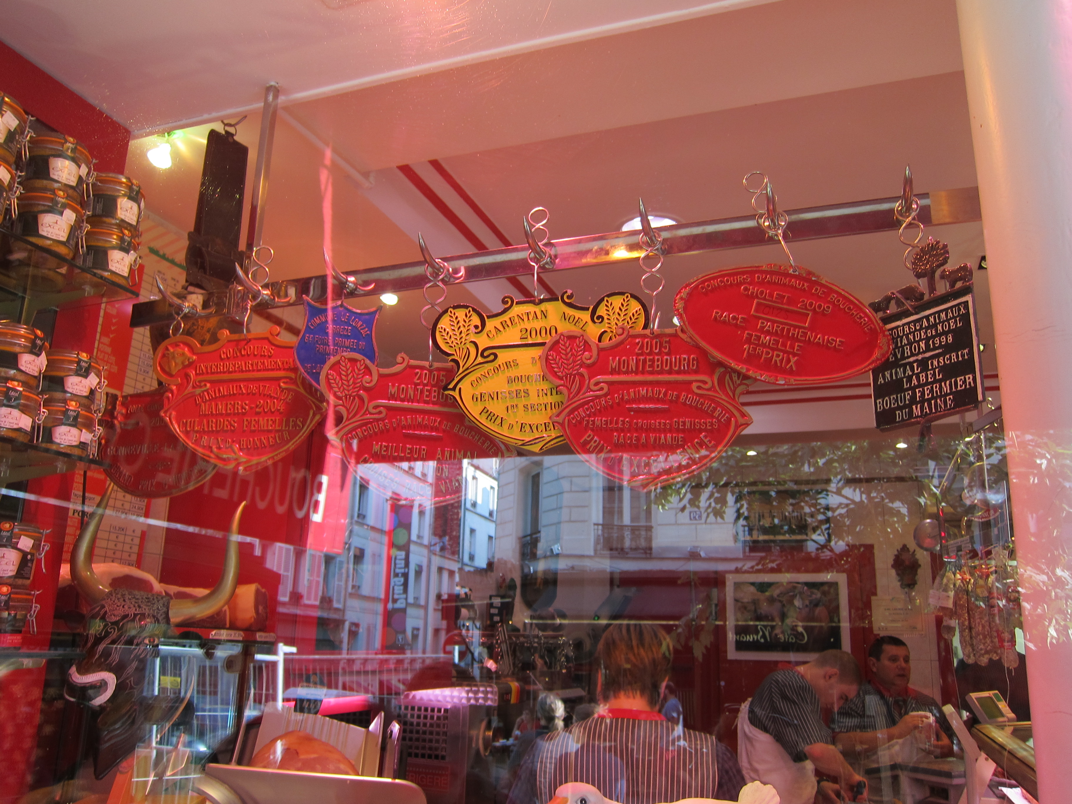 I apologize for the glare on this picture, but I wanted to show you the awards that this butcher has won (and there were a lot more on that bar in the window) and how they are proudly displayed in his window.