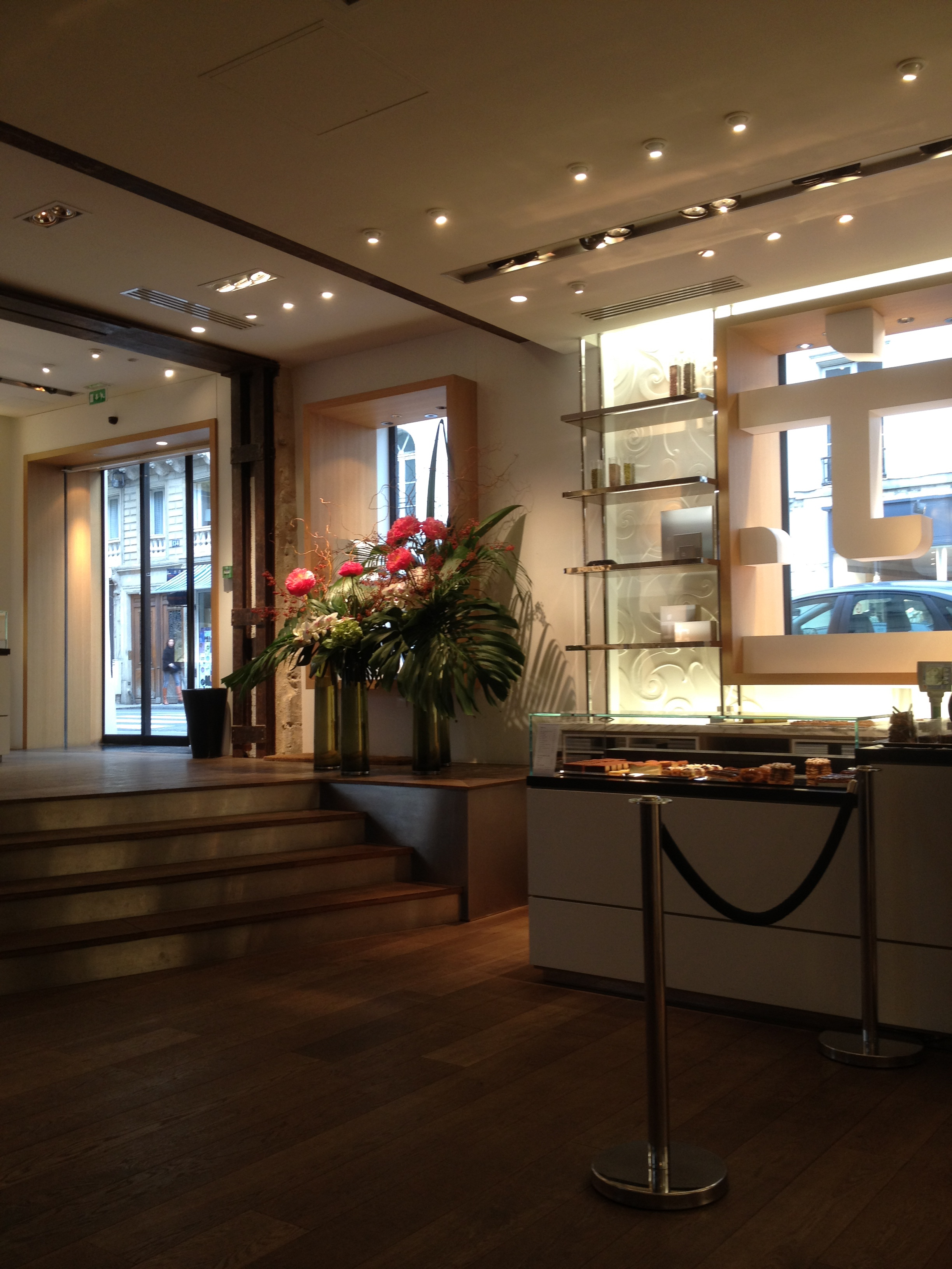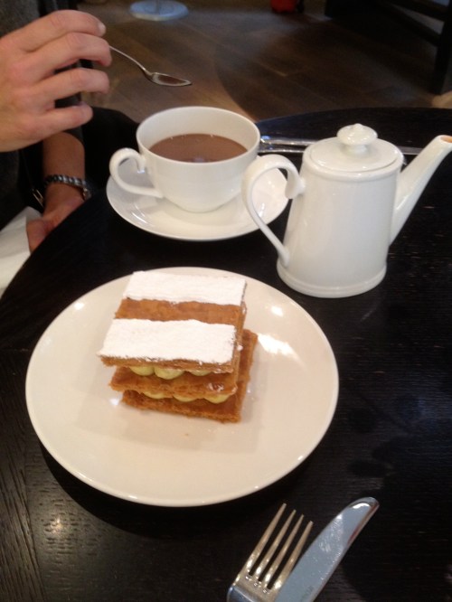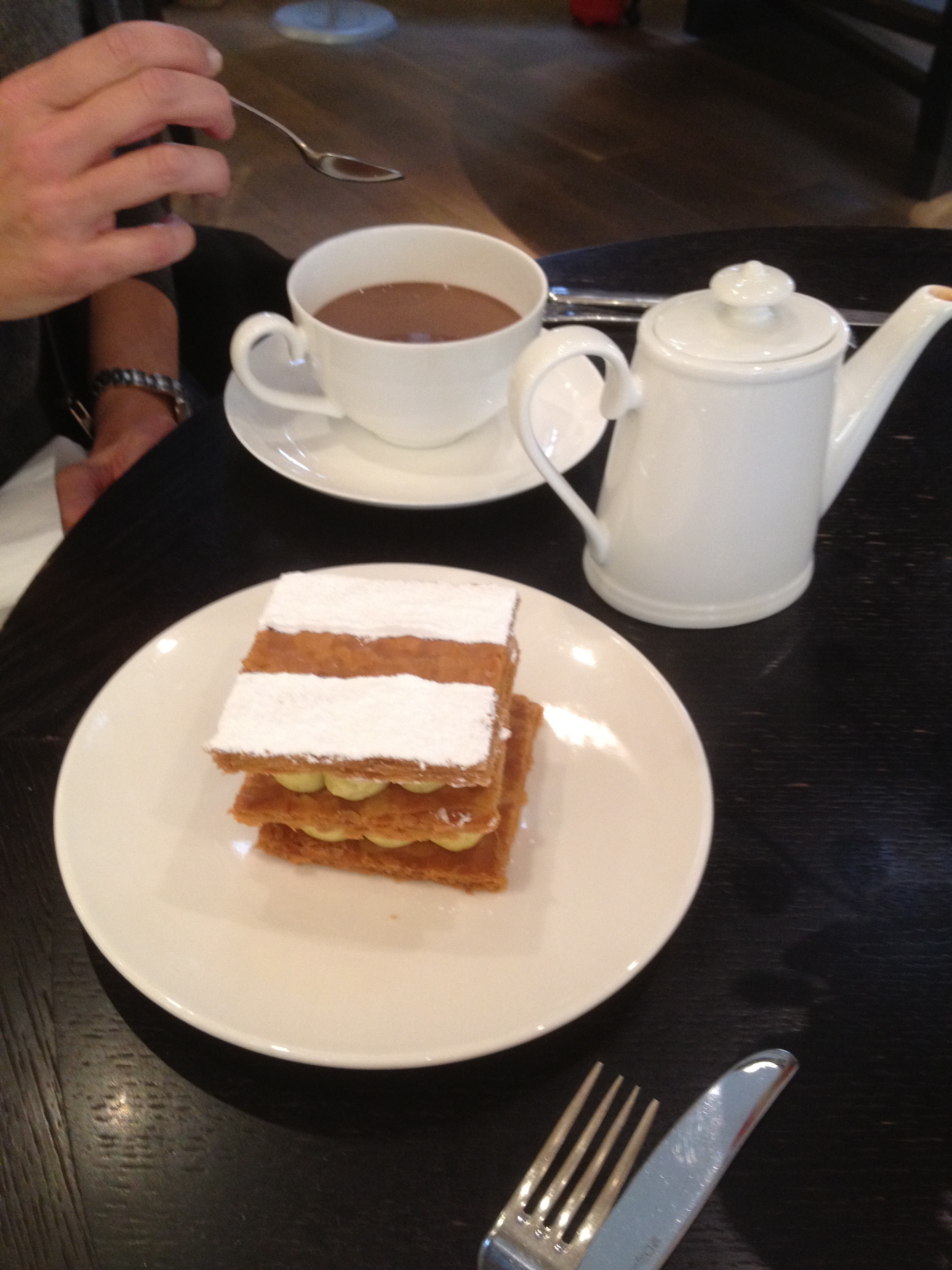 Immediately upon leaving the bakery, we realized that we were perilously close to one of the most stylish chocolate and pastry shops in Paris, where one can actually sit down and enjoy rich hot chocolate and amazing pastries. “One” =”We” and yes we did. It was so wrong.