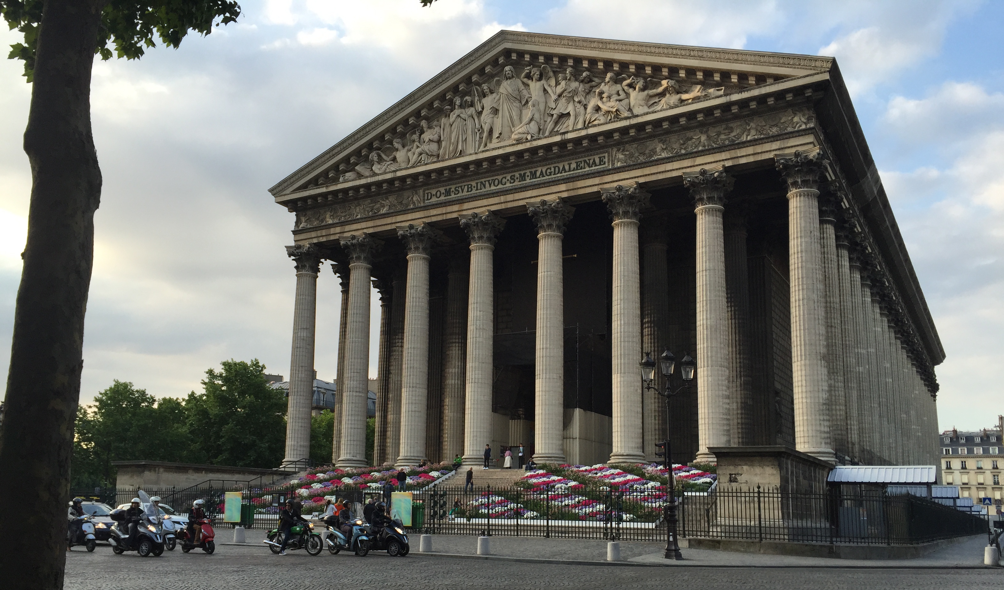 I have never been inside this church, Madeleine, so I don’t know about its windows. But right now it has a glorious floral display across its front steps.
