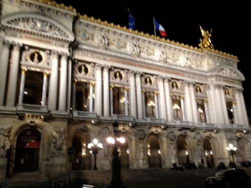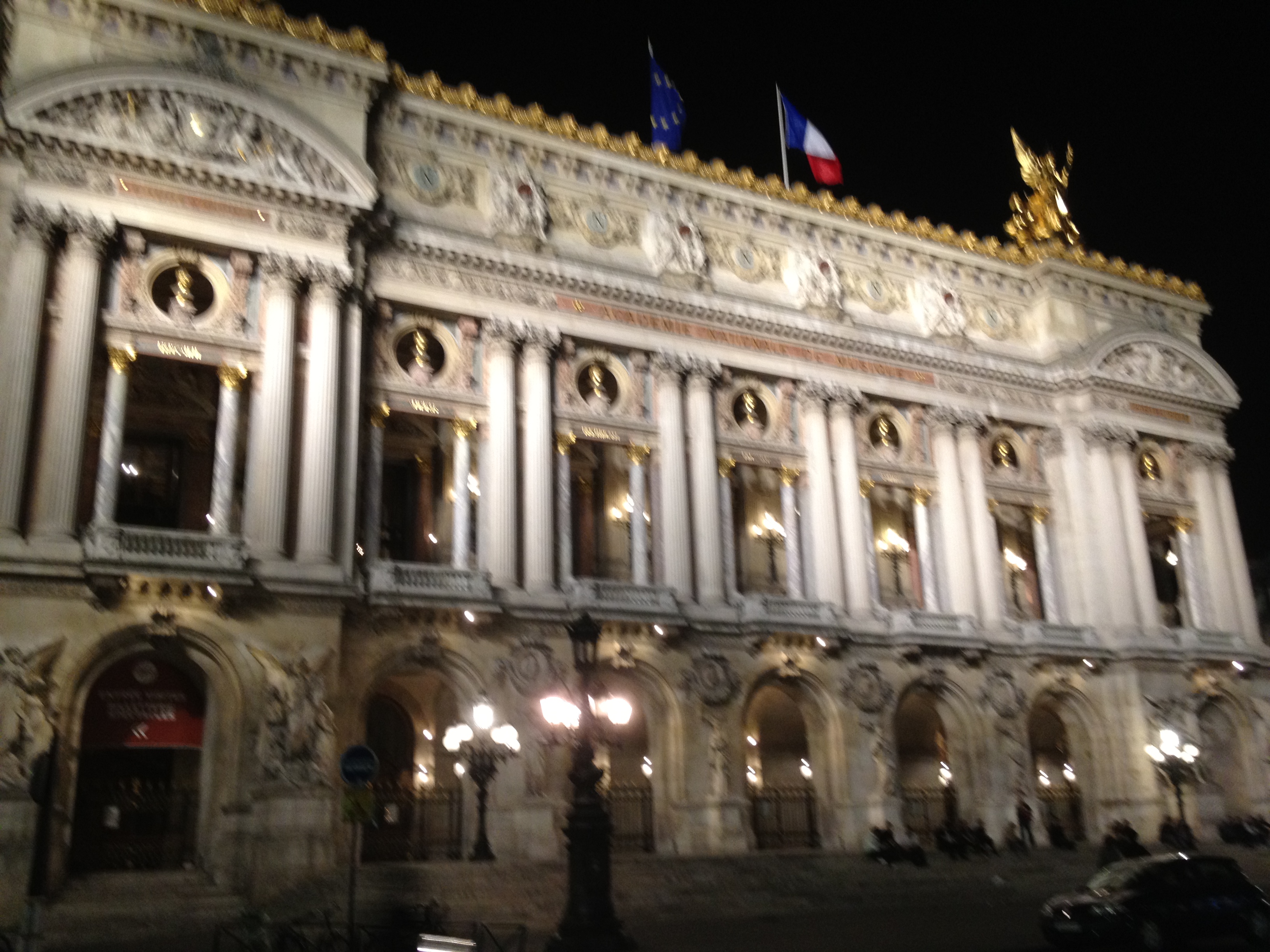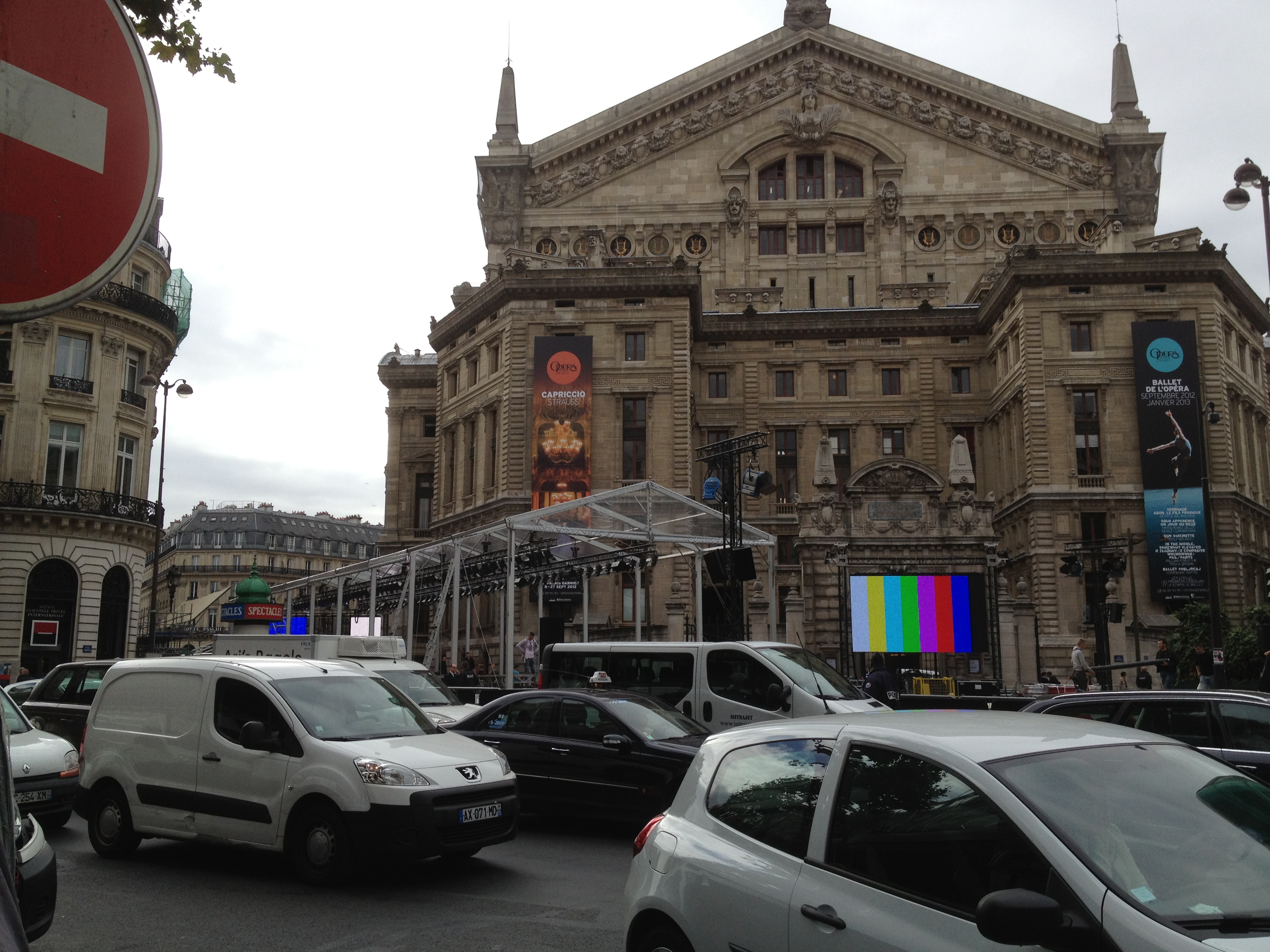 That gorgeous building is the Garnier Opera House, which is directly across the street from Galeries Lafayette. The bleachers were set up under the covered area, alongside the catwalk, which then continued out in the open, where the crowd gathered .Does this help?