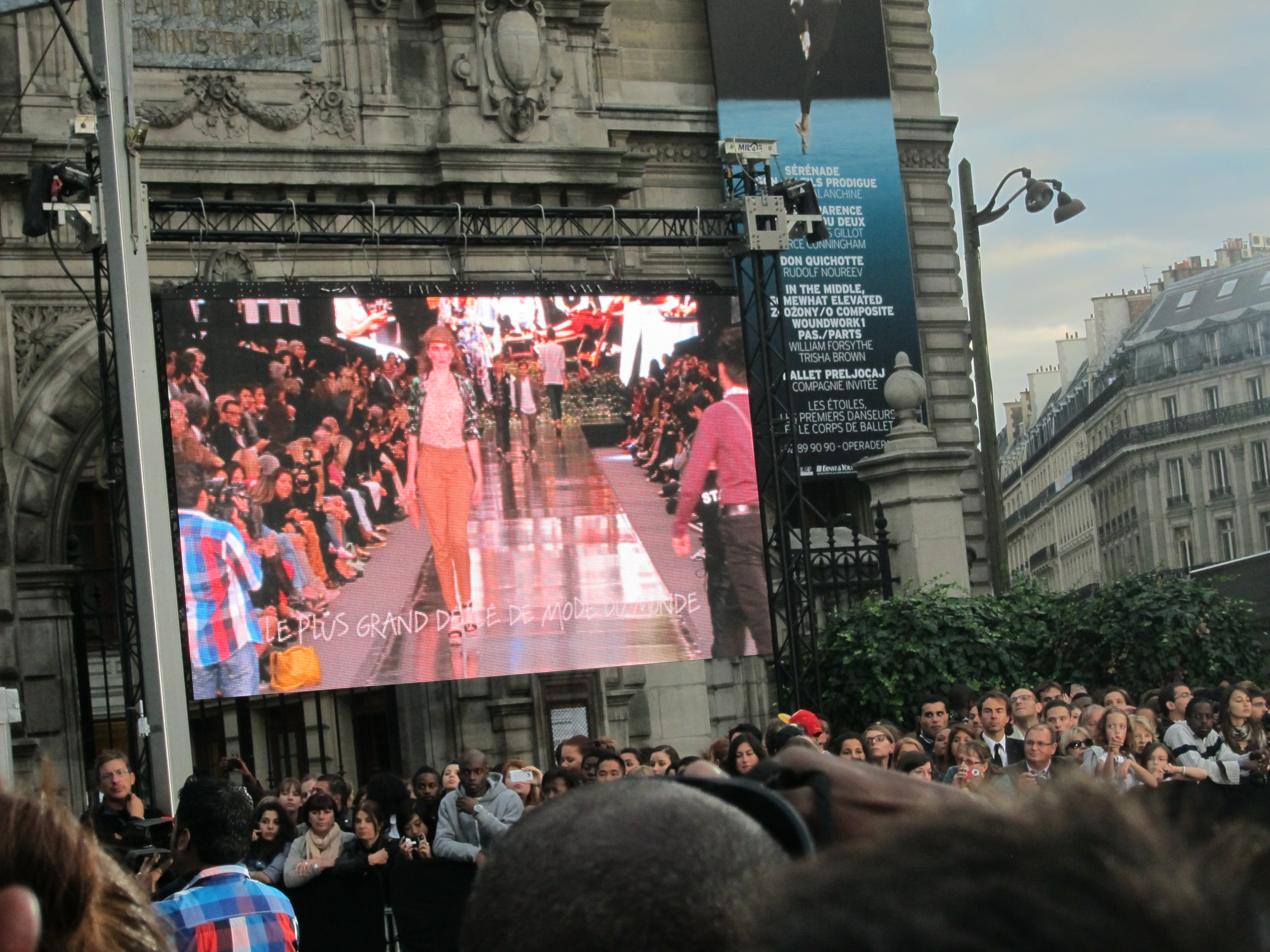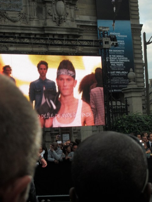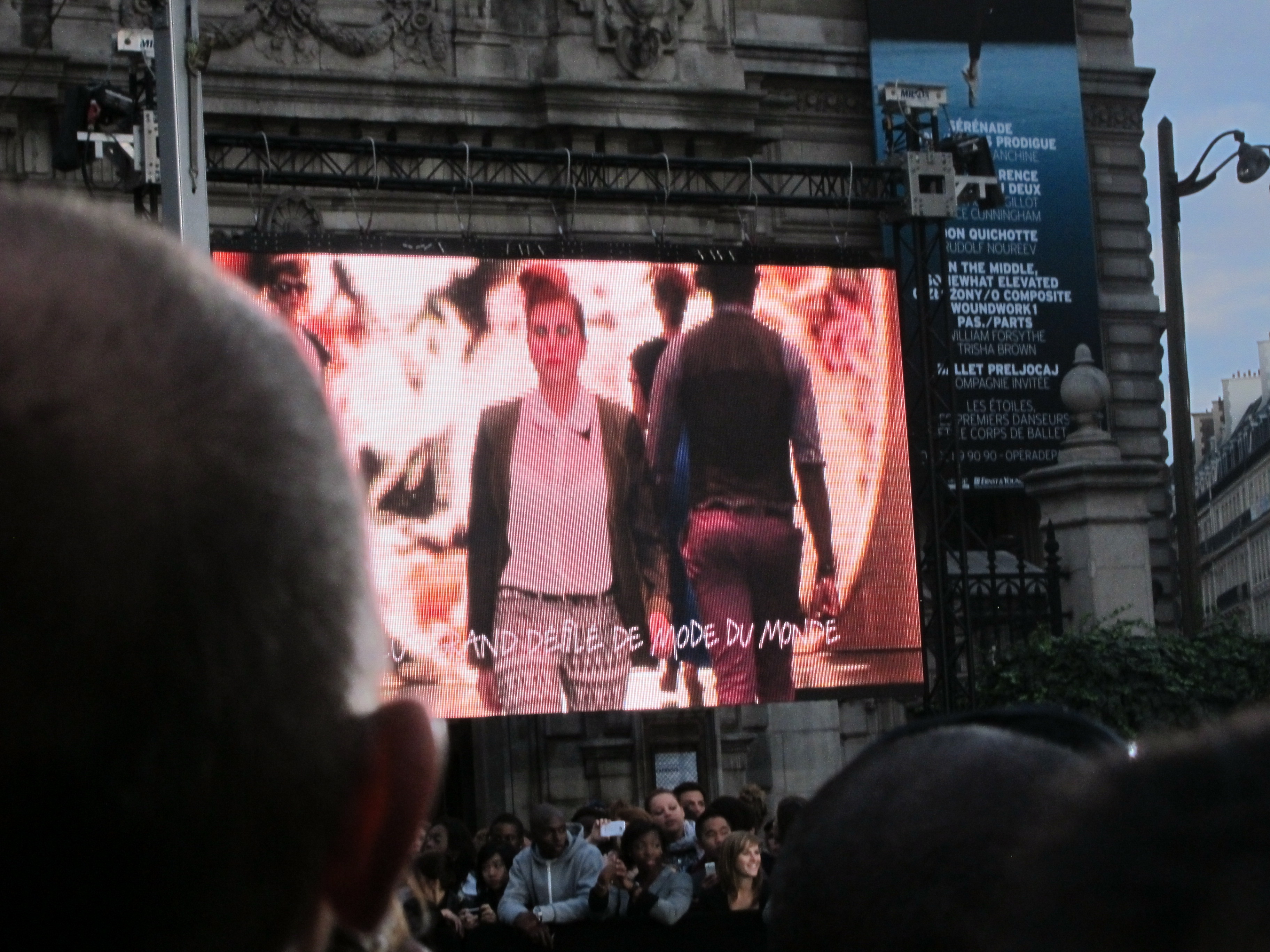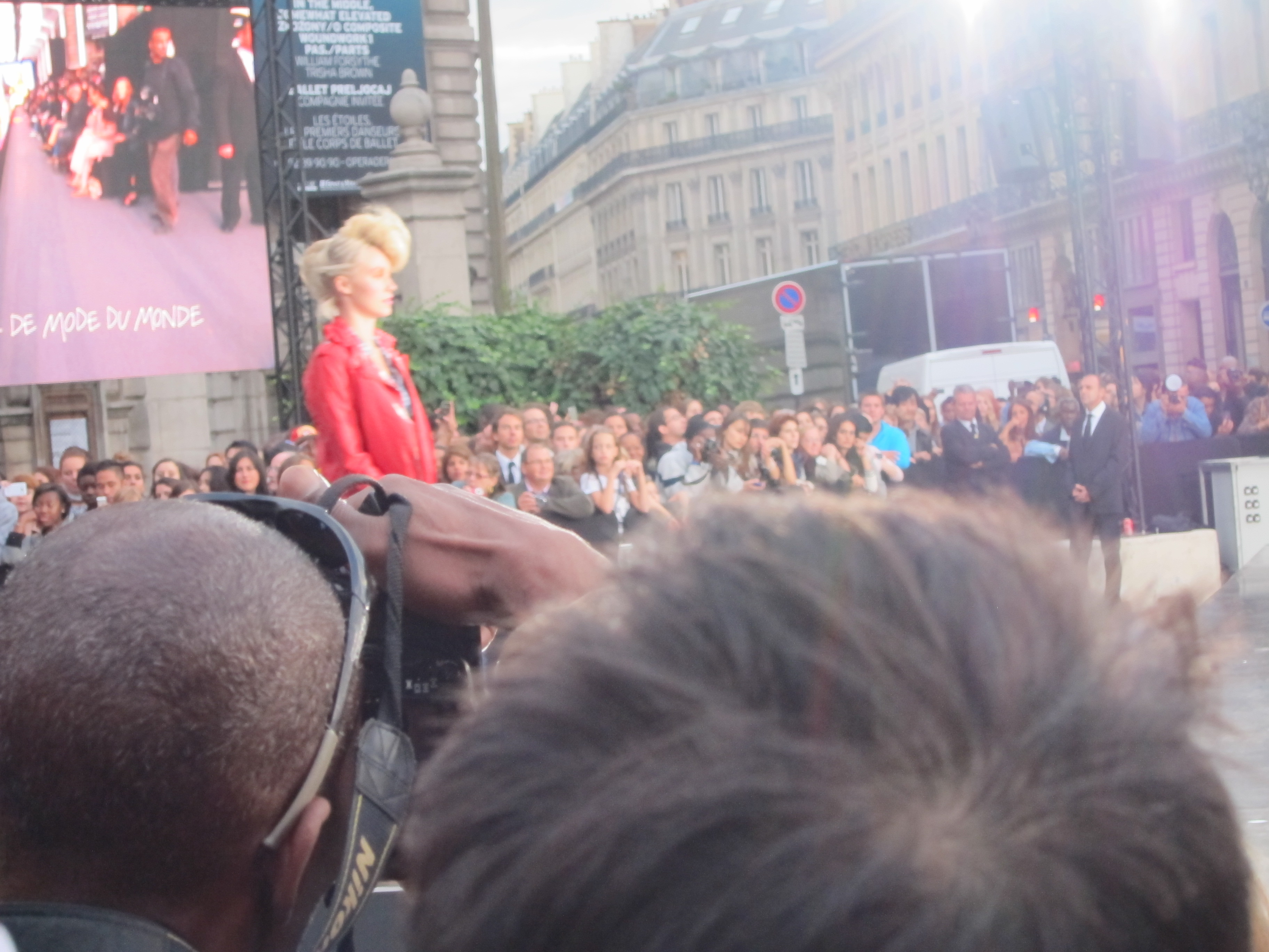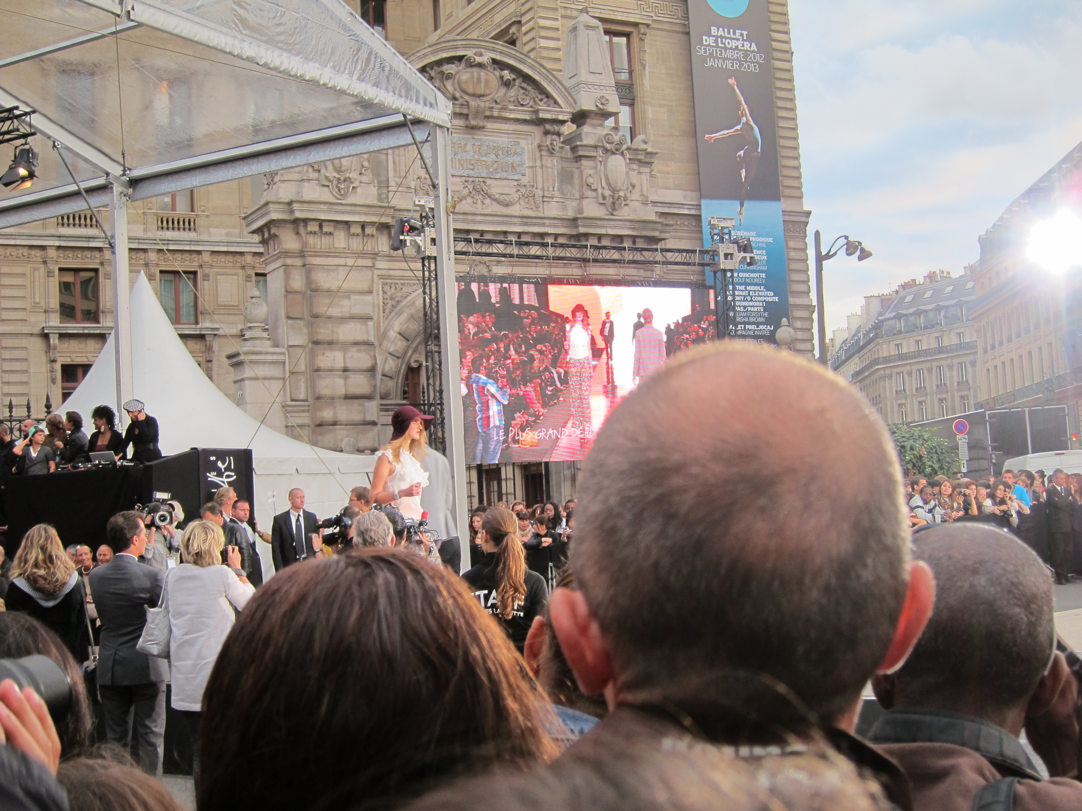 Several weeks ago the Paris department store Galeries Lafayette held its annual “World’s Largest Fashion Show” and this year I actually made the effort to go watch. And it really was an effort, as I had spent the afternoon on a walking tour and really wanted to go put on my fuzzy Ugg slippers and drink a cup of tea. Instead, I walked (some more) from the tour’s ending point to the site of the fashion show, which was on the street in front of Galeries Lafayette. AND I had to arrive an hour before the 7:00 PM starting time if I wanted to have a decent view of the runway. Notice I didn’t say “if I wanted to get a good seat for the show”- no seats for this event, unless you were one of the invited guests sitting in the bleachers that lined the catwalk before it came into view of us (standing) commoners. Fortunately, it wasn’t too hot or too cold, and the rain that had threatened earlier in the day did not appear.