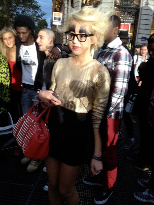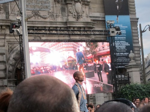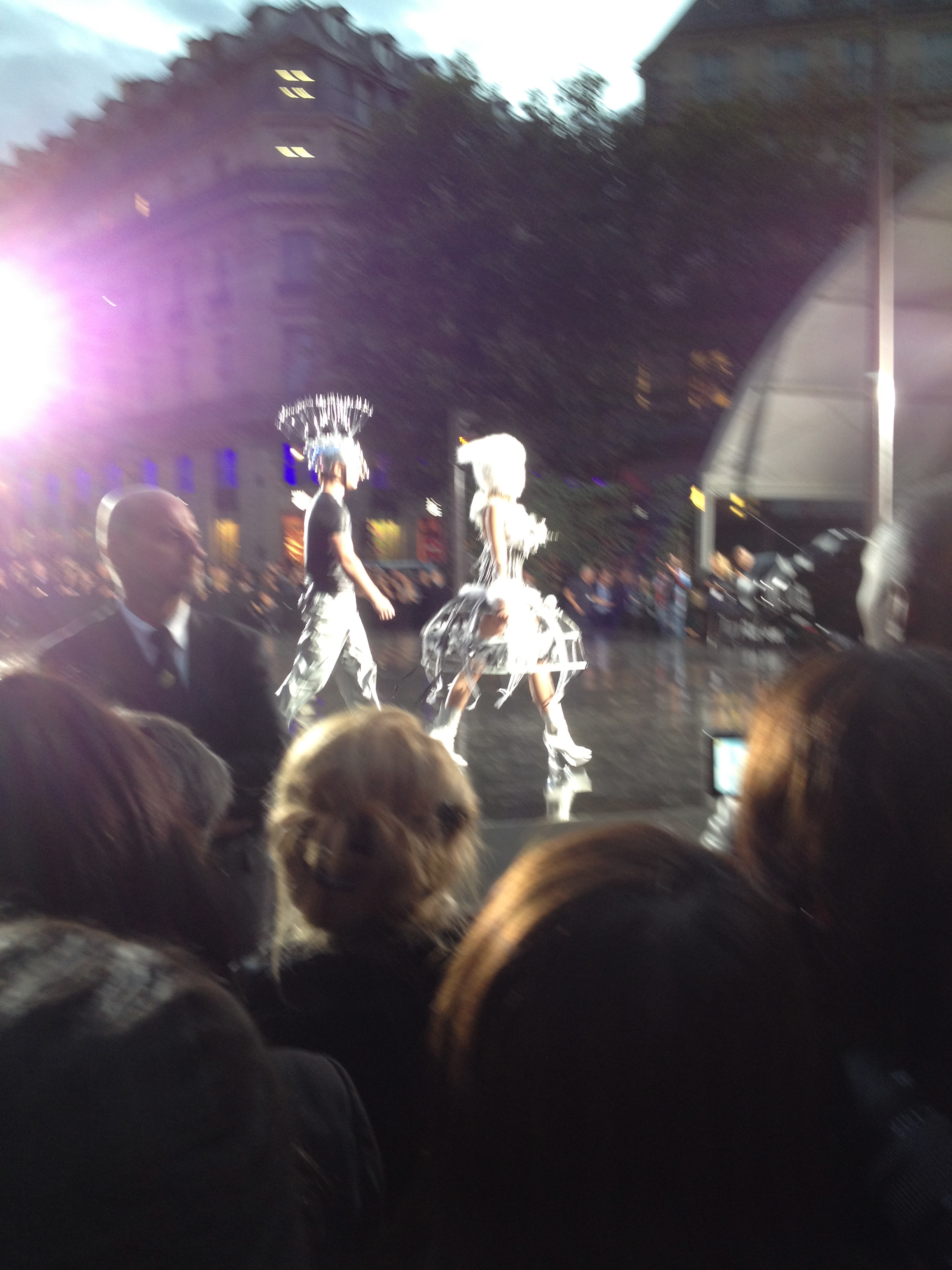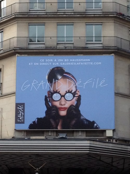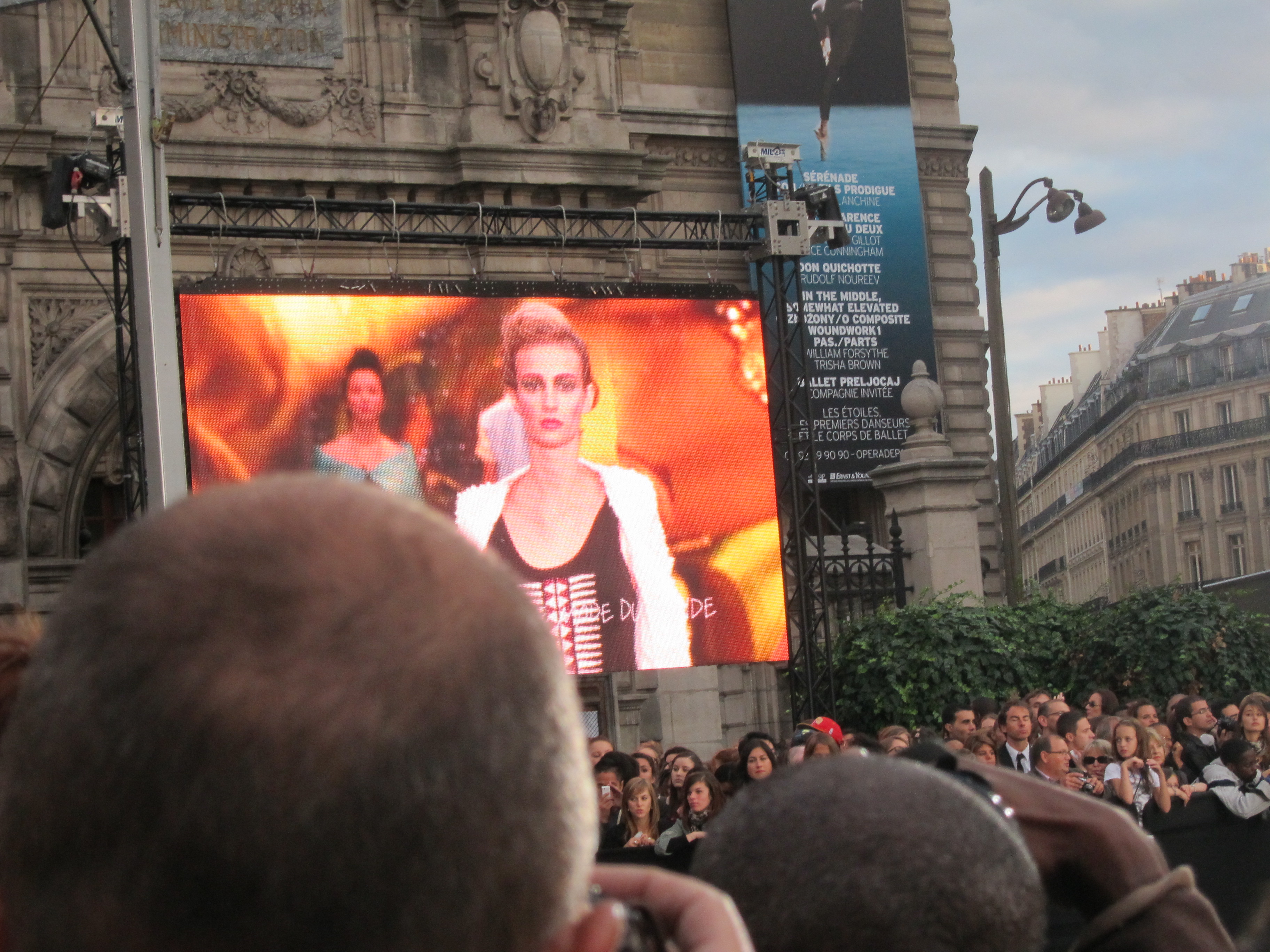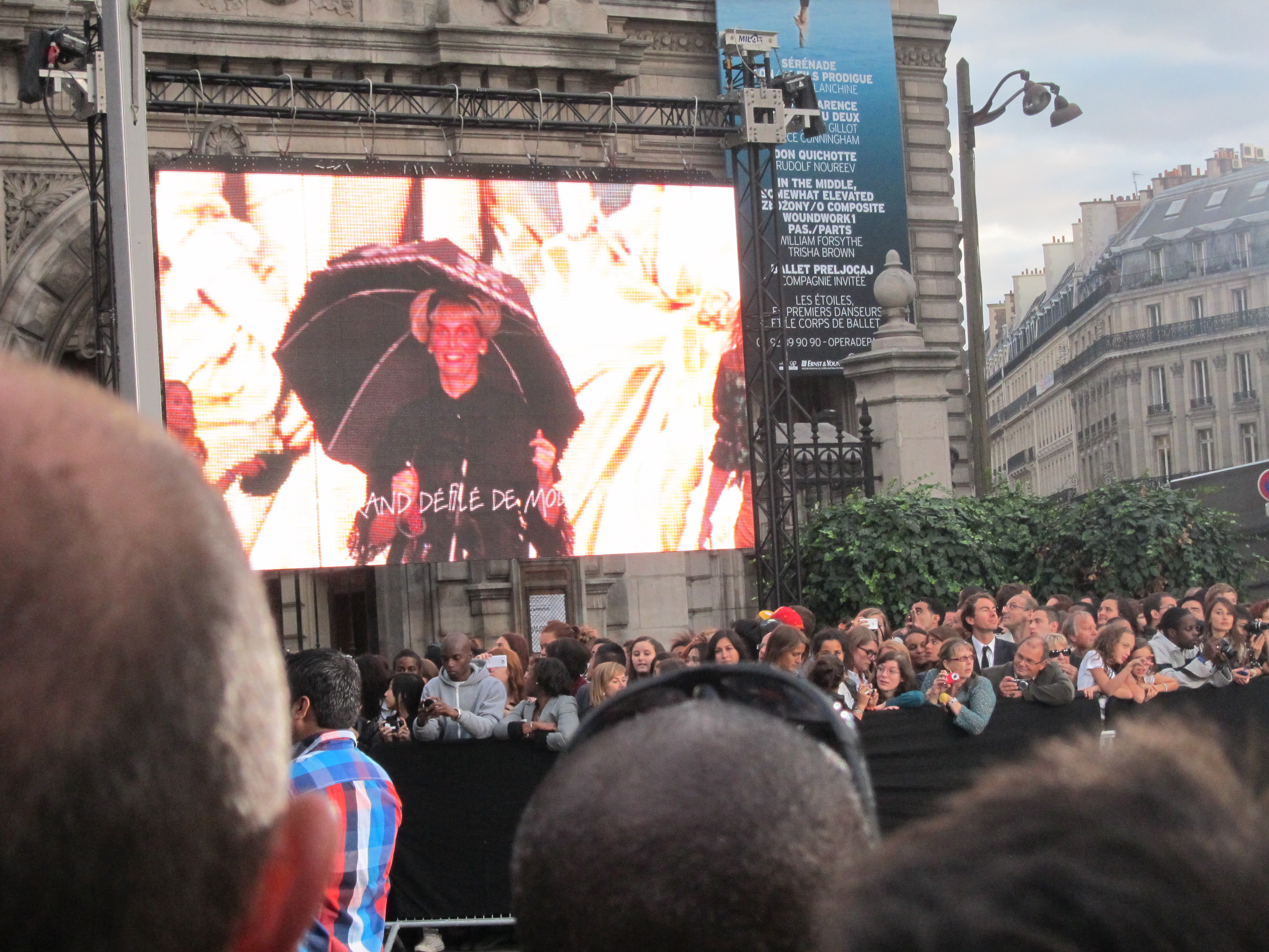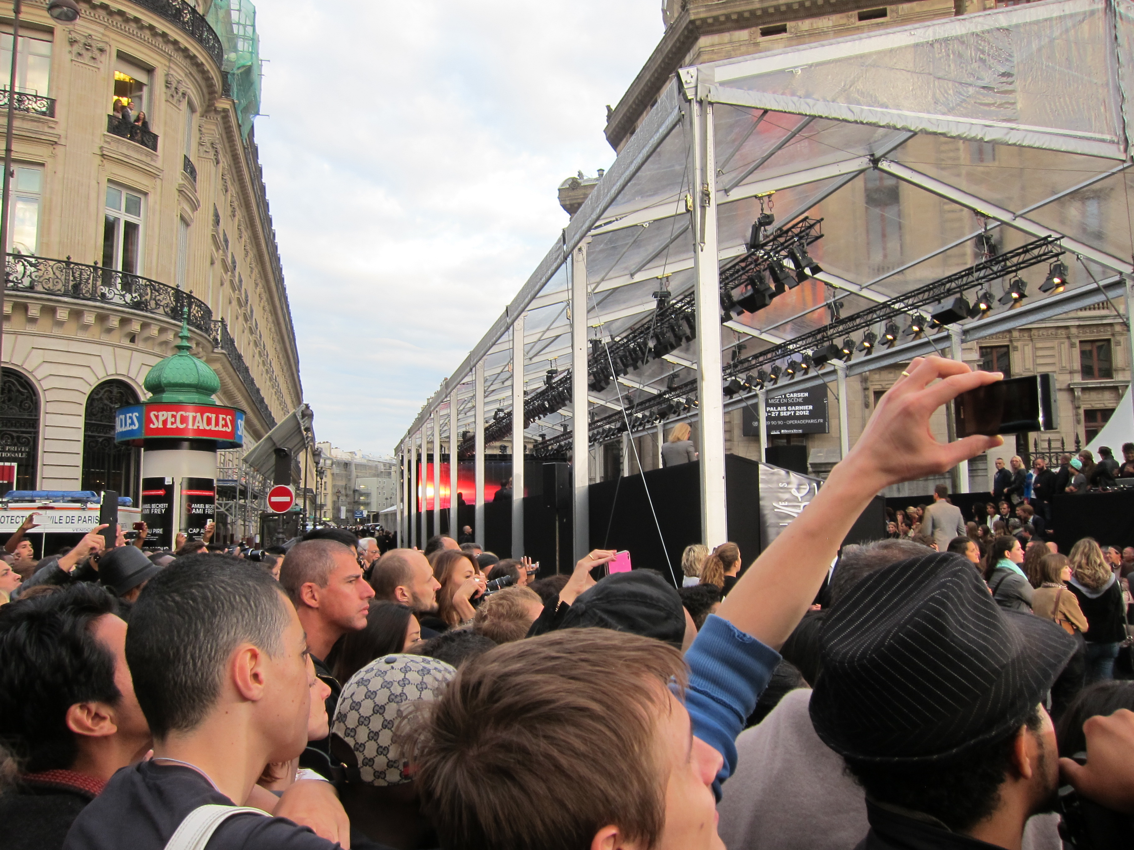 Several weeks ago the Paris department store Galeries Lafayette held its annual “World’s Largest Fashion Show” and this year I actually made the effort to go watch. And it really was an effort, as I had spent the afternoon on a walking tour and really wanted to go put on my fuzzy Ugg slippers and drink a cup of tea. Instead, I walked (some more) from the tour’s ending point to the site of the fashion show, which was on the street in front of Galeries Lafayette. AND I had to arrive an hour before the 7:00 PM starting time if I wanted to have a decent view of the runway. Notice I didn’t say “if I wanted to get a good seat for the show”- no seats for this event, unless you were one of the invited guests sitting in the bleachers that lined the catwalk before it came into view of us (standing) commoners. Fortunately, it wasn’t too hot or too cold, and the rain that had threatened earlier in the day did not appear.