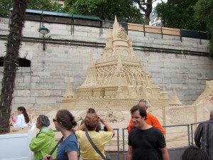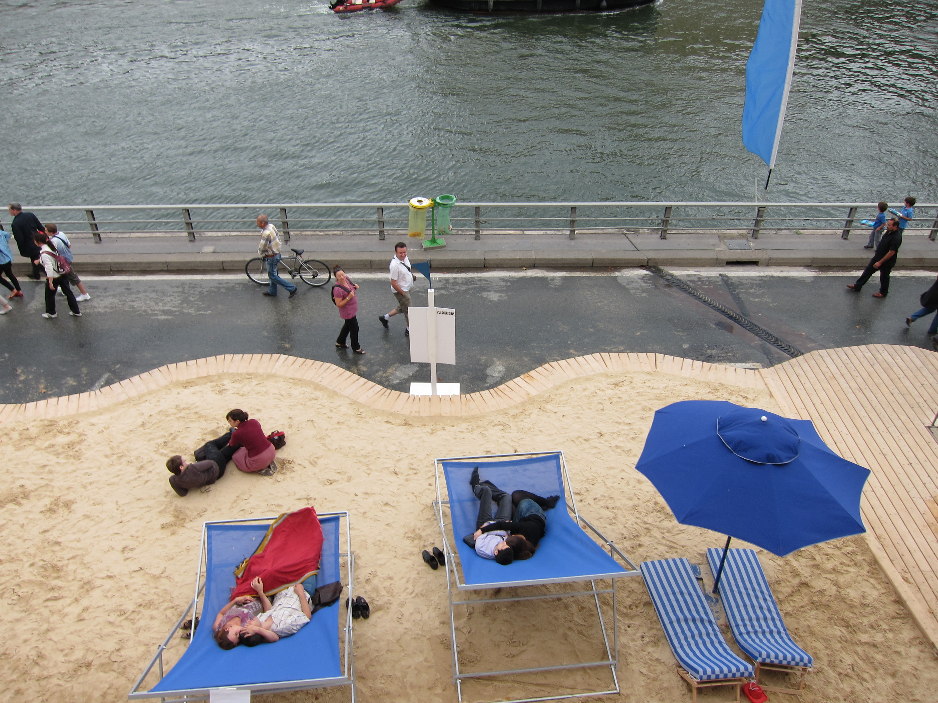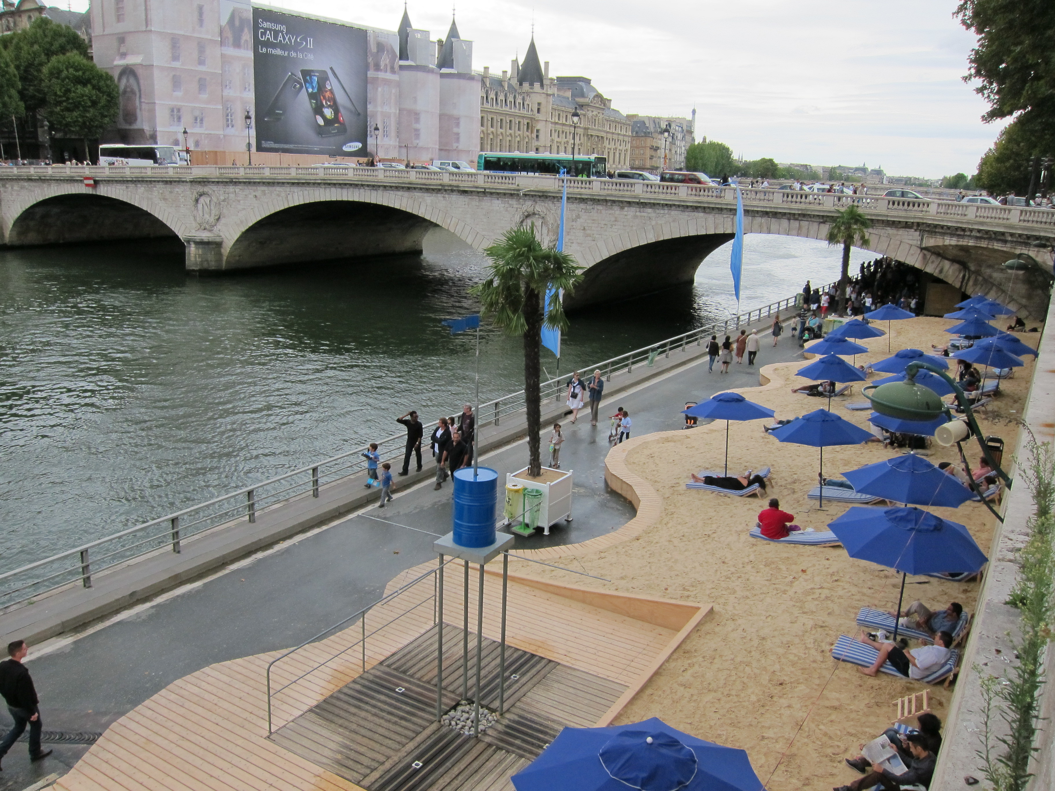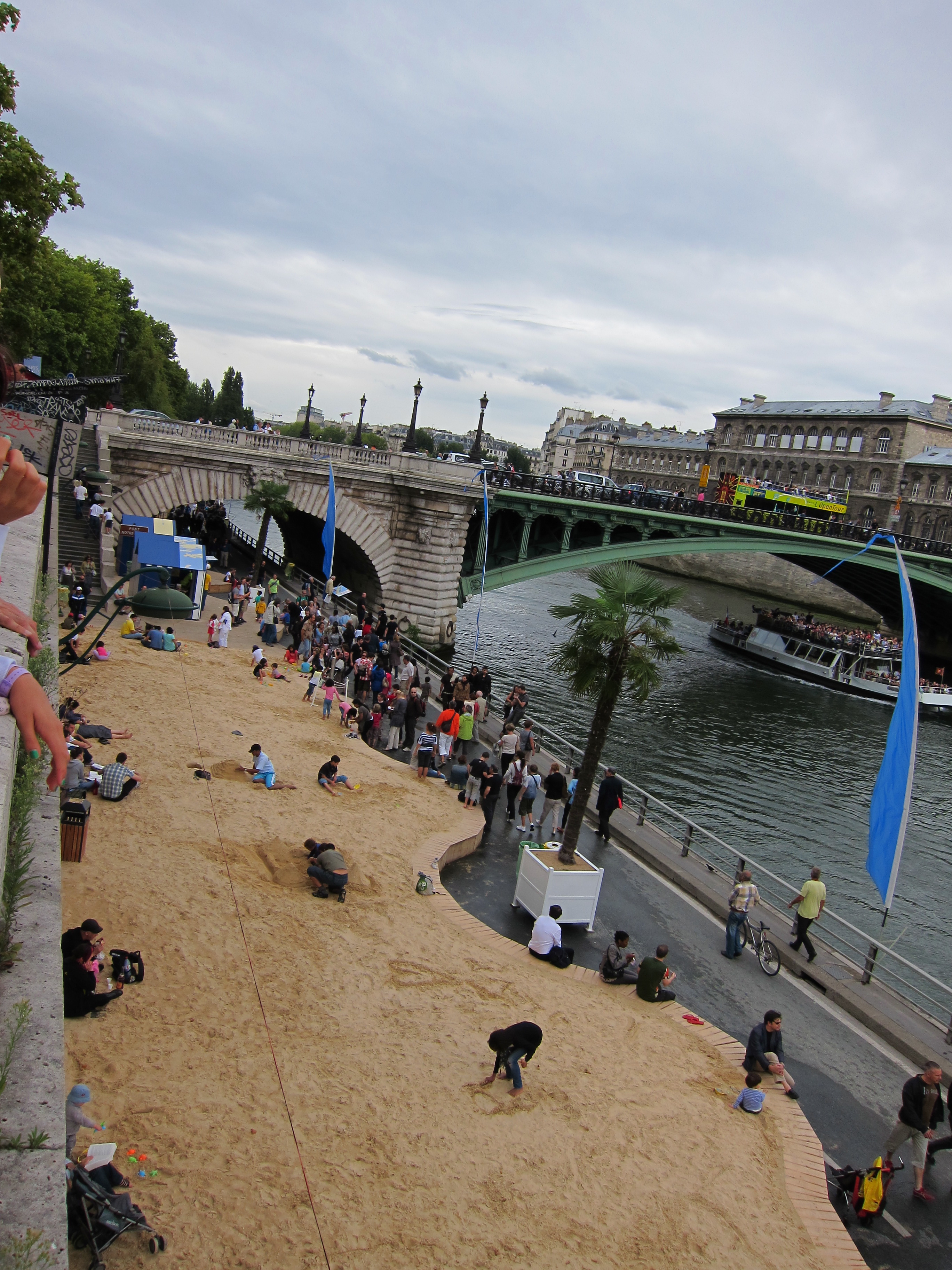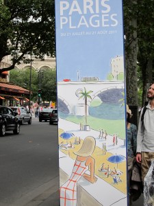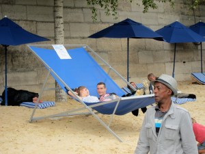 Determined not to sit here and mope, I bought a few groceries and then set out to see Paris Plages, which I had read about but never seen. For several weeks each August, the banks of the Seine are transformed into a sandy beach, complete with palm trees and deck chairs. It’s a nice diversion for the few Parisians who don’t get to flee the city for the month, and for those tourists lucky enough to be here for it. AND it’s completely free!
