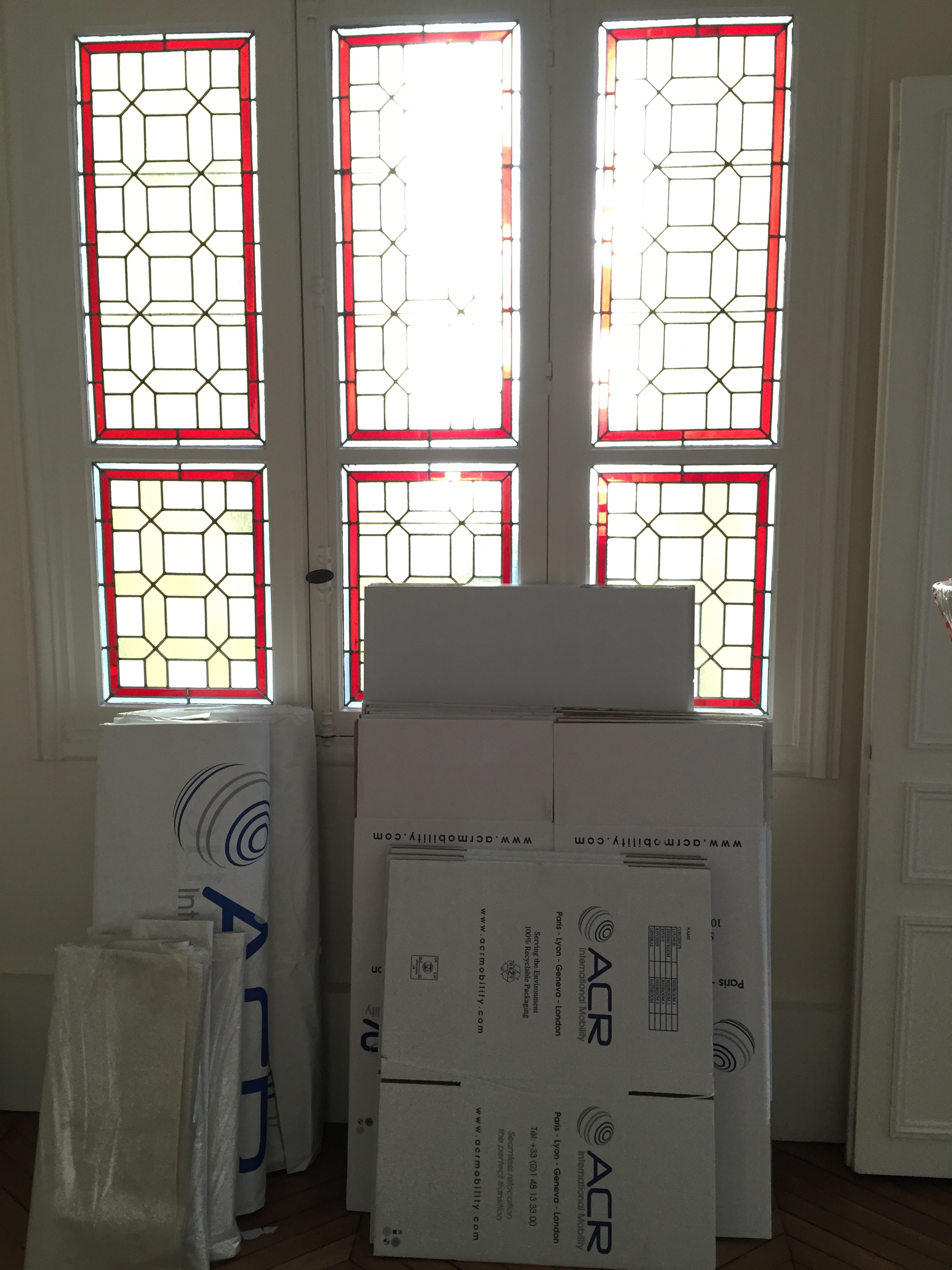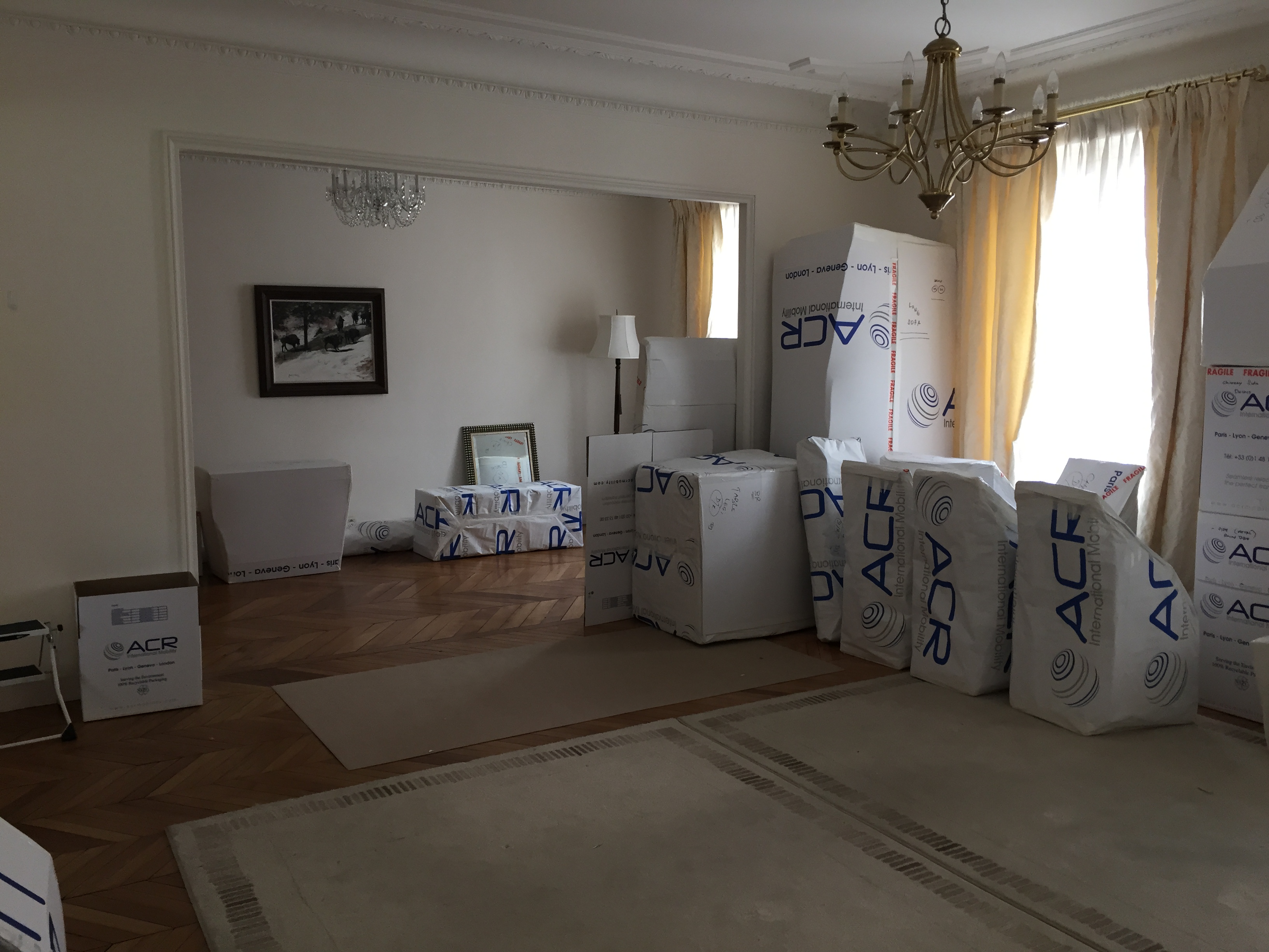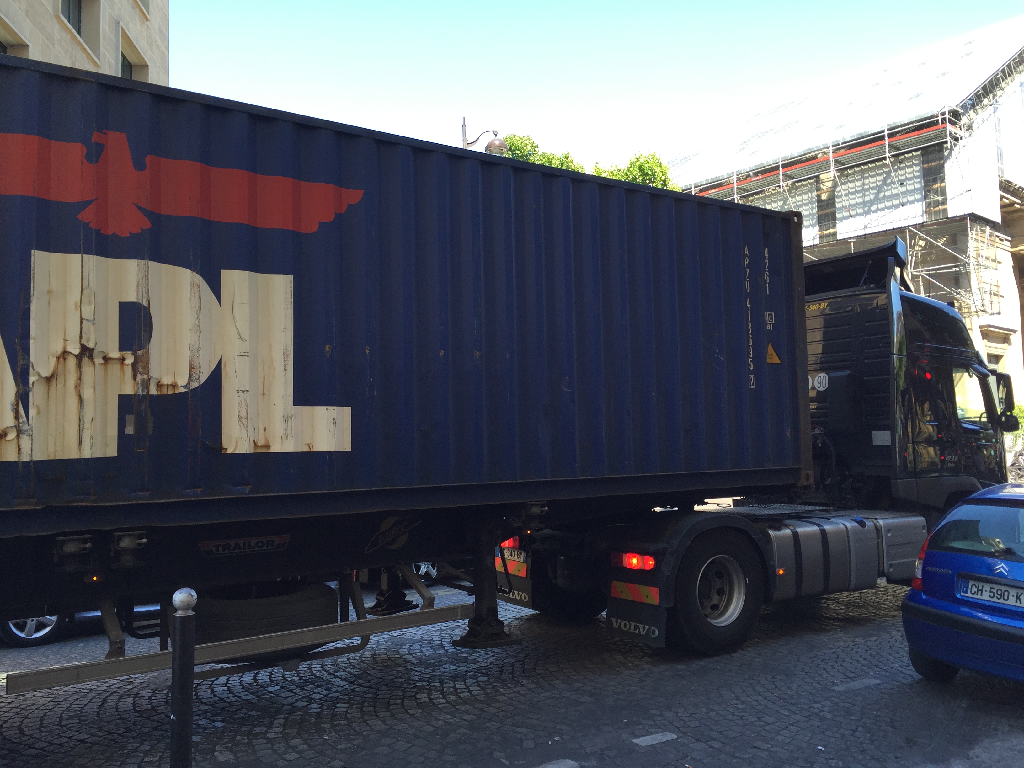 A fabulous crew of four or five men arrived at the apartment bright and early on a Thursday morning. They were so friendly and so professional that I really couldn’t resent them too much for turning my dream Paris apartment into a maze of boxes and packing paper. It took them a day and a half to box everything up (including the furniture) and a half day to get it all into the shipping container. Oh yeah- and over an hour to get the enormous truck onto our street and parked in front of our building.